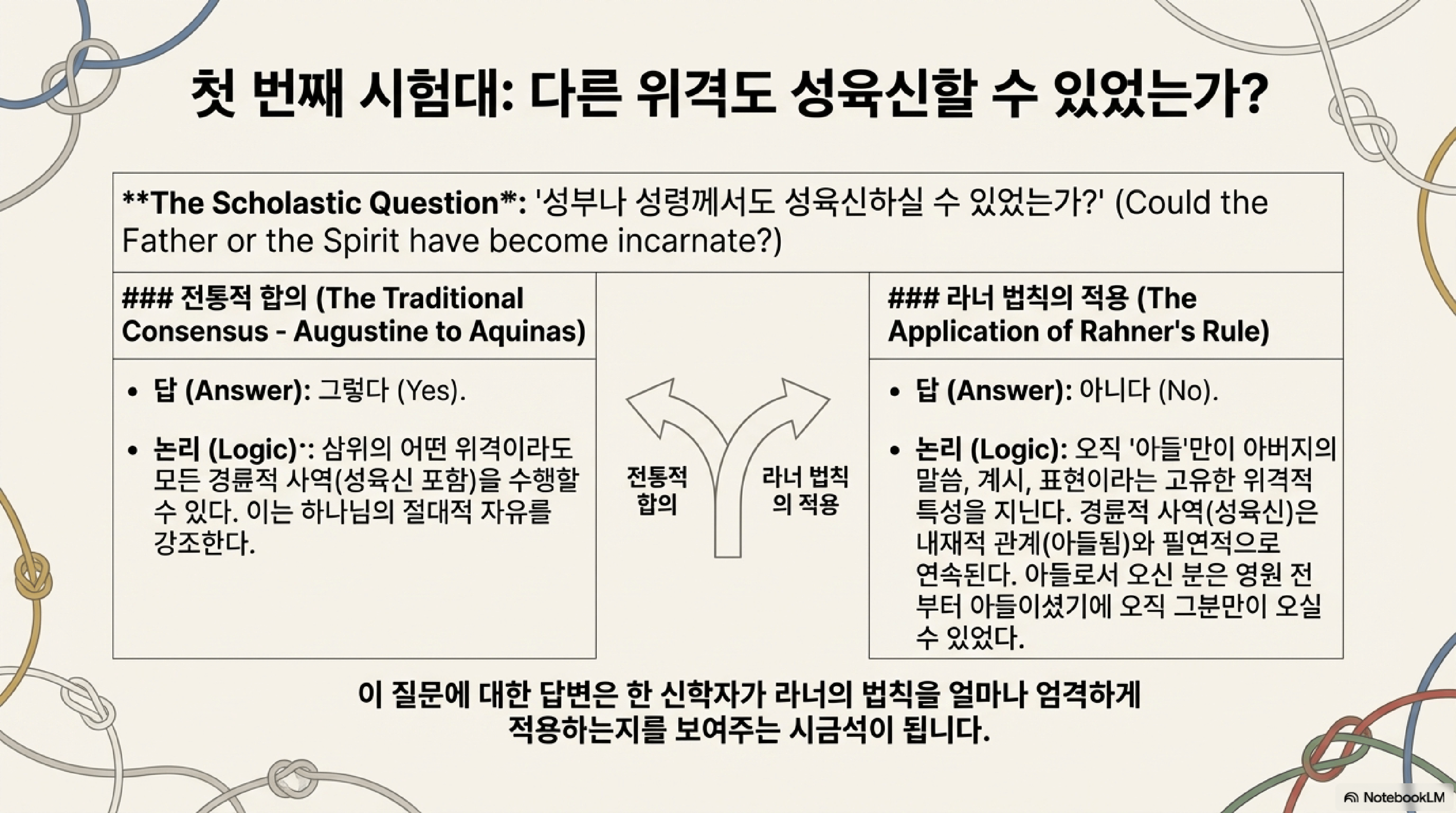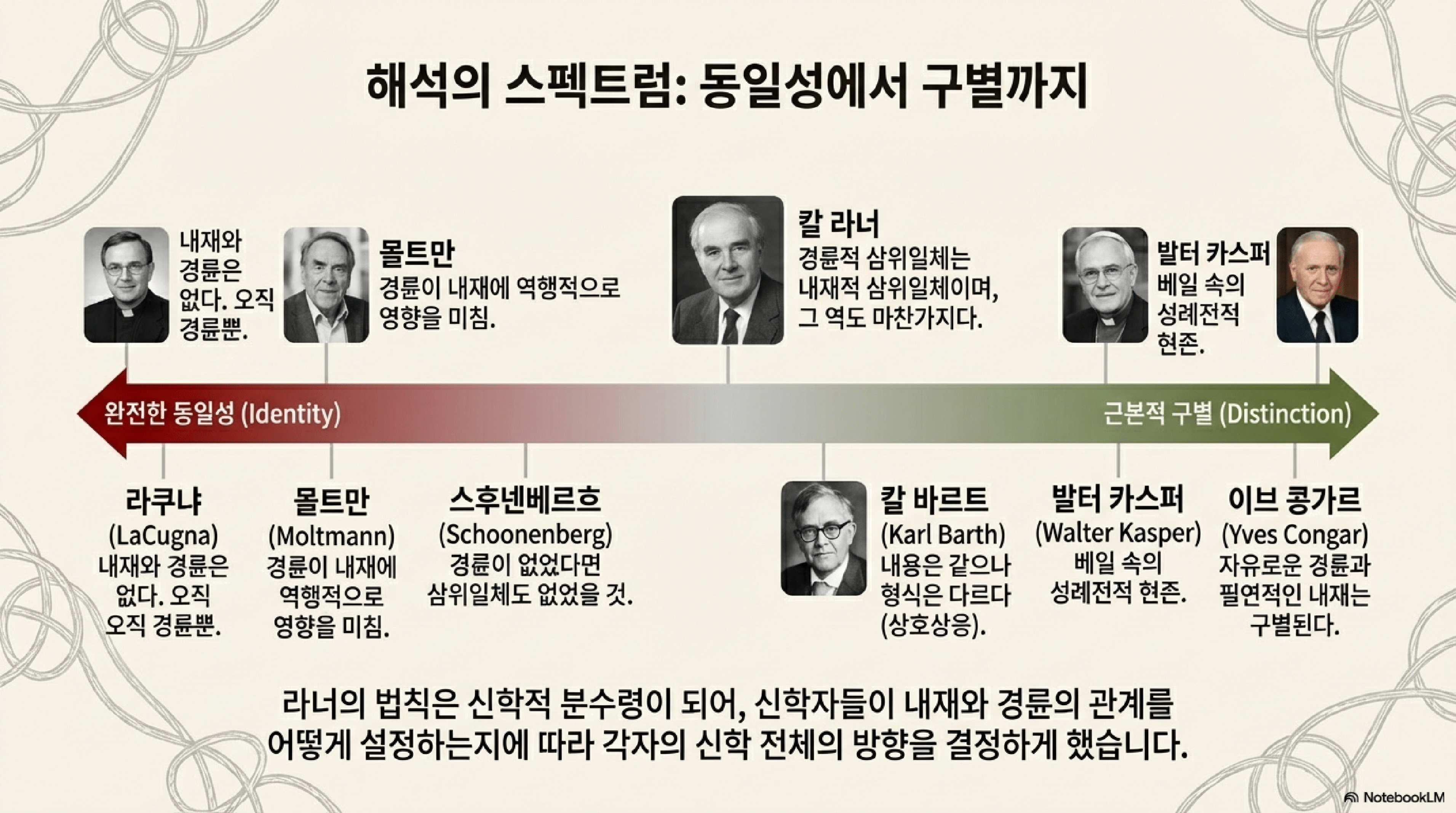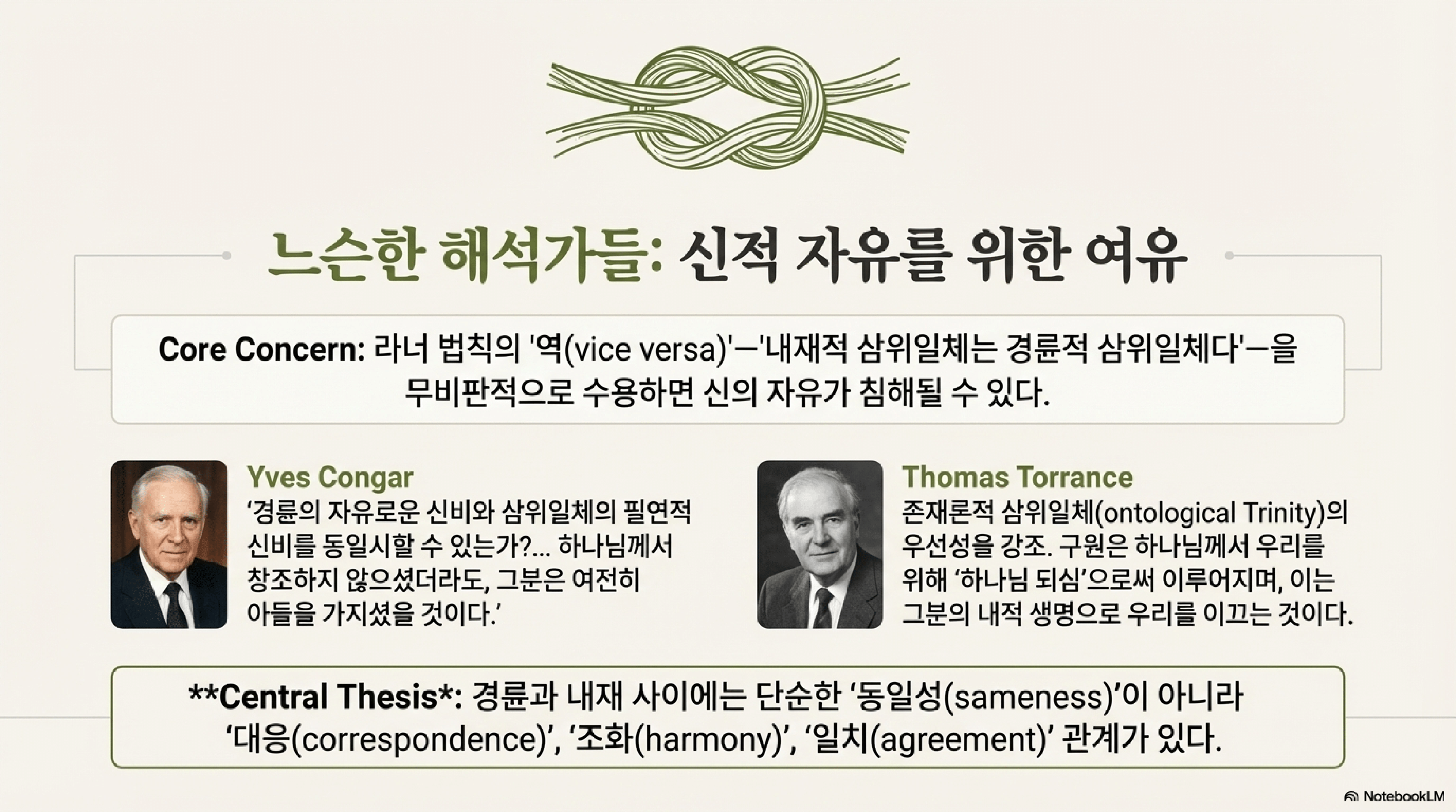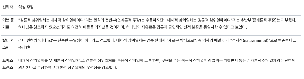 - 인식론적 통로: 경륜적 삼위일체는 내재적 삼위일체를 알 수 있는 유일한 '인식론적 통로'(epistemological gateway)이다. 우리는 계시 속에서 활동하시는 하나님을 통해서만 그분의 영원한 내적 존재를 알 수 있다.