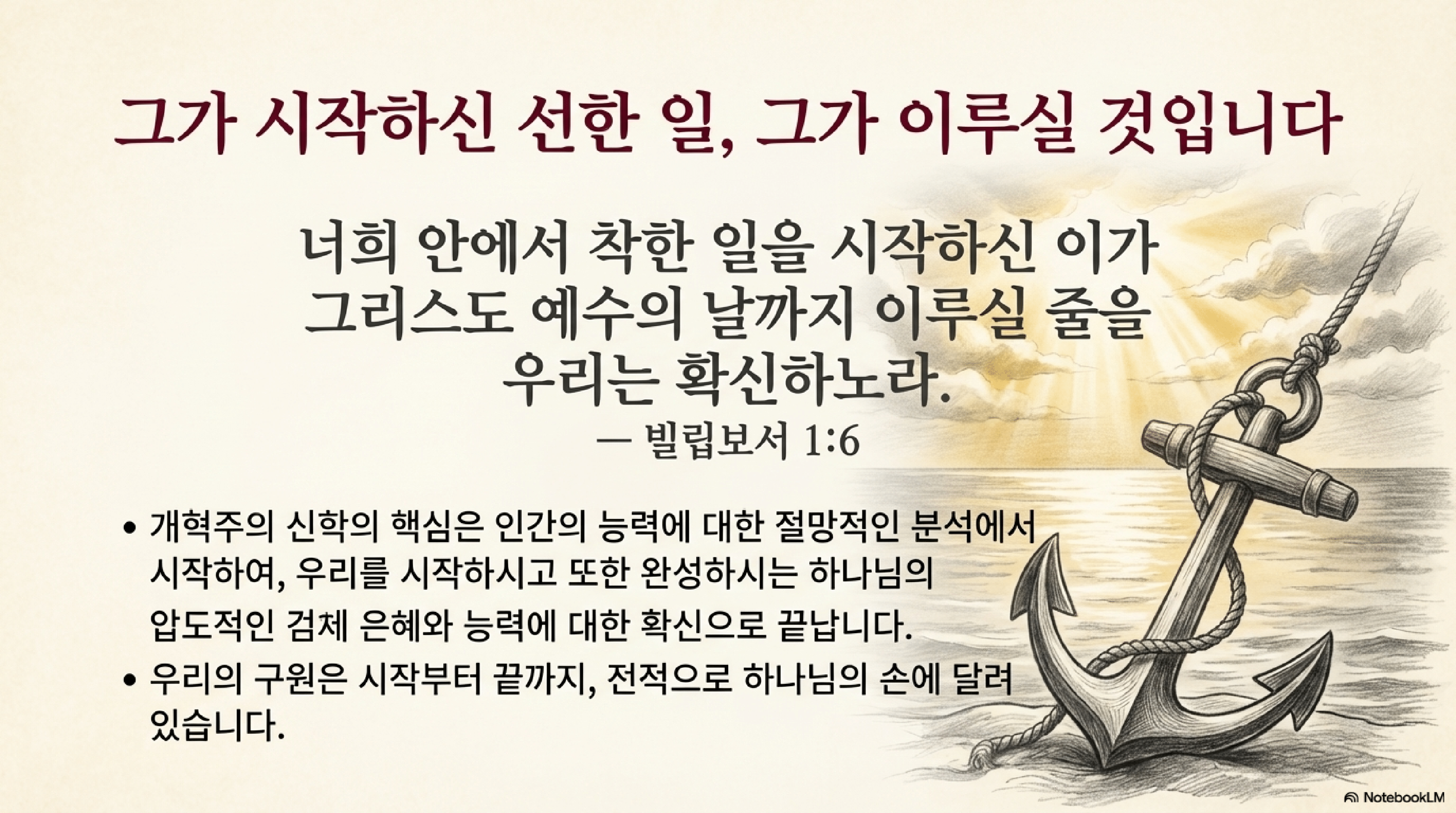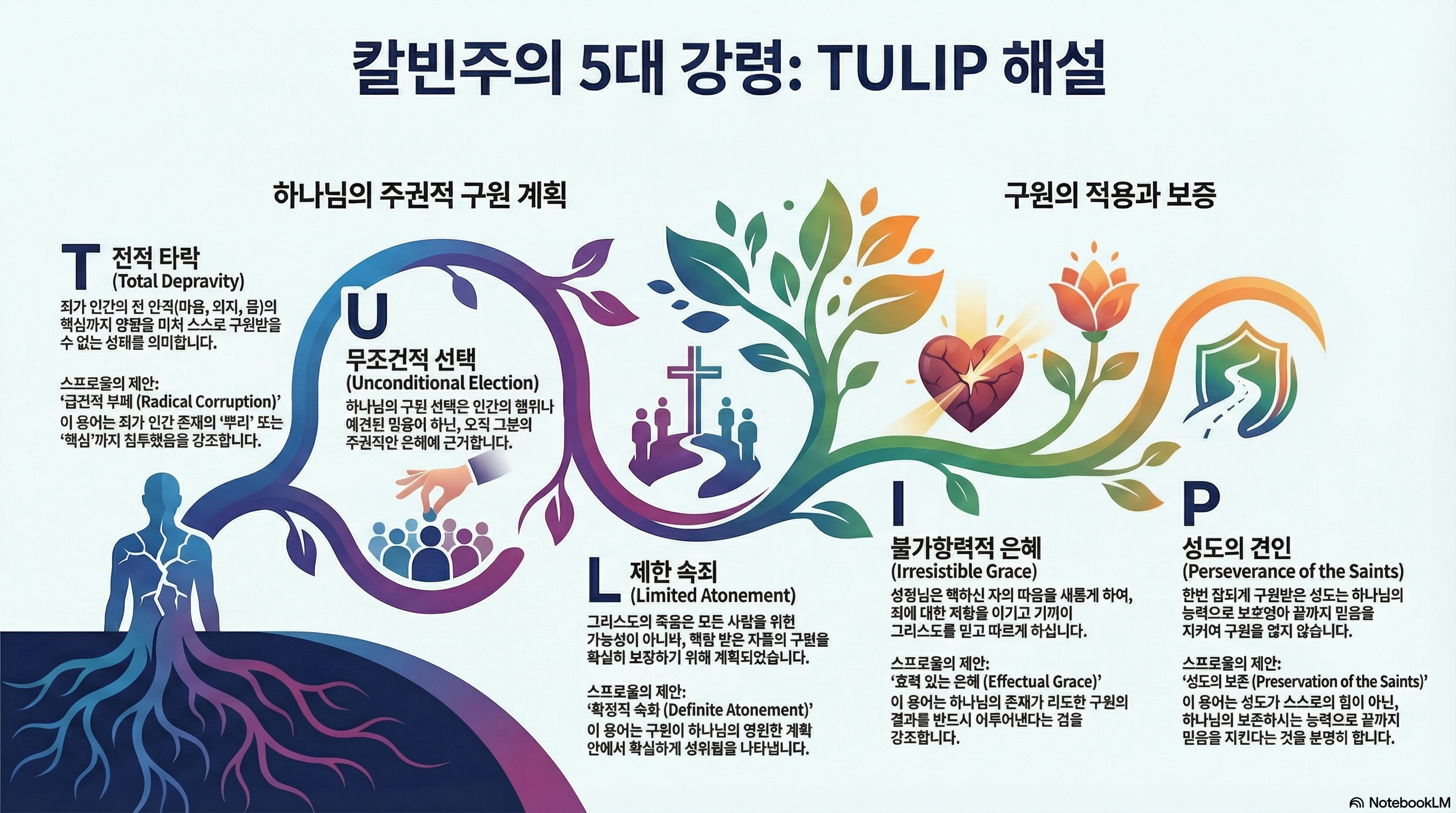 결론적으로, 스프로울은 TULIP 교리를 통해 구원이 전적으로 하나님의 주권적인 은혜의 사역임을 강조한다. 인간의 역할이 배제되는 것이 아니라, 구원의 모든 과정에서 시작과 성취의 주체가 하나님이심을 명확히 하는 것이 이 교리들의 핵심이다.1. 서론: TULIP의 역사적 배경