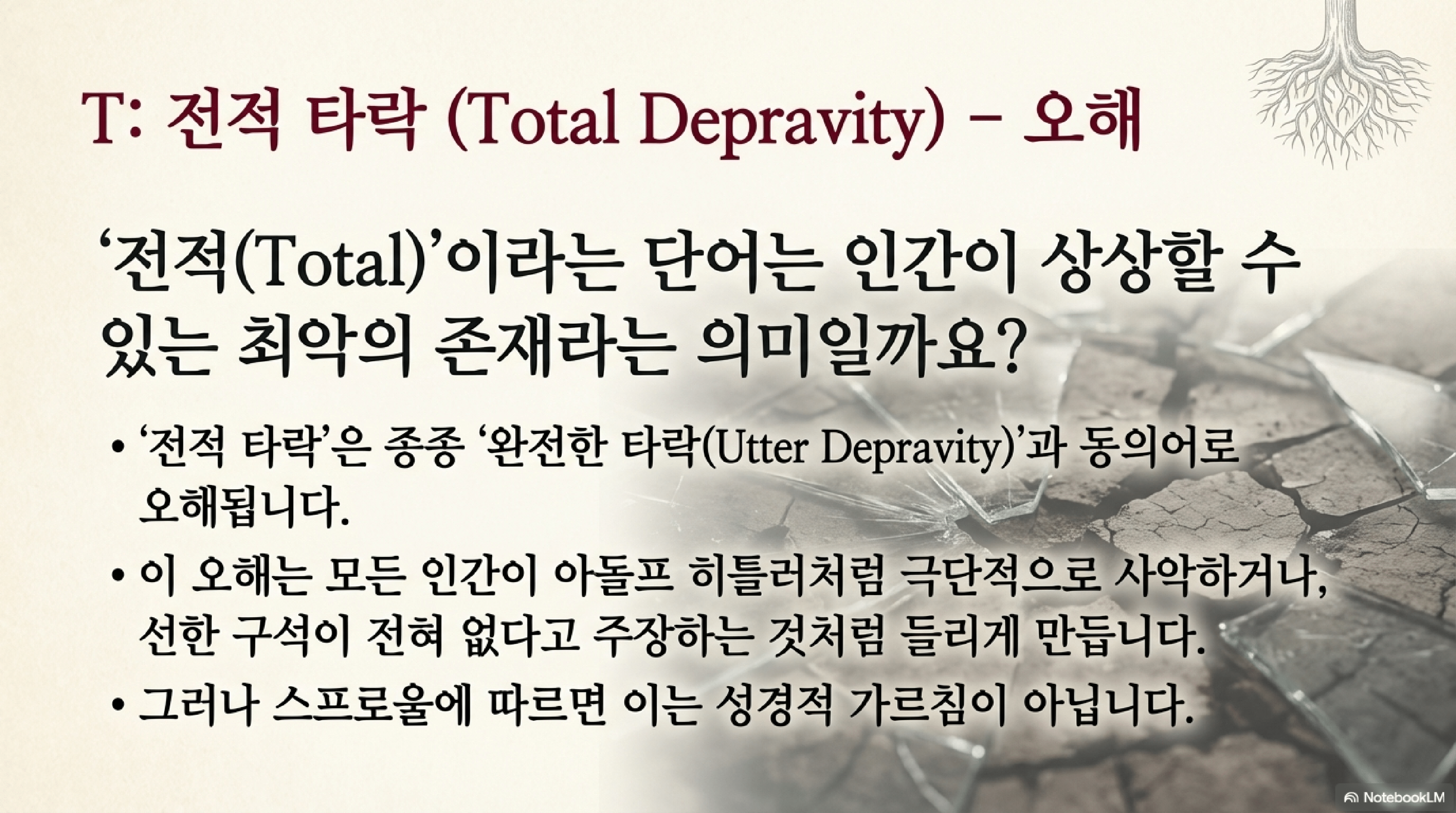- 전적 타락 (Total Depravity): 인간은 본성상 죄로 인해 전인격(지성, 의지, 감정, 육체)이 오염되어 스스로를 구원할 능력이 전혀 없다는 교리이다. 스프로울은 이를 '완전한 타락'이 아닌, 죄가 인간 존재의 '뿌리'까지 영향을 미친다는 의미에서 **'근본적 부패(Radical Corruption)'**로 부르기를 제안한다.