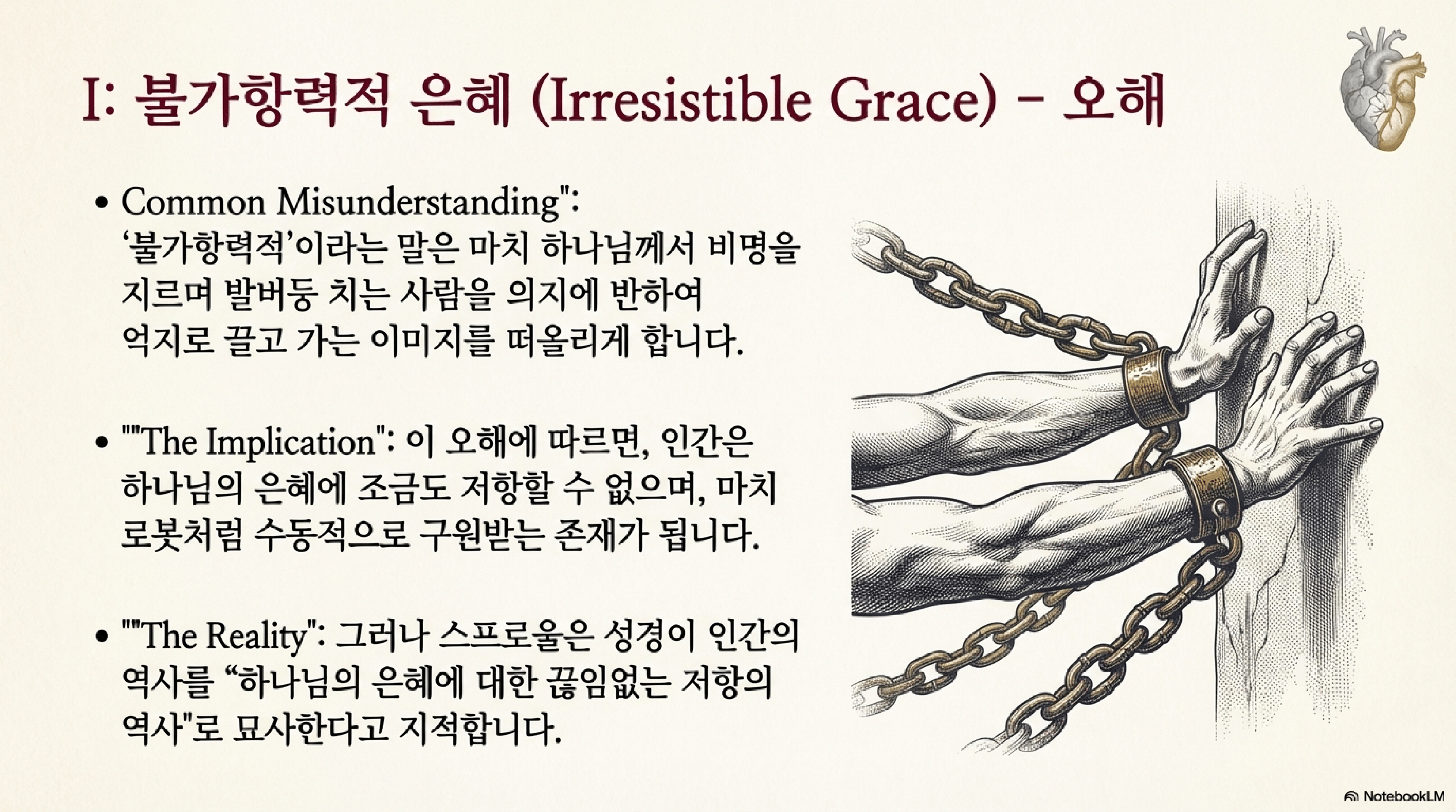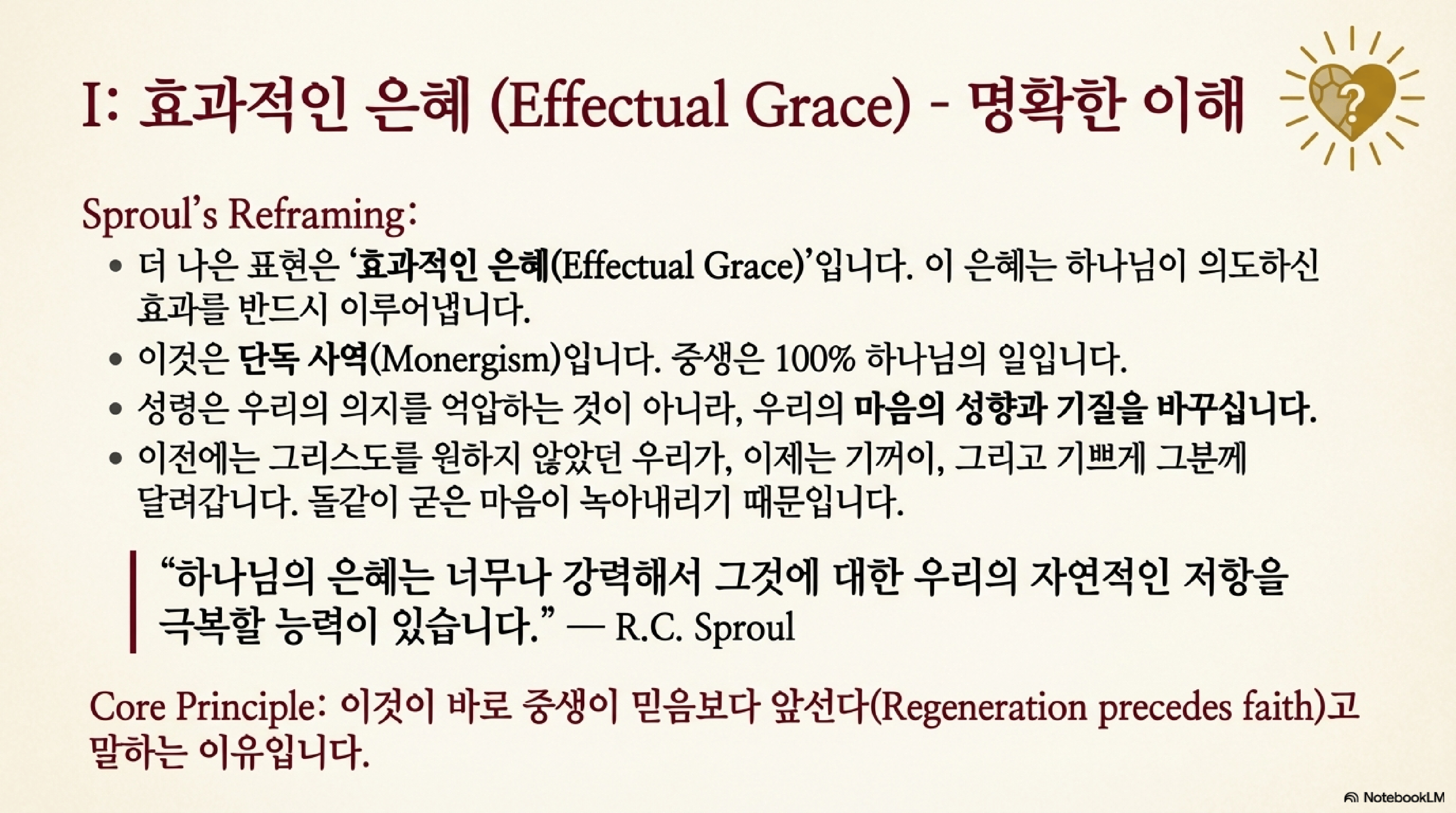 - 대체 용어: 효력 있는 은혜 (Effectual Grace): 스프로울은 '불가항력적'이라는 말 대신, 하나님의 은혜가 그분이 의도하신 바를 효과적으로 이루어낸다는 의미에서 '효력 있는 은혜'라는 용어를 선호한다.