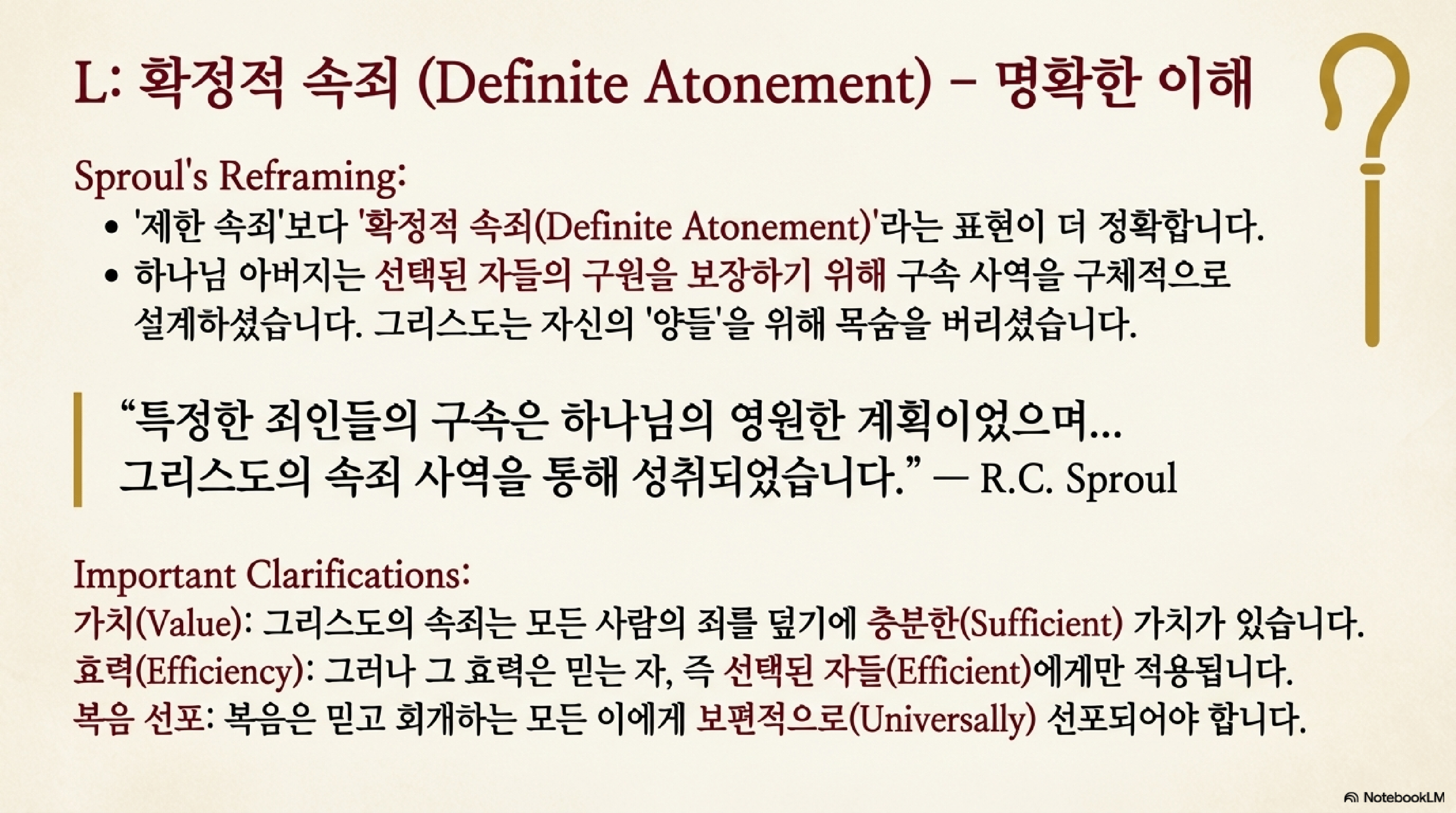 - 대체 용어: 확정적 속죄 (Definite Atonement): 스프로울은 '제한'이라는 단어가 부정적인 뉘앙스를 풍기므로, 속죄 사역이 하나님의 구원 계획을 '확실하고 명확하게' 성취했다는 의미를 담은 '확정적 속죄'라는 용어를 선호한다.