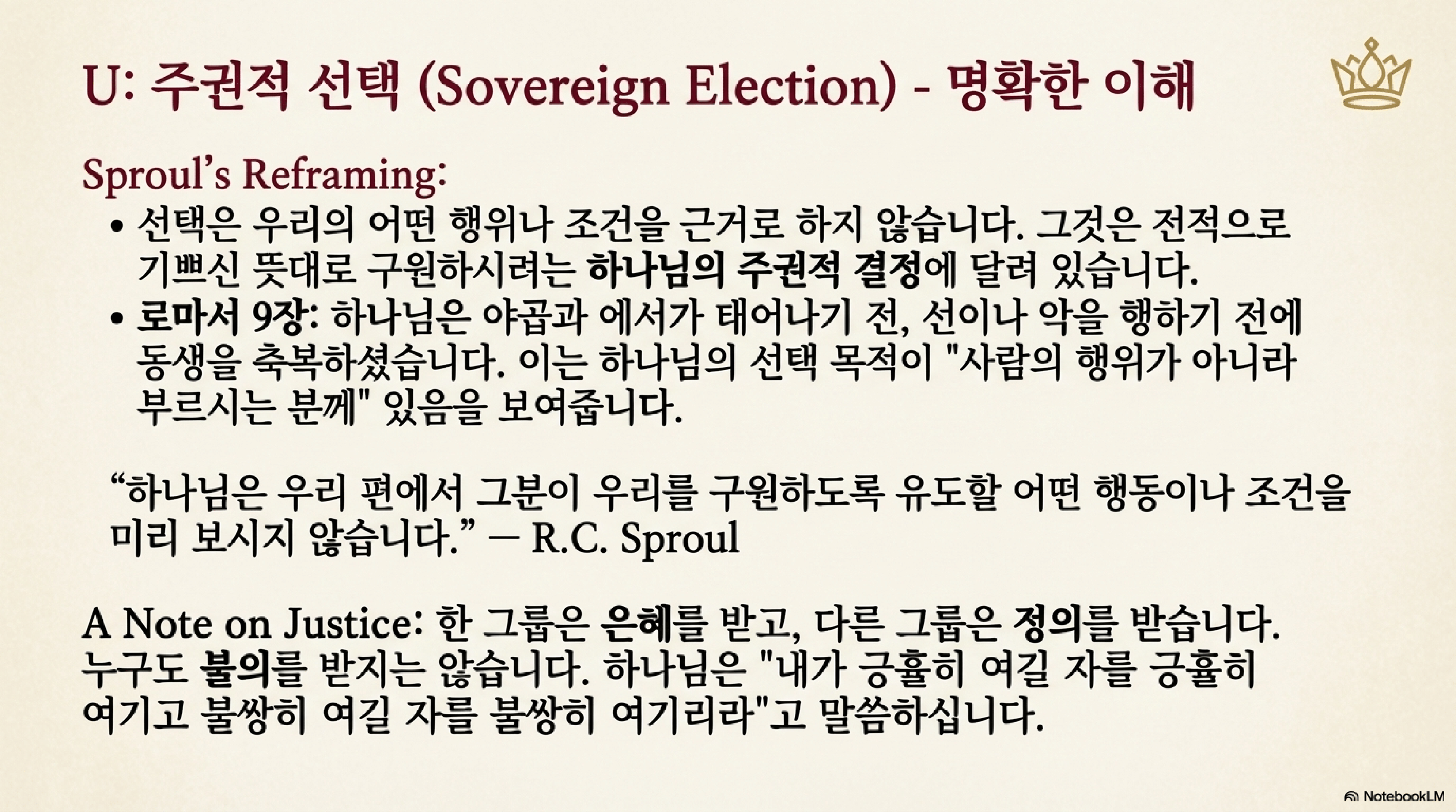 - 대체 용어: 주권적 선택 (Sovereign Election): 스프로울은 '무조건적'이라는 용어 대신 '주권적 선택'을 선호한다. 이는 선택의 주체가 전적으로 하나님이심을 강조한다. 이는 불공평한가? 바울의 대답은 단호하다. 어떤 이들은 은혜를 받고, 다른 이들은 정의의 심판을 받는다. 누구도 불의를 겪지는 않는다. 하나님은 "내가 긍휼히 여길 자를 긍휼히 여기고 불쌍히 여길 자를 불쌍히 여기리라"(롬 9:15)고 말씀하시며, 긍휼을 베푸실 신적인 권리가 당신에게 있음을 선언하신다.