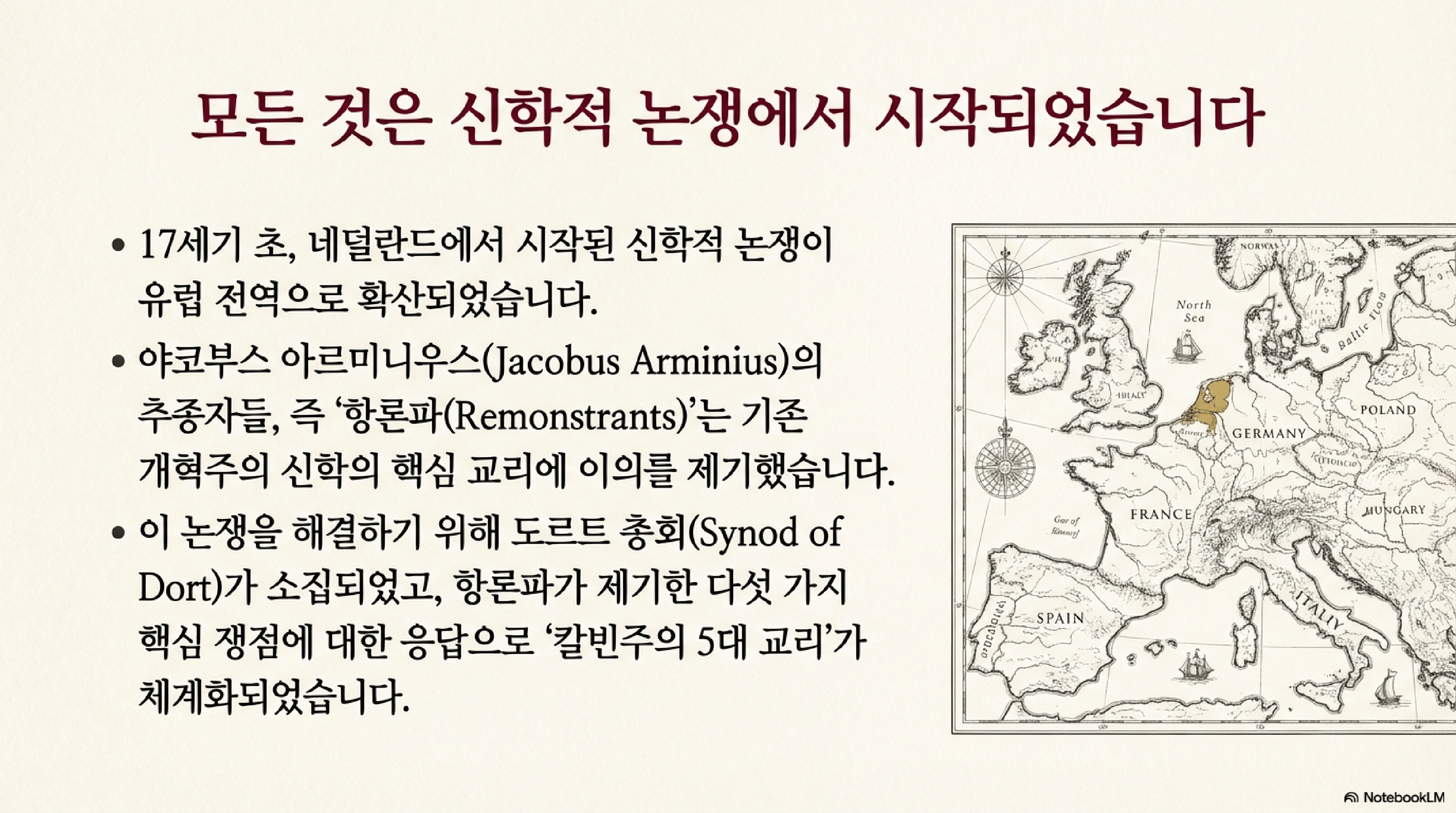 '칼빈주의 5대 교리'는 1618-1619년에 네덜란드에서 열린 도르트 총회(Synod of Dort)에서 비롯되었다. 이 총회는 당시 네덜란드 개혁교회 내에서 일어난 신학적 논쟁을 해결하기 위해 소집되었다. 논쟁의 중심에는 칼빈주의의 예정론과 선택 교리에 의문을 제기한 야코부스 아르미니우스(Jacobus Arminius)의 추종자들이 있었다. 이들은 '항의자들(Remonstrants)'이라 불렸으며, 자신들의 신학적 입장을 담은 다섯 가지 조항을 제시하며 기존의 개혁주의 신학에 이의를 제기했다.