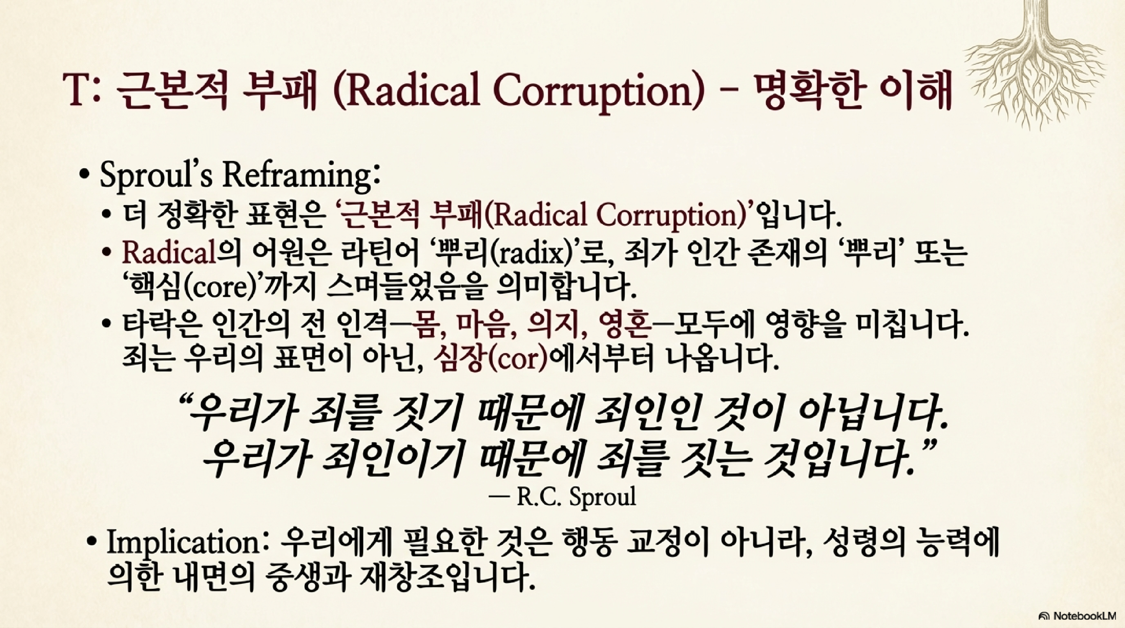 - 대체 용어: 근본적 부패 (Radical Corruption): 스프로울은 '전적 타락'이라는 용어가 오해를 불러일으킬 수 있으므로 '근본적 부패'라는 용어를 선호한다. '근본적(radical)'이라는 단어의 어원은 '뿌리(radix)'로, 이는 죄가 인간 존재의 표면이 아닌 가장 깊은 핵심(core), 즉 마음(cor)에서부터 비롯됨을 의미한다.