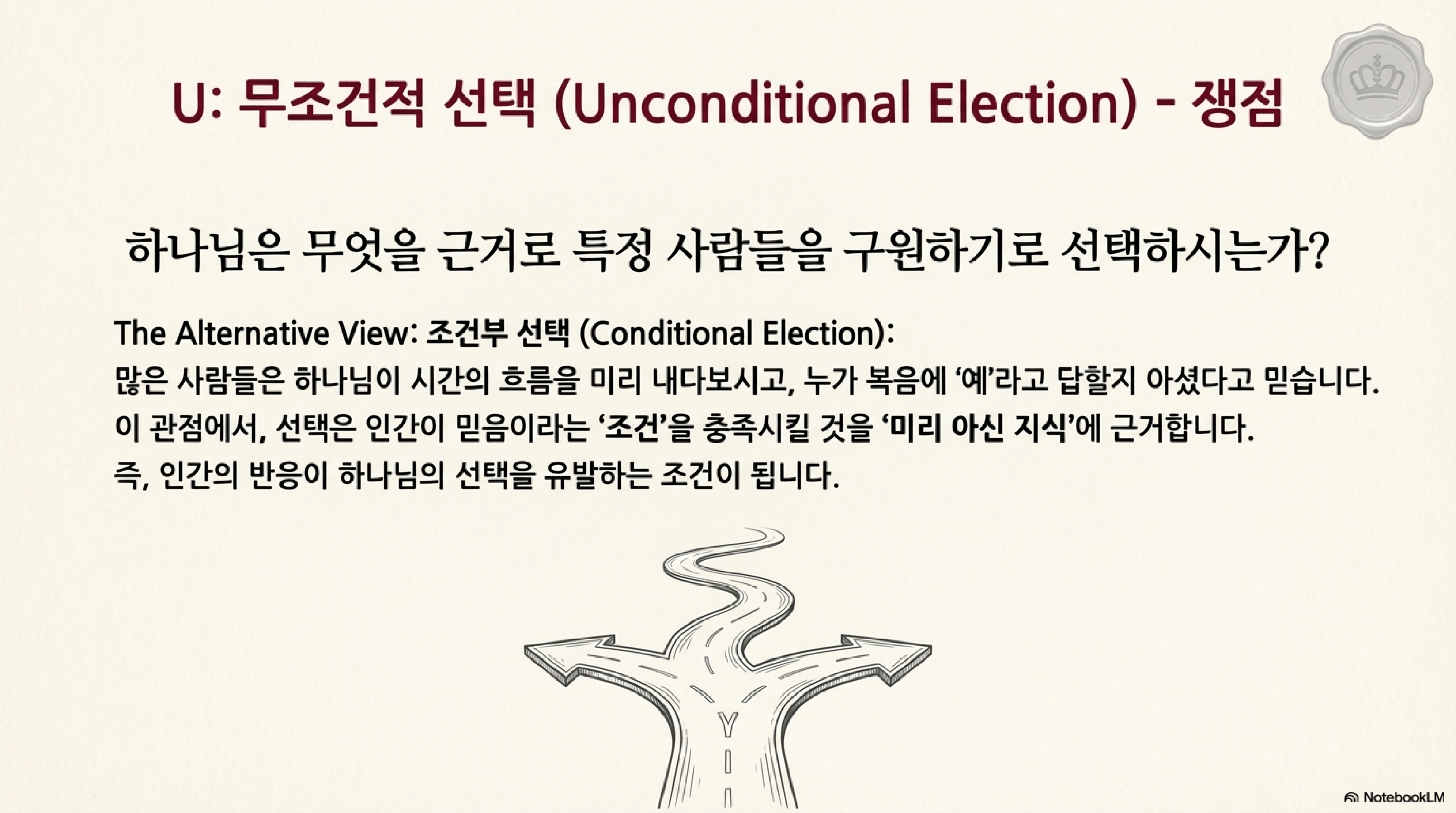 - '조건부 선택'과의 차이: 많은 사람들이 믿는 '조건부 선택'은 하나님이 시간의 통로를 통해 누가 복음에 '예'라고 답할지를 미리 아시고, 그 믿음을 조건으로 그들을 선택하셨다고 본다. 그러나 무조건적 선택은 이러한 인간의 반응이 선택의 '결과'이지 '원인'이 아니라고 가르친다.