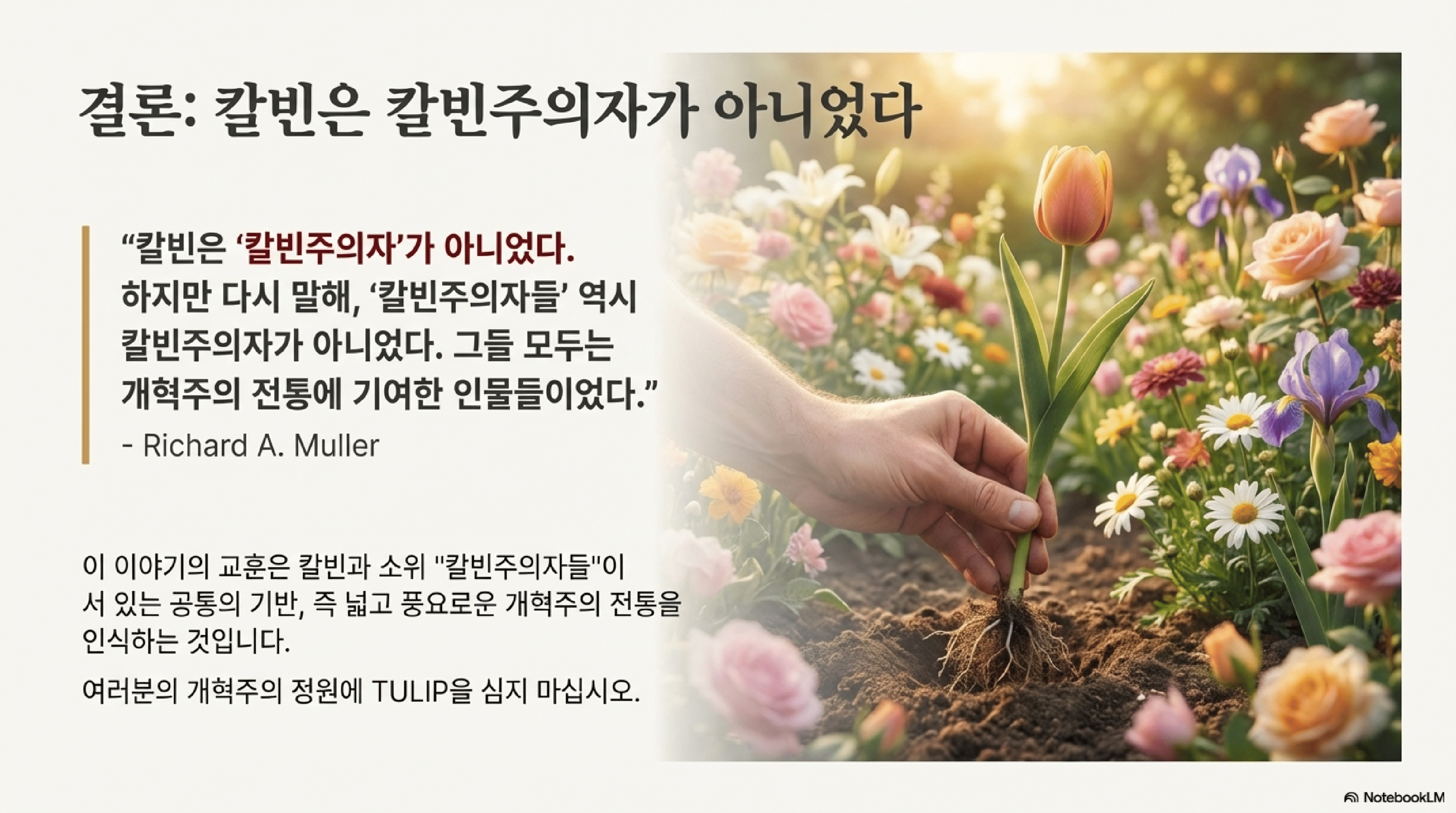 - 시대착오적 용어의 폐기: '칼빈주의'와 TULIP은 개혁주의 전통의 풍부함과 다양성을 왜곡하는 환원주의적 용어이므로 신중하게 사용하거나 폐기해야 한다.