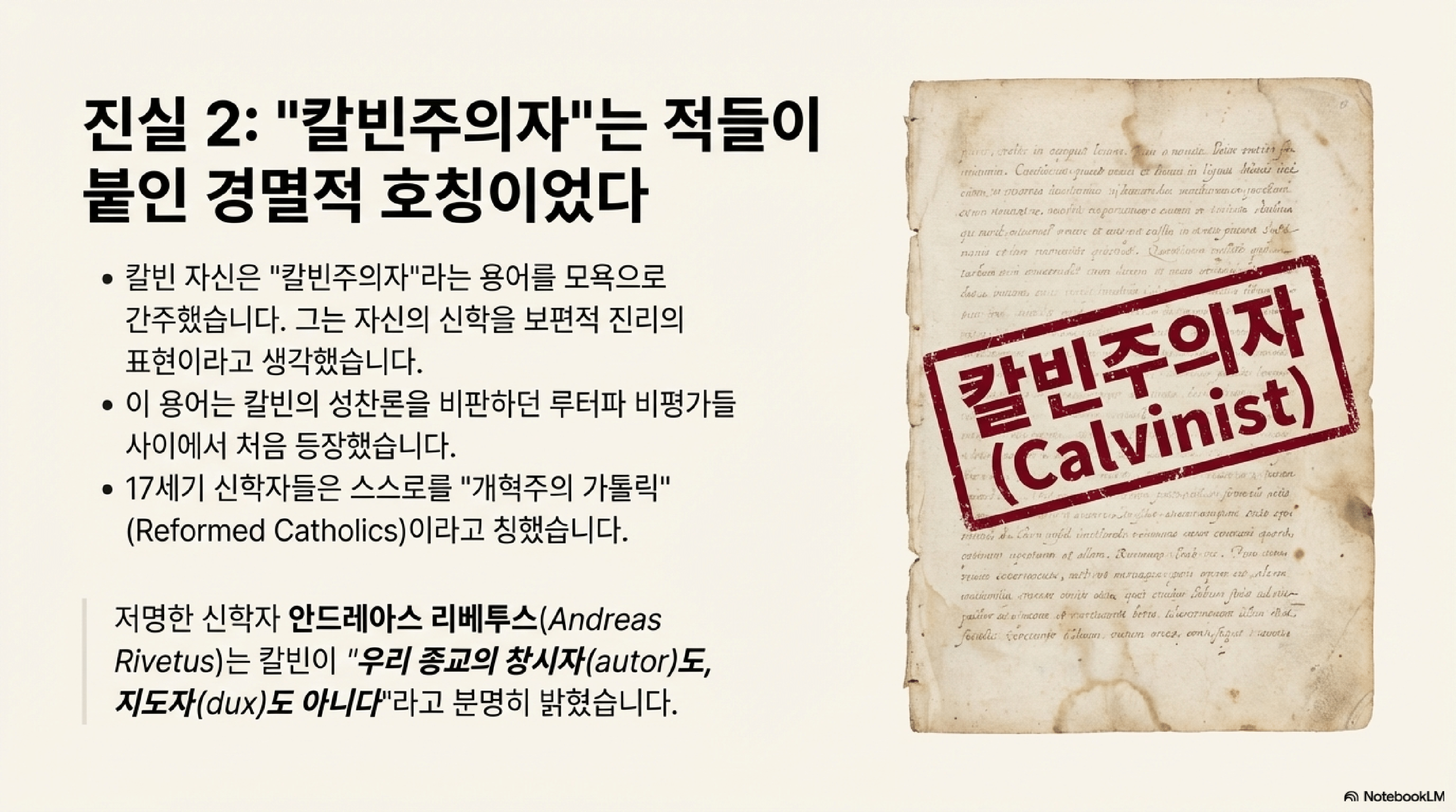 - 용어의 기원: '칼빈주의'와 '칼빈주의자'라는 용어는 16세기 중반 루터파 비평가들이 칼빈의 성찬론을 비판하면서 처음 사용한 경멸적인 명칭이었다. 칼빈 자신을 포함한 당시 개혁주의자들은 이 용어를 모욕으로 간주했다.