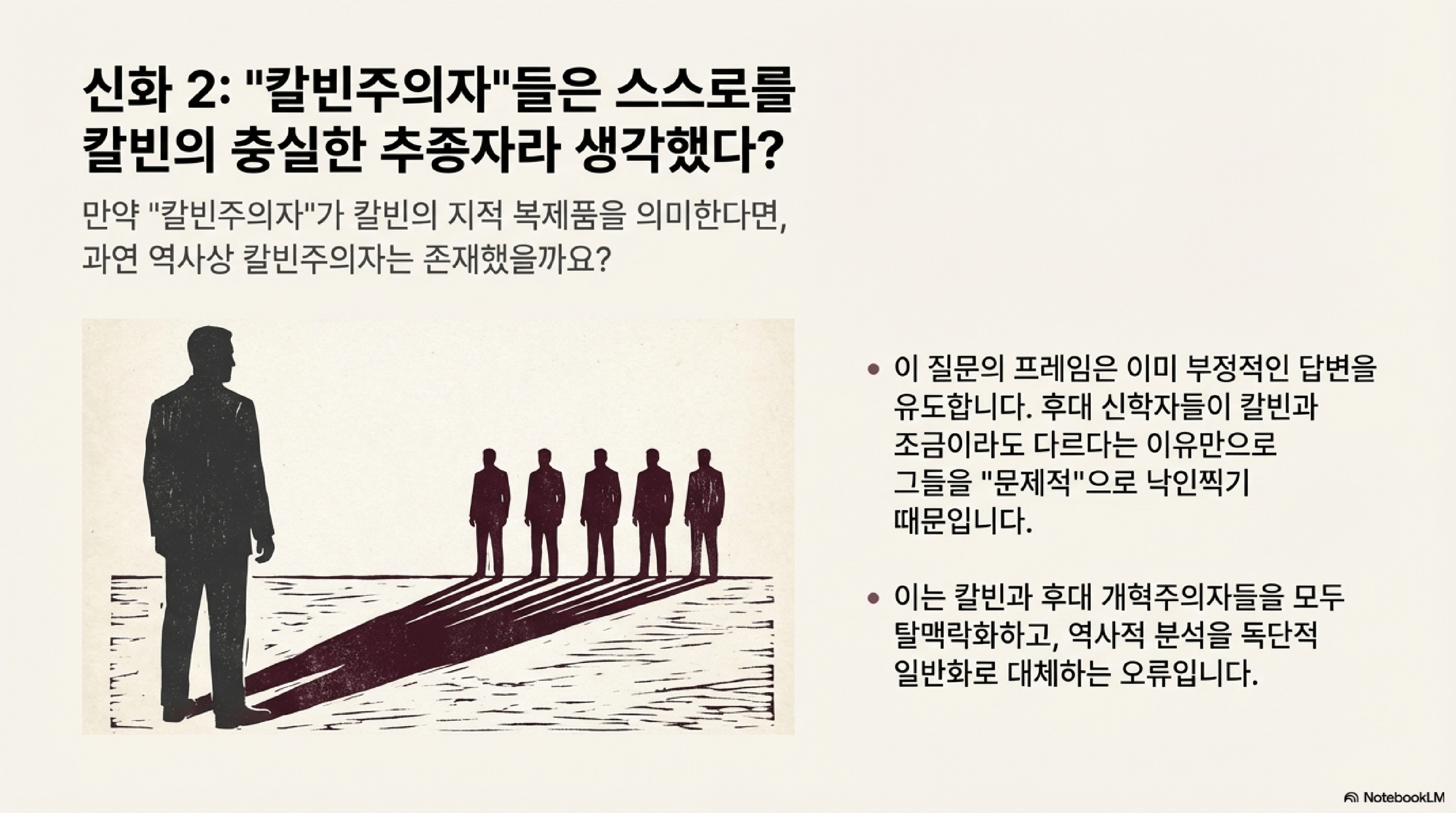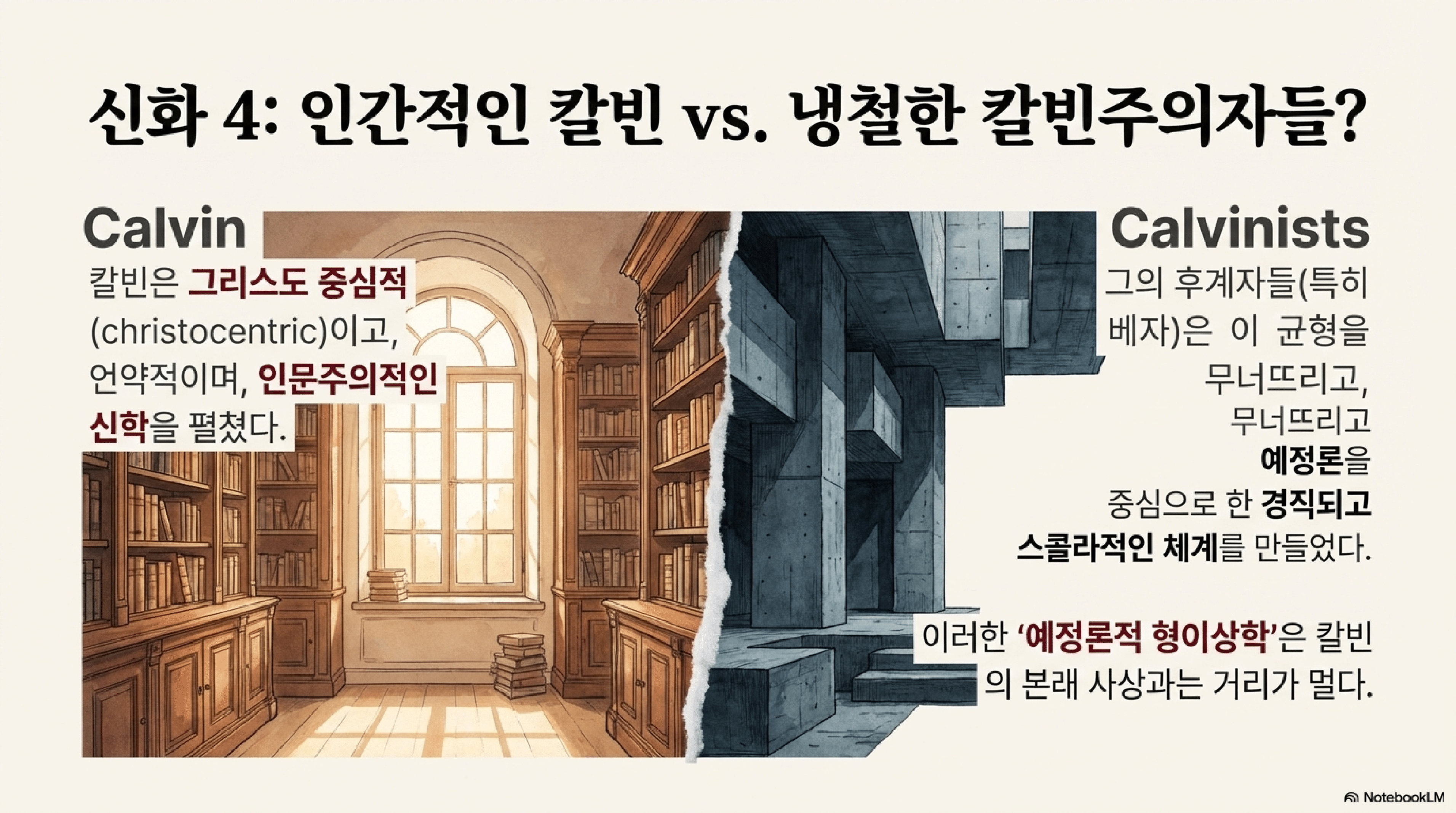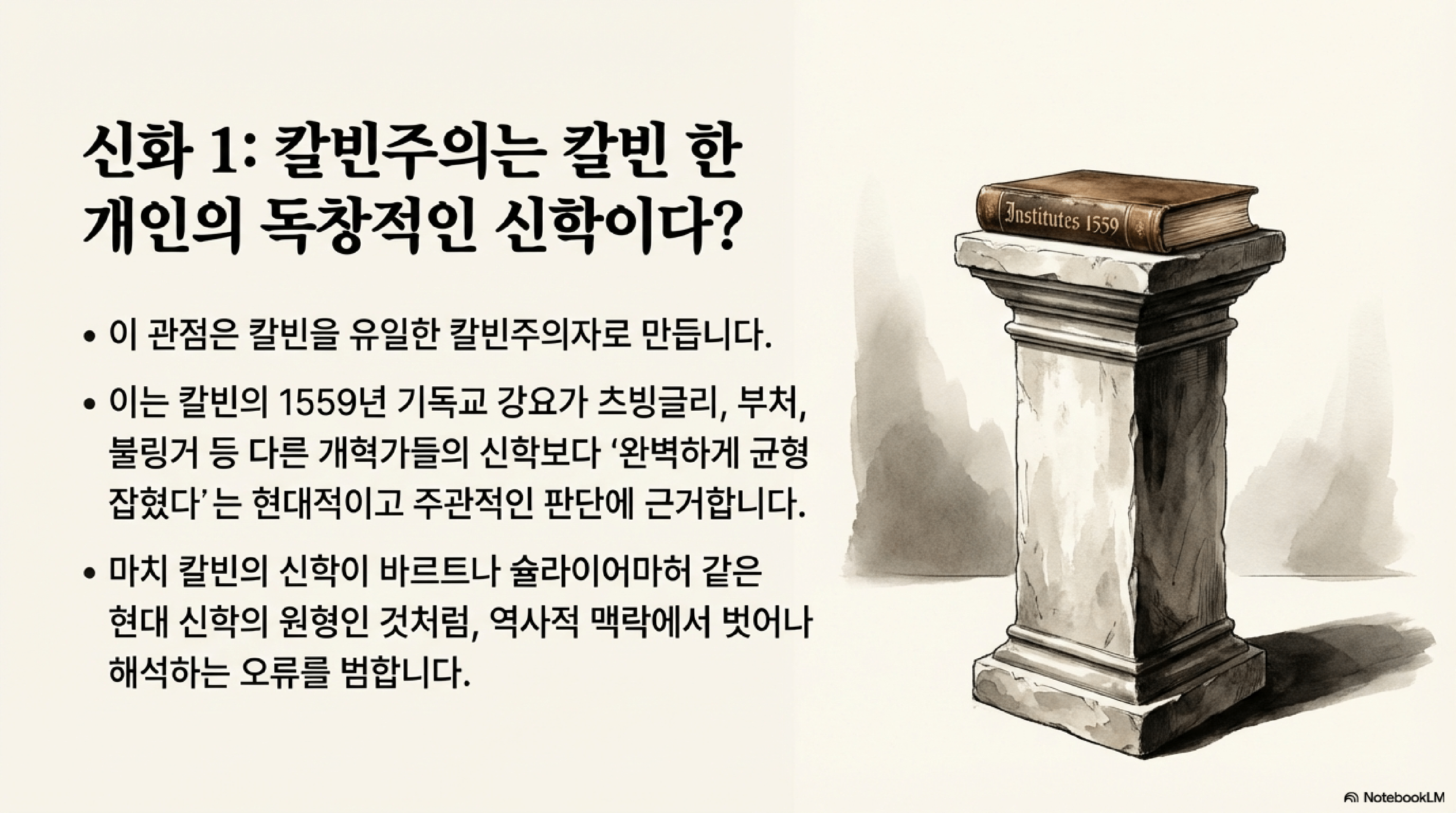 - 독창성 신화: 칼빈의 신학이 완전히 독창적이라는 오해를 불러일으킨다. 실제로는 그의 예정론, 성찬론 등 대부분의 교리는 부처, 비레, 무스쿨루스, 베르미글리 등 동시대 개혁가들의 사상과 놀라울 정도로 유사하며, 전통적인 신학 요소들을 종합한 것이다.