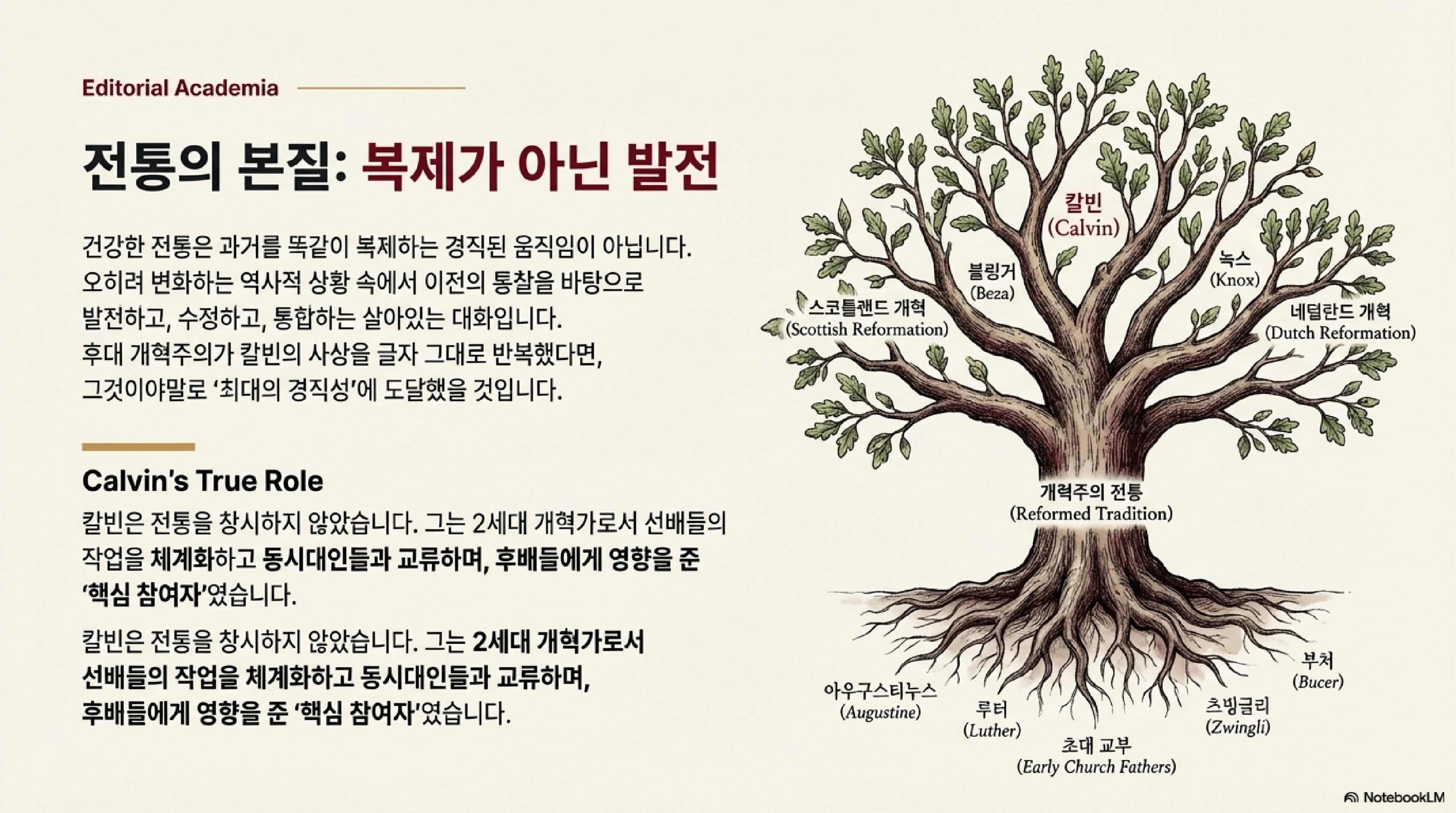 - 전통의 본질: 개혁주의 전통은 칼뱅 한 사람에 의해 세워지고 규정된 것이 아니다. 그는 선배들의 사상을 이어받고 동시대인들과 교류하며 전통 형성에 크게 기여한 인물 중 한 명이었다.
