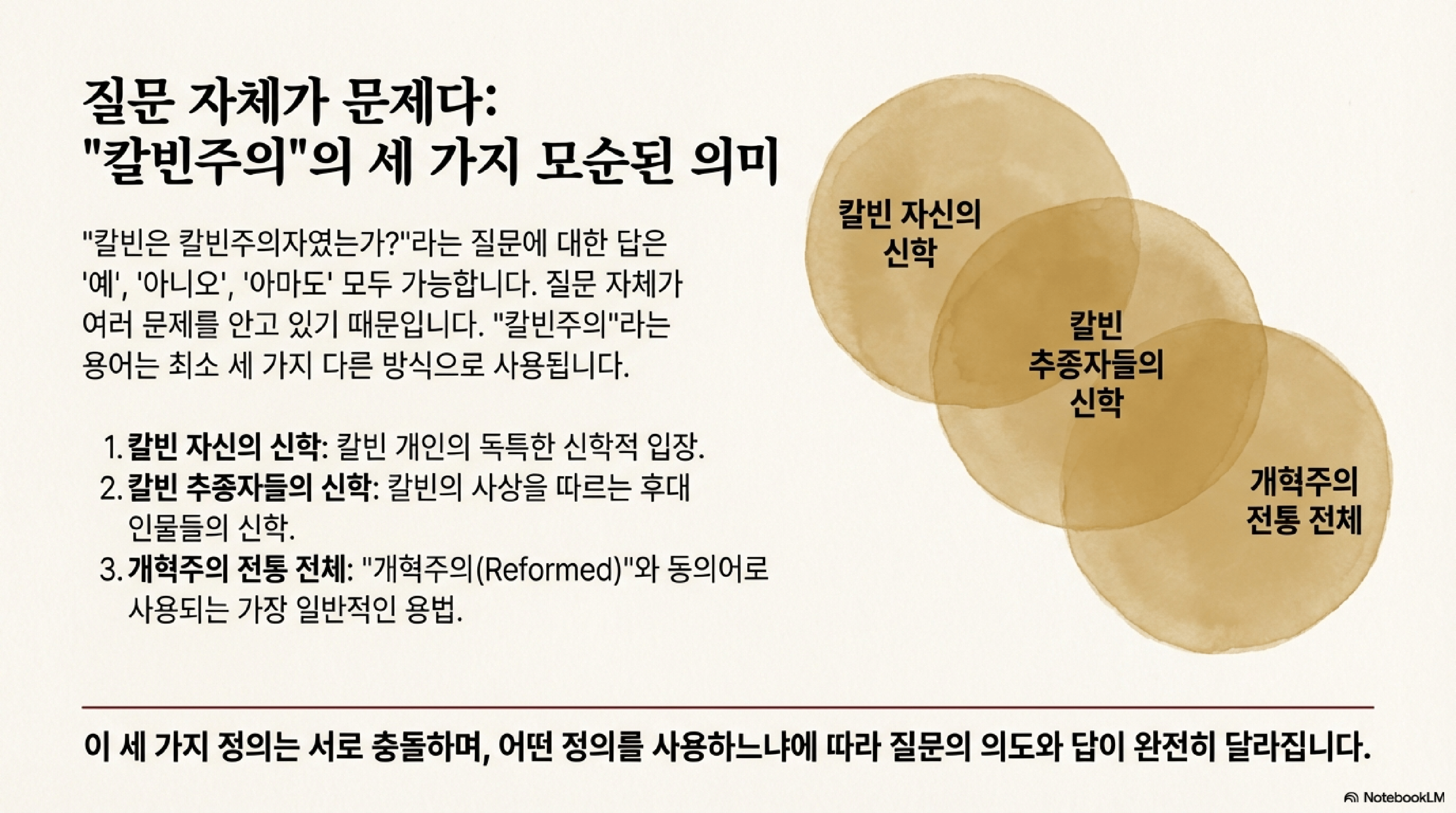 "칼빈은 칼빈주의자였는가?"라는 질문은 그 자체로 현대의 오해에 기반한 근본적인 결함을 안고 있다. 리처드 A. 멀러(Richard A. Muller)는 이 질문에 대한 답변이 복잡할 수밖에 없다고 주장하며, "예... 아니요... 아마도..."라고 답한다. 그 이유는 질문에 사용된 '칼빈주의(Calvinism)'와 '칼빈주의자(Calvinist)'라는 용어 자체가 여러 의미로 사용되며, 역사적 맥락에서 벗어나 있기 때문이다.
