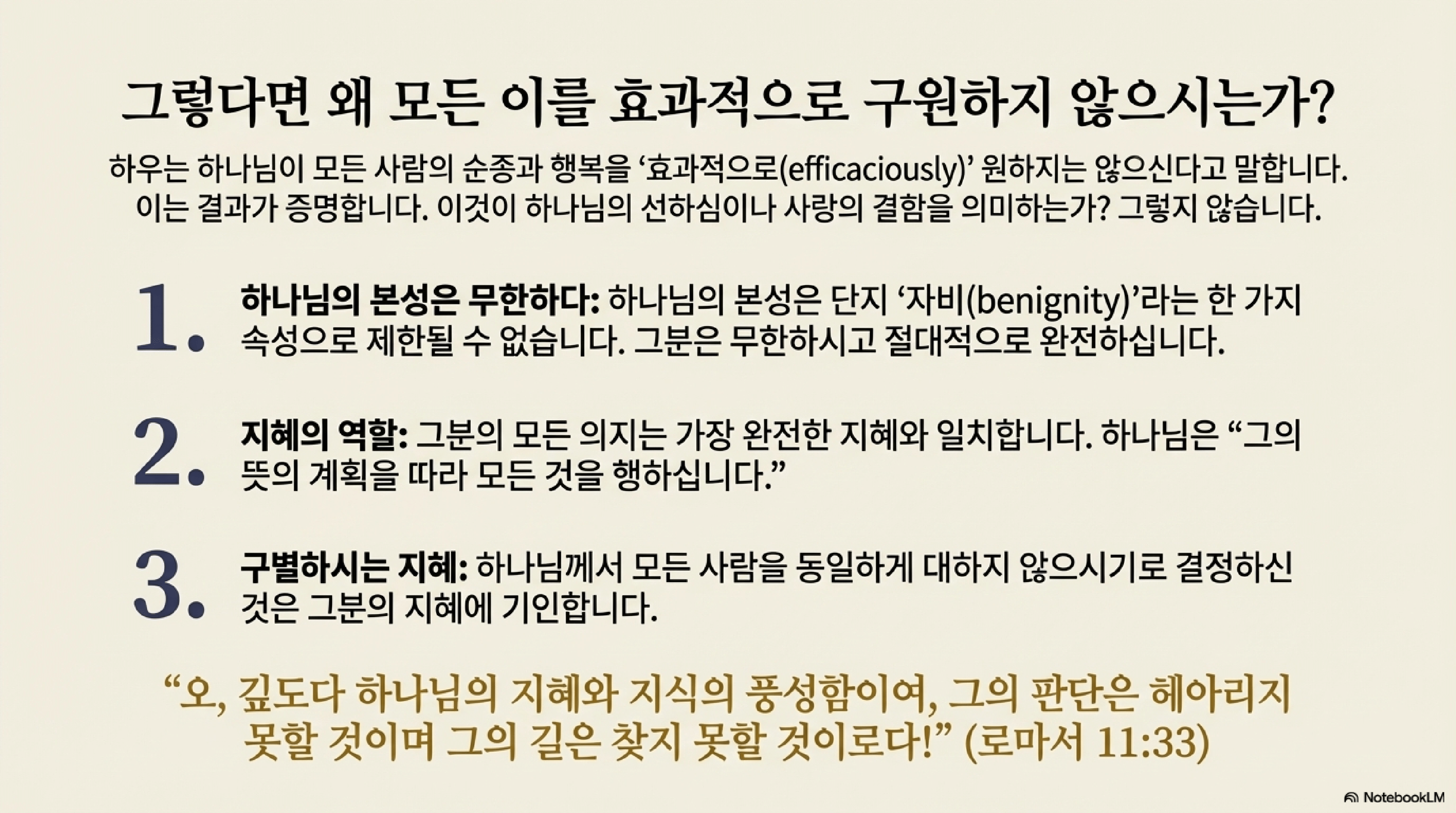 - 지혜에 따른 결정: 하나님께서 모든 이의 구원을 효력 있게 원하지 않는 것은 그분의 자비가 부족해서가 아니라, 그분의 완전한 지혜에 따른 결정이다. 신적 본성은 자비뿐만 아니라 모든 완전성을 포함하며, 하나님의 모든 의지 행위는 그분의 지혜의 계획에 부합한다. 바울이 로마서 11장 33절에서 찬양했듯이, 어떤 이들을 구원하고 어떤 이들을 내버려두는 차이를 만드시는 것은 하나님의 깊은 지혜에 기인한다.