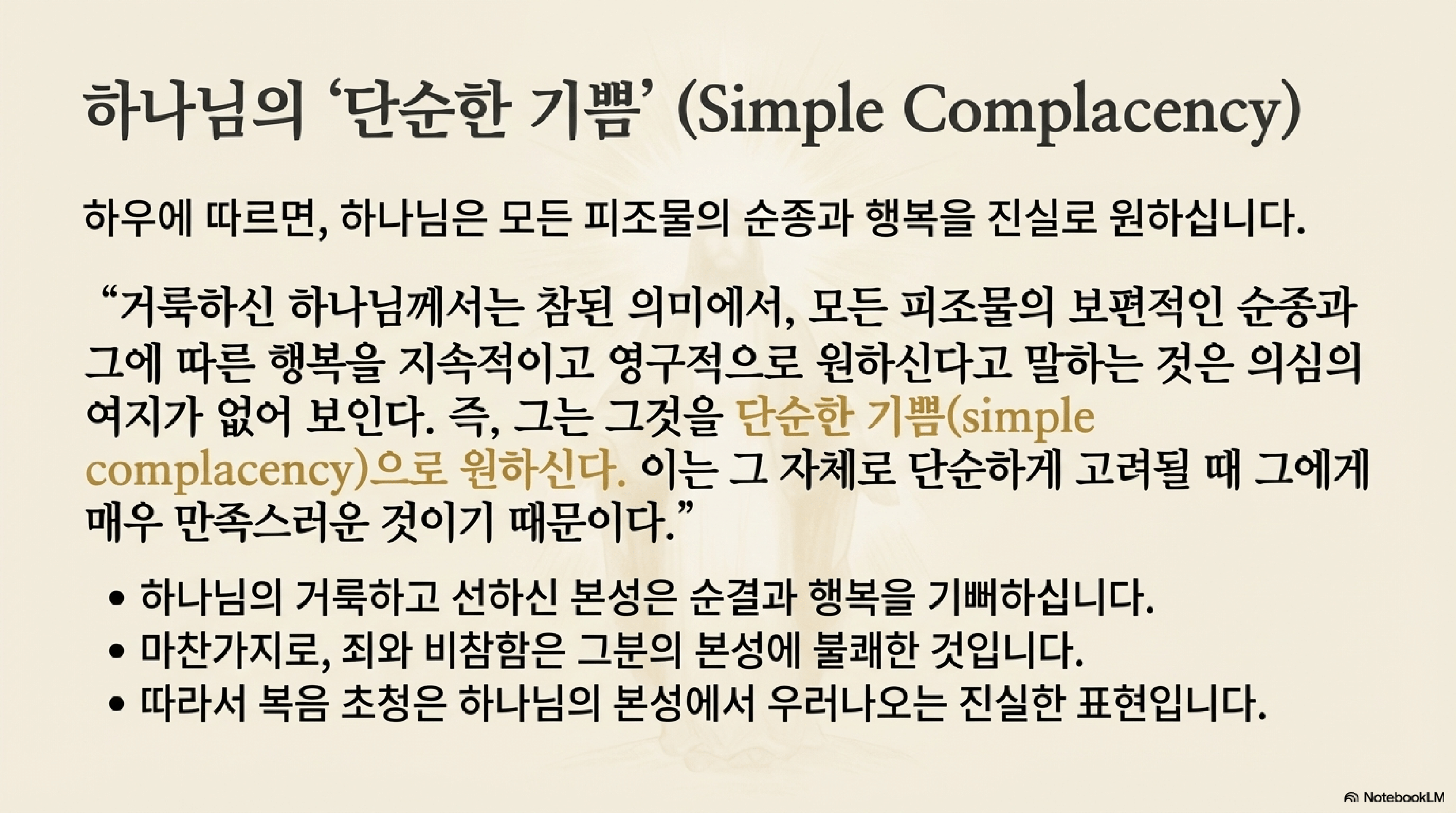 - 자비로운 낮추심: 하나님께서 성경에서 권고하고, 간청하고, 슬퍼하는 듯이 말씀하시는 것은 그분 안에 인간적인 격정이 있어서가 아니라, 우리를 움직이기에 가장 적합한 방식을 선택하신 "자비로운 낮추심"이다.