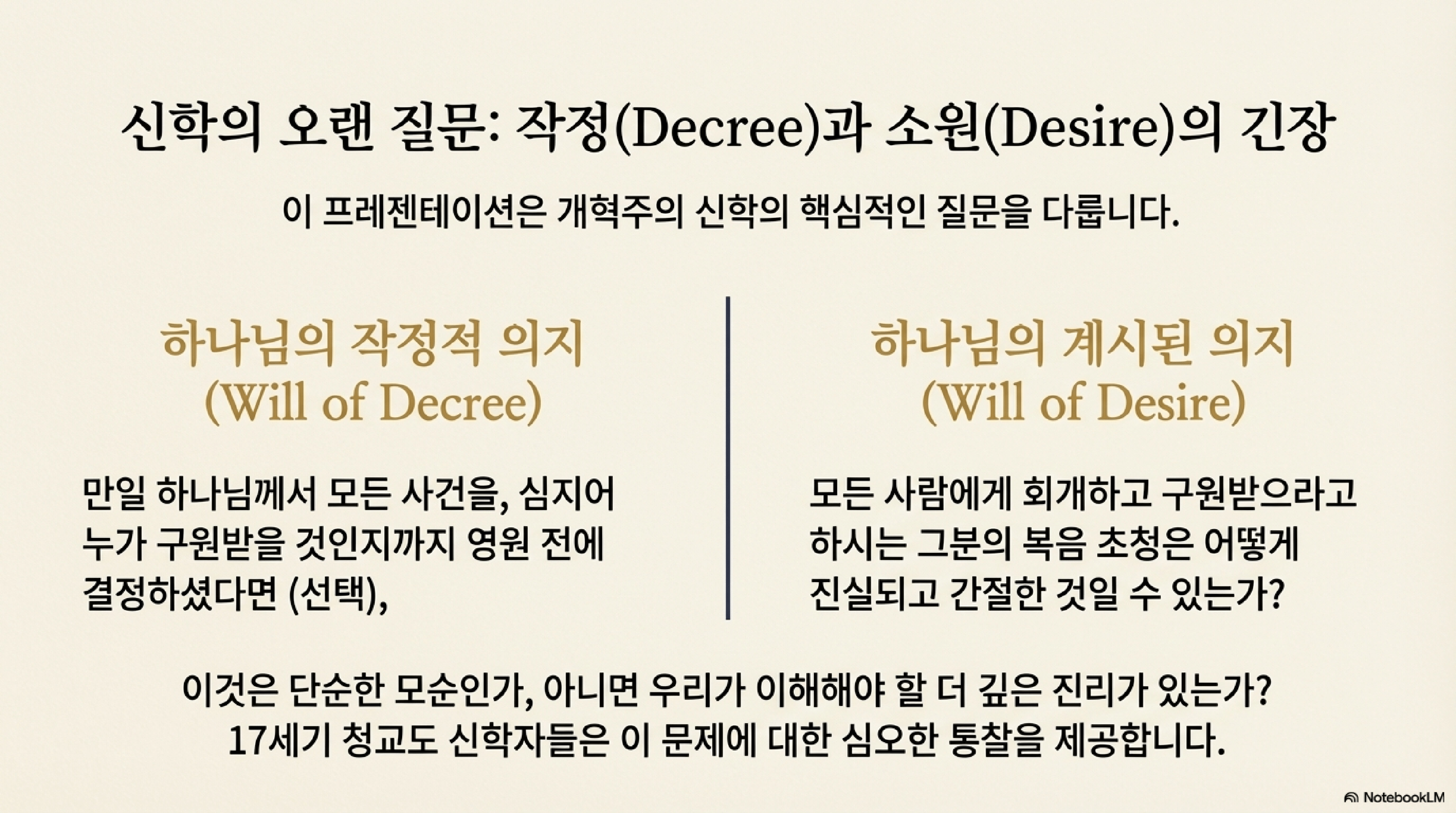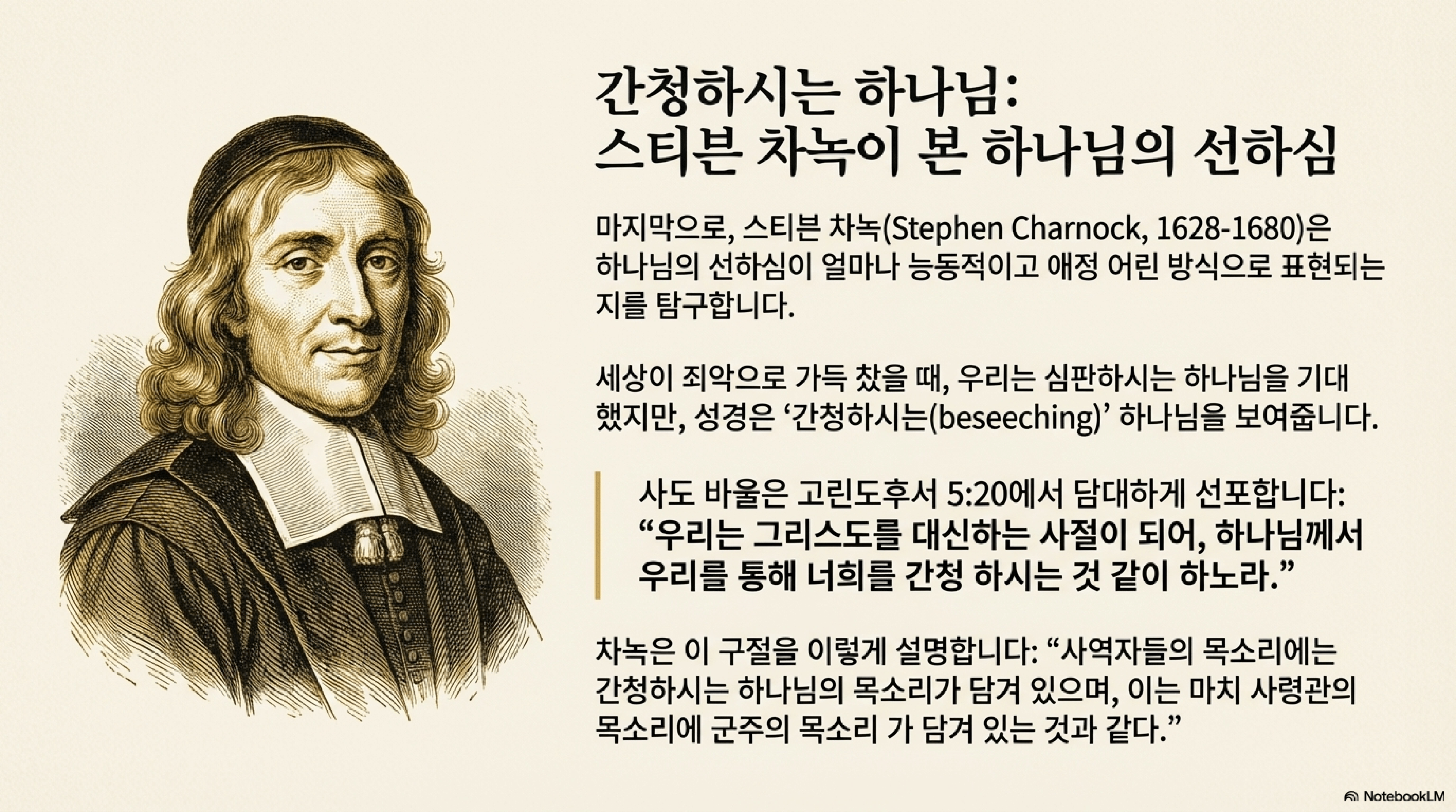 이번 포스팅은 17세기 개혁주의 신학자 존 하우, 존 플라벨, 스티븐 차녹의 저술을 바탕으로, 복음의 권고에 나타난 하나님의 뜻에 대한 신학적 통찰을 종합한다. 핵심은 하나님의 주권적 작정과 죄인의 구원을 향한 그분의 진실한 열망 사이의 관계를 해명하는 것이다.
