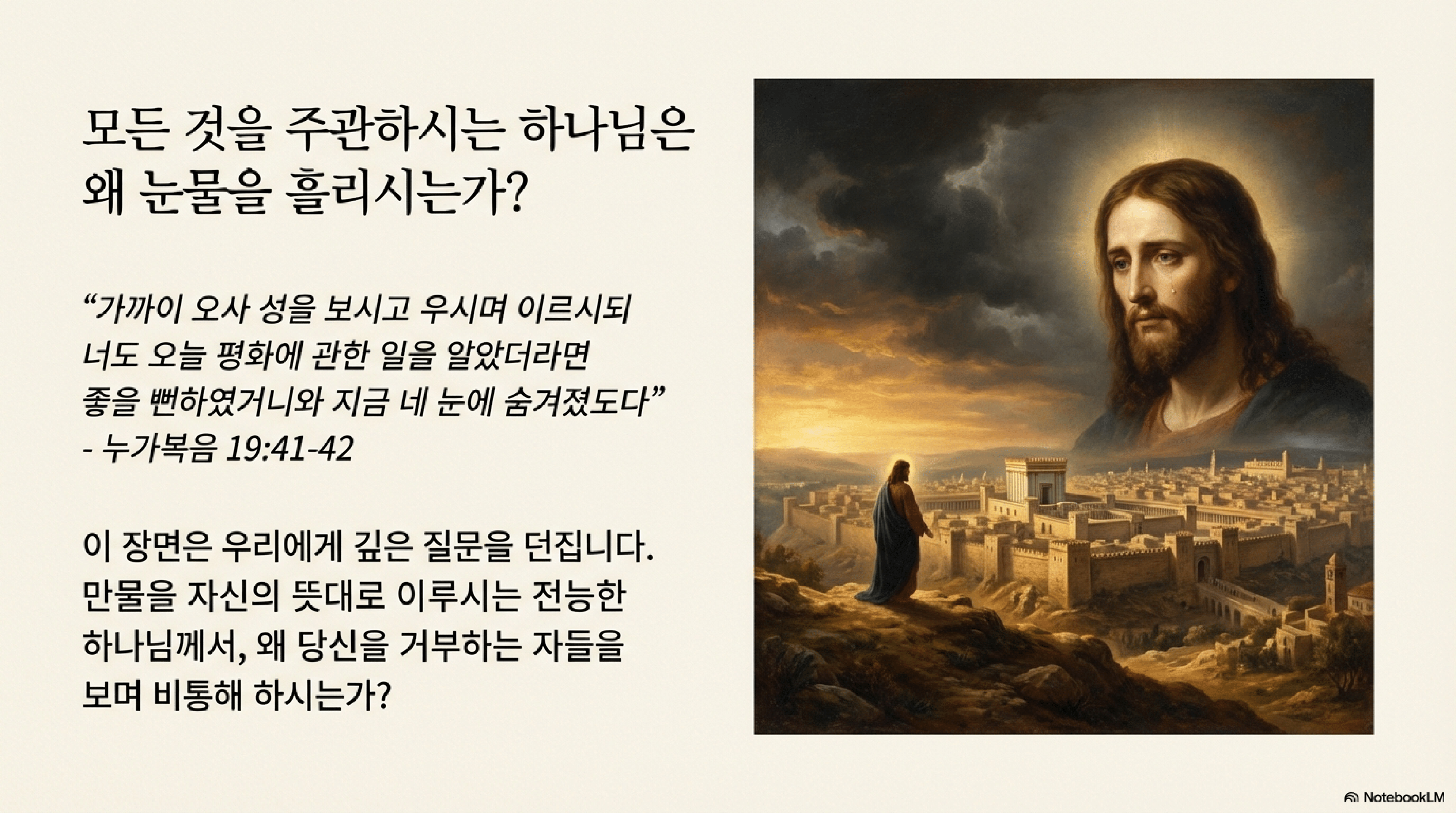 - 구세주의 눈물: 예수께서 예루살렘을 보시고 우신 사건(눅 19:41)은 완고한 자들의 구원을 향한 "그의 애정의 열심과 열렬함"을 명백히 드러낸다. 그분의 눈물은 죄인들을 포기하기를 얼마나 꺼리시는지를 보여준다.