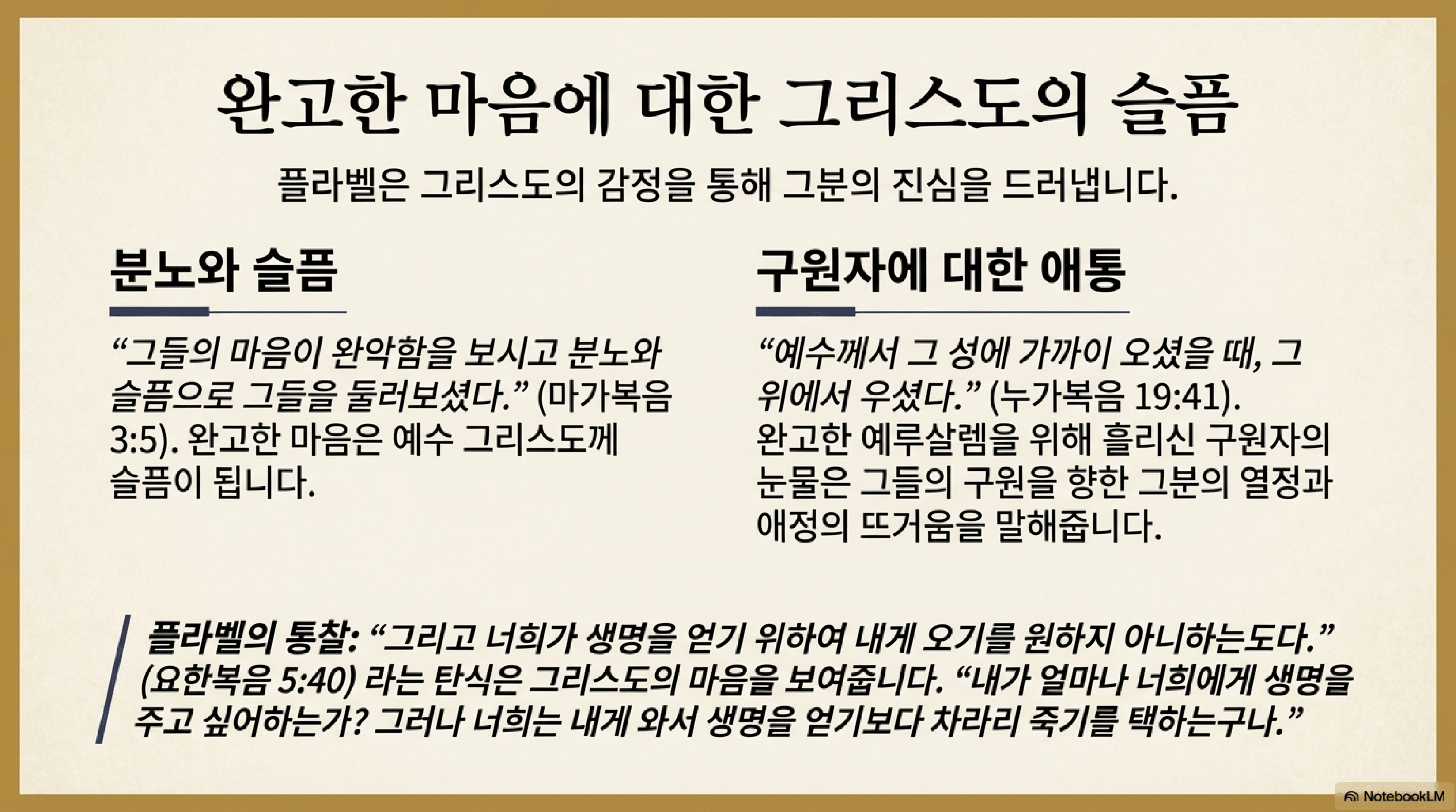 - 그리스도의 슬픔: 예수께서 마음이 완악한 자들을 보시고 분노하시며 슬퍼하셨다는 기록(막 3:5)은 "완악한 마음이 예수 그리스도께 슬픔이 됨"을 보여준다.