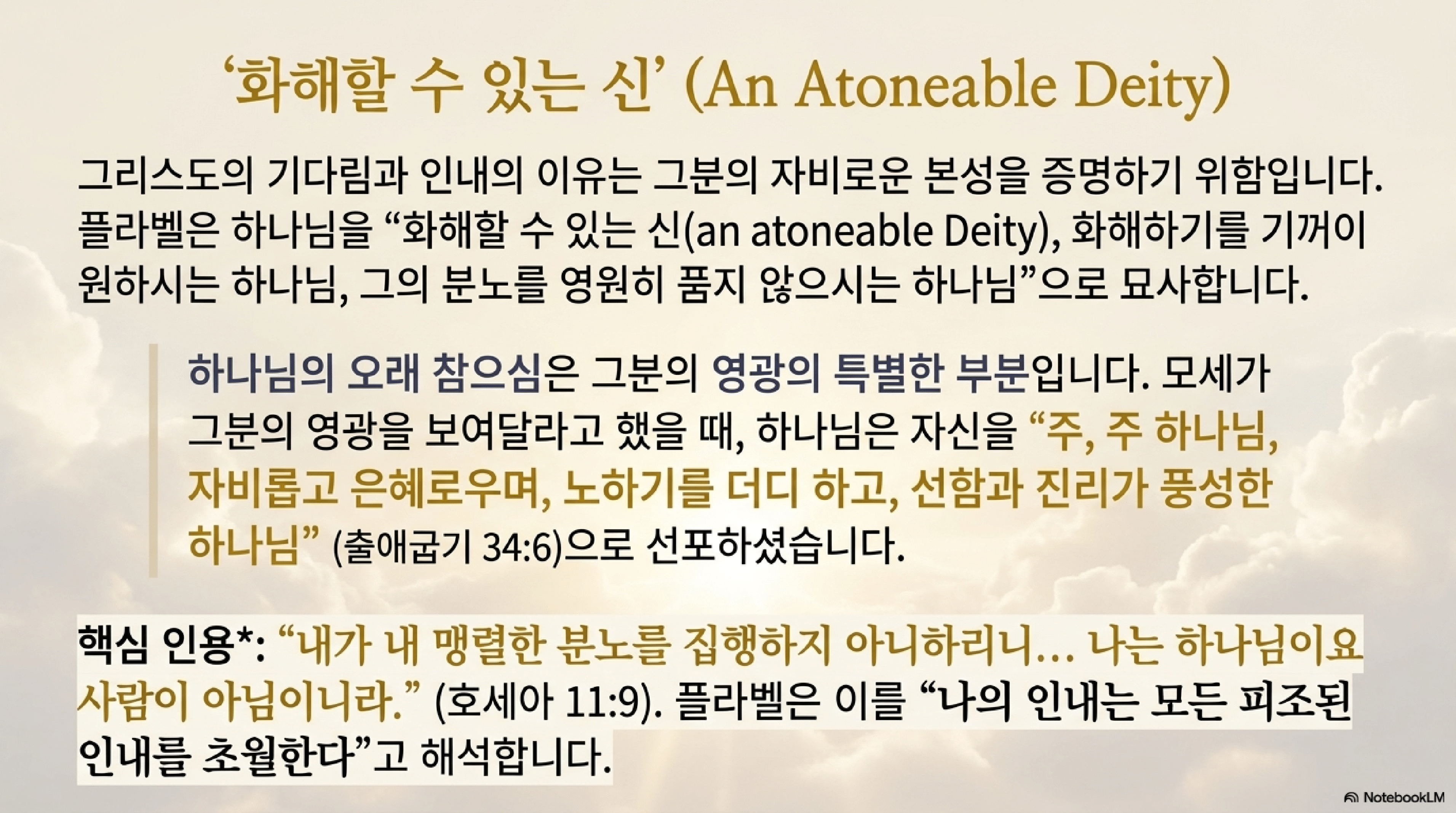 - 신적 속성의 영광: 오래 참으심은 하나님의 독특한 영광이다. 호세아 11장 9절("나는 하나님이요 사람이 아님이라")을 인용하며, 플라벨은 하나님의 인내가 어떤 피조물의 인내도 초월함을 강조한다. 그분은 죄인들에게 회개하고 평화를 얻을 기회가 있음을 알리기 원하신다.