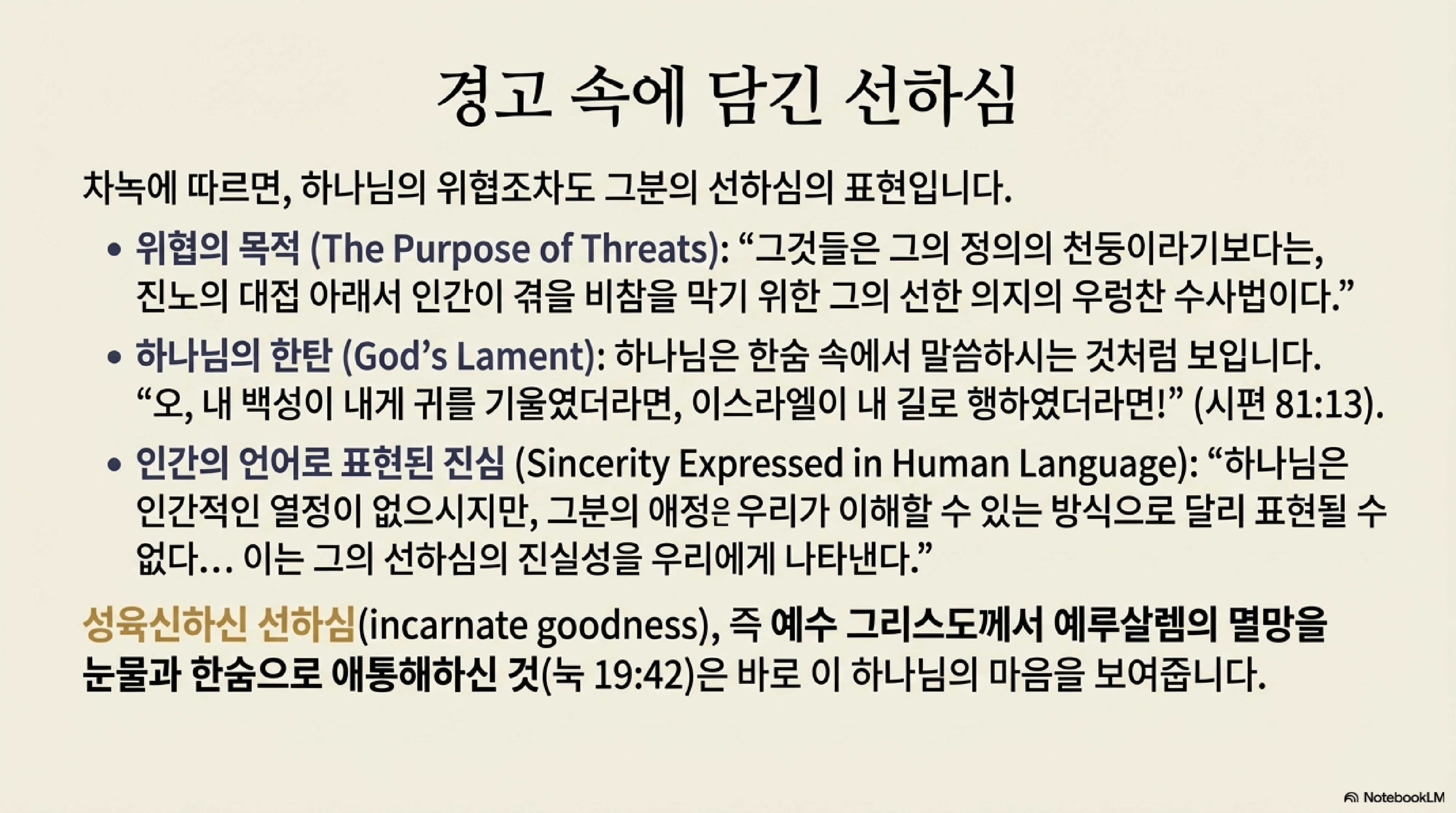 - 애절한 슬픔: 시편 81편 13절("내 백성아 내 말을 들으라 이스라엘아 내 도를 따르라")의 말씀은 한숨 속에서 터져 나오는 애통과 같다. 이는 하나님이 인간적인 격정을 가지셨다는 의미가 아니라, 그분의 선하심의 진실성을 우리가 이해할 수 있도록 표현한 것이다.