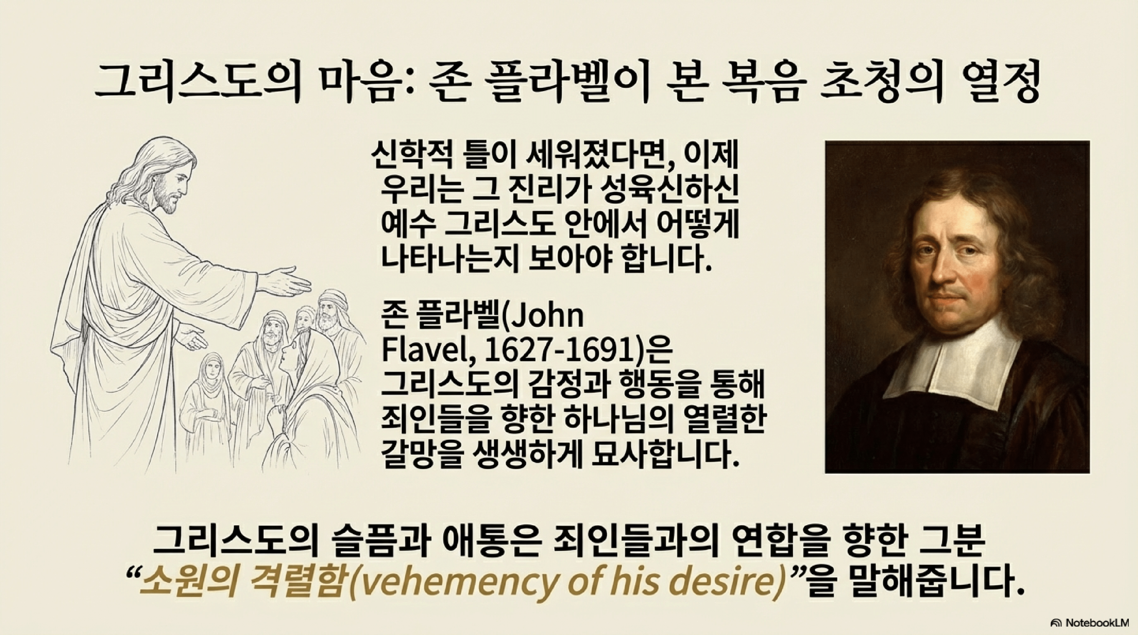 존 플라벨은 그리스도의 성품과 행동, 특히 그분의 인내와 슬픔을 통해 죄인들을 구원하시려는 하나님의 열렬한 갈망을 생생하게 묘사한다.