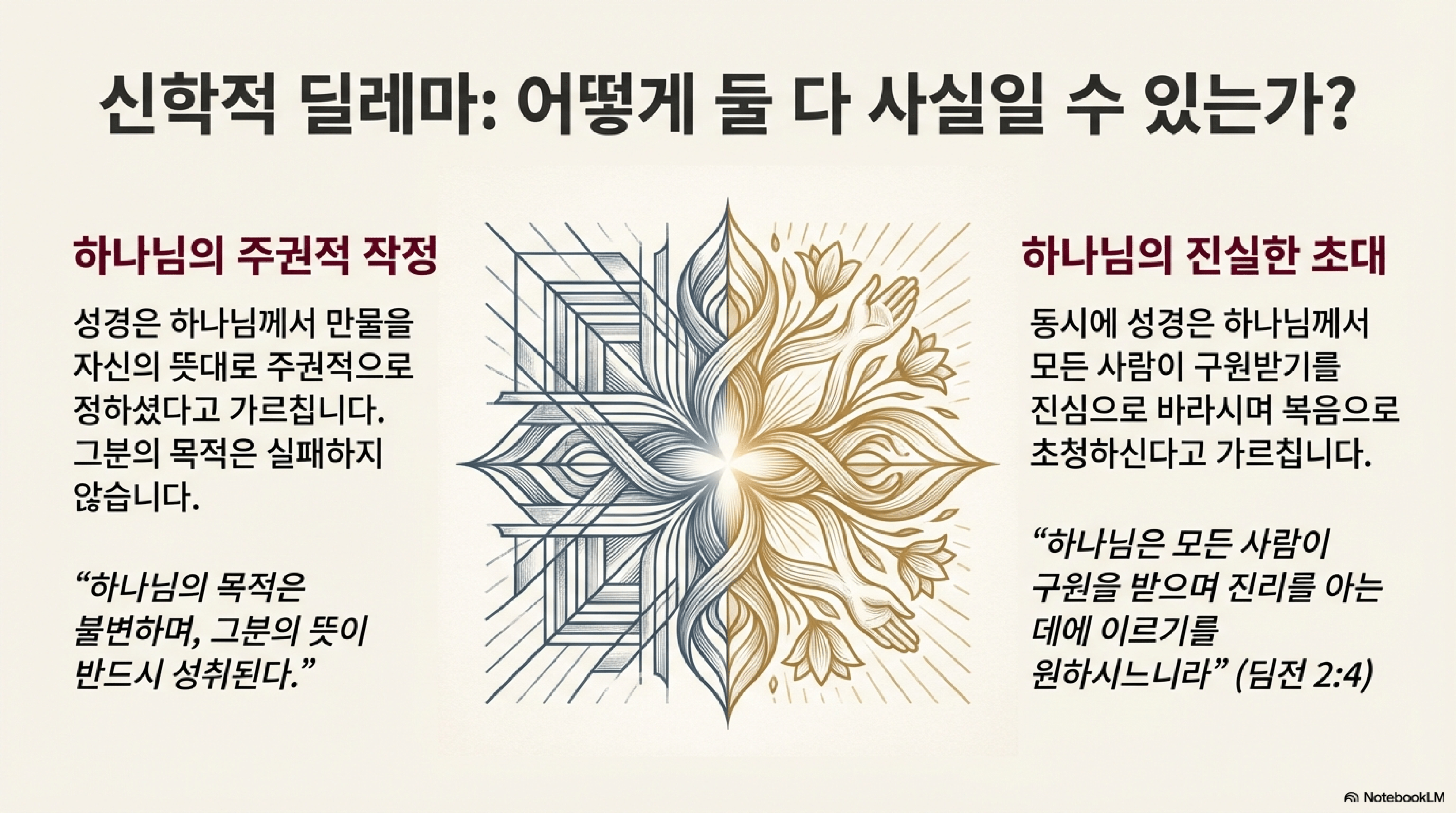 - 자연스러운 표현: 따라서 하나님께서 자신의 미래에 대한 절대적인 예지나 지혜로운 작정을 가지고 계시더라도, 자신의 본성적 성향(거룩함을 사랑하심)을 부르심과 초청과 같은 방식으로 표현하시는 것은 전혀 모순되지 않으며 오히려 자연스럽다.