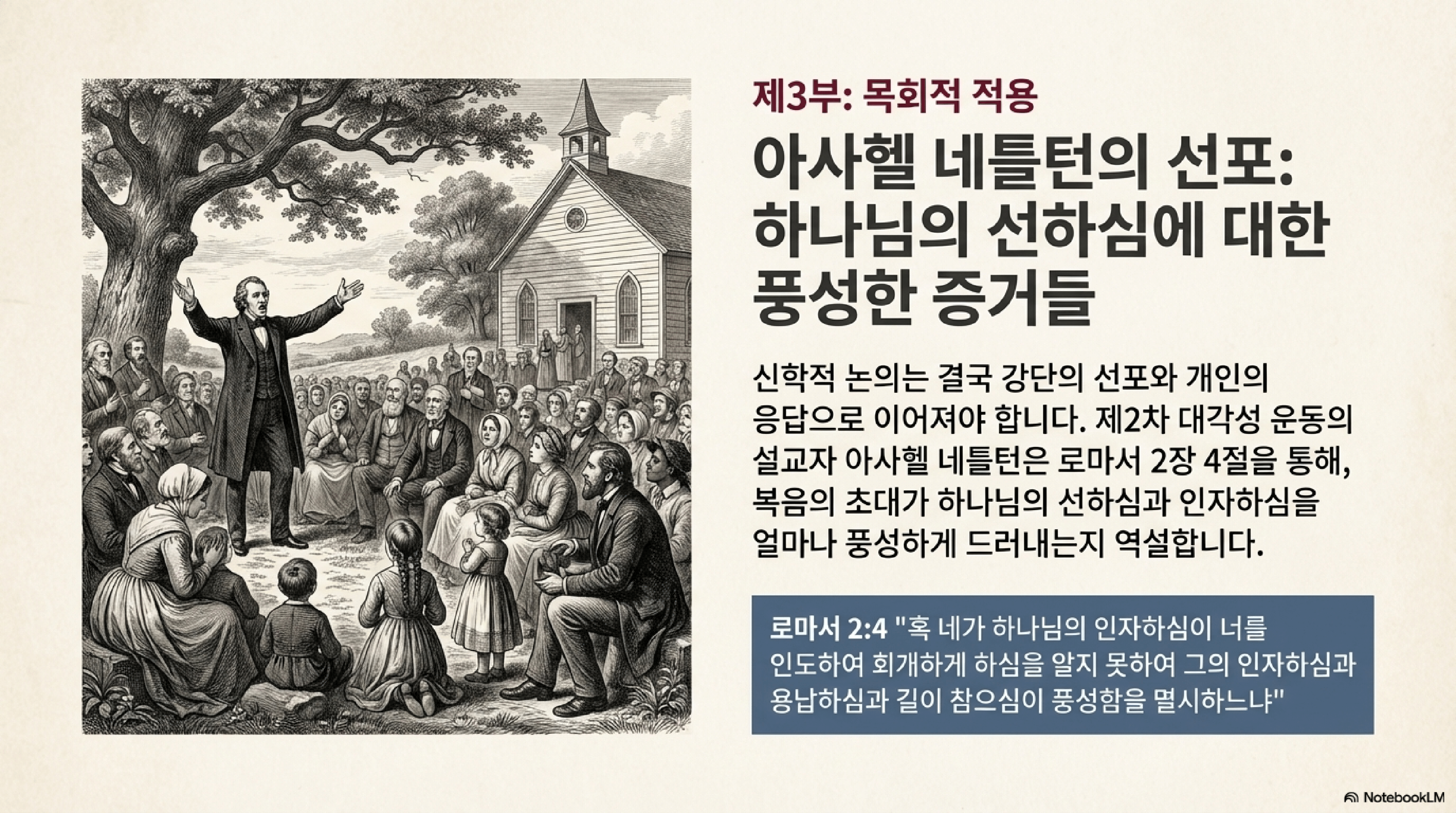 아사헬 네틀턴은 로마서 2장 4절("네가 하나님의 인자하심이 너를 인도하여 회개하게 하심을 알지 못하여 그의 인자하심과 용납하심과 길이 참으심이 풍성함을 멸시하느냐")에 대한 설교를 통해, 하나님의 선하심이 복음 제시와 죄인을 향한 인내 속에서 어떻게 드러나는지를 목회적 관점에서 설명한다.