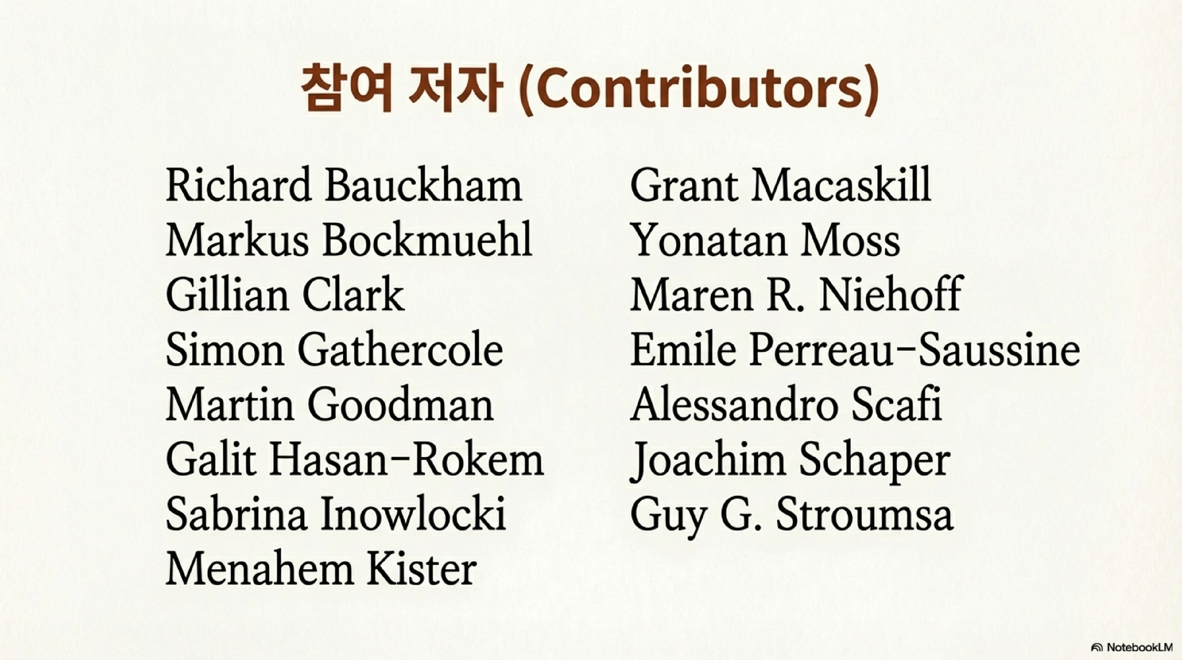 - 마틴 굿맨 (Martin Goodman): 1세기 유대인들이 당대 그리스-로마의 정원(paradeisoi) 문화에 대해 보인 독특한 관점을 조명한다.