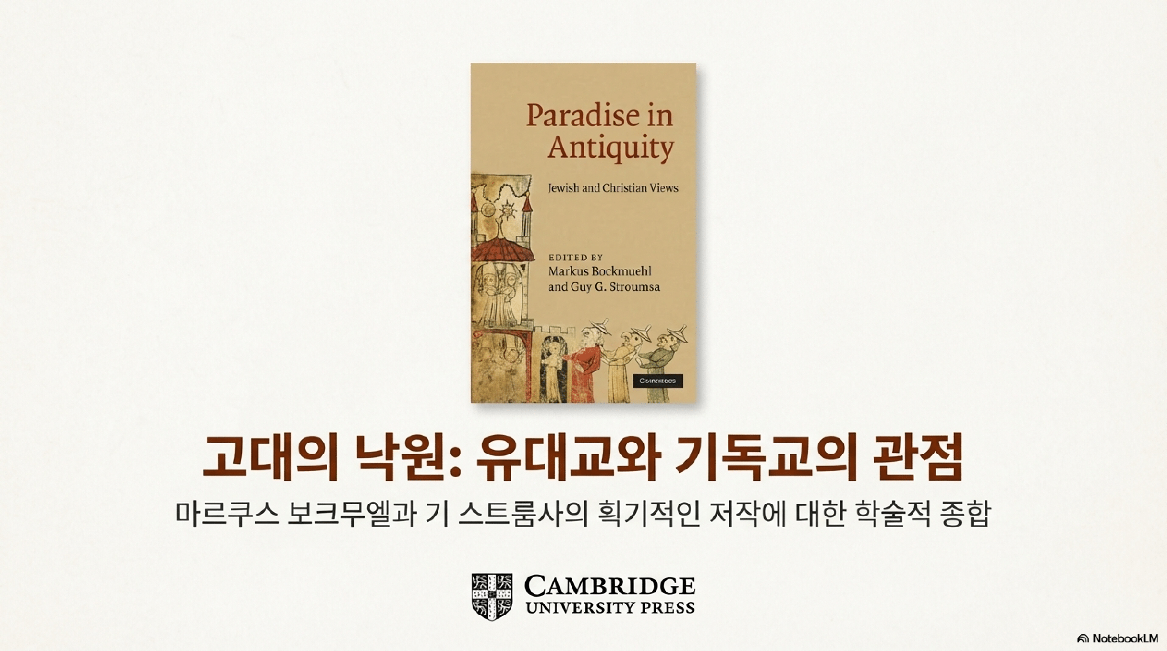 이번 포스팅은 고대 유대교와 기독교의 낙원 개념을 탐구한 학술 서적 『Paradise in Antiquity: Jewish and Christian Views』의 핵심 통찰을 종합한 브리핑 자료이다. 이 책은 낙원 서사가 고대 유대인과 기독교인, 나아가 무슬림에게 인간 조건에 대한 초월적 희망을 구체화하는 핵심적인 역할을 했다고 주장한다. 편집자 기 G. 스트룸사(Guy G. Stroumsa)가 서문에 제시한 '낙원 크로노토프(chronotrope)' 개념은 이 책의 중심 주제로, 낙원이 시간(원시시대, 종말시대, 현재)과 공간(지상, 천상)을 자유롭게 이동하는 다의적 상징임을 보여준다.