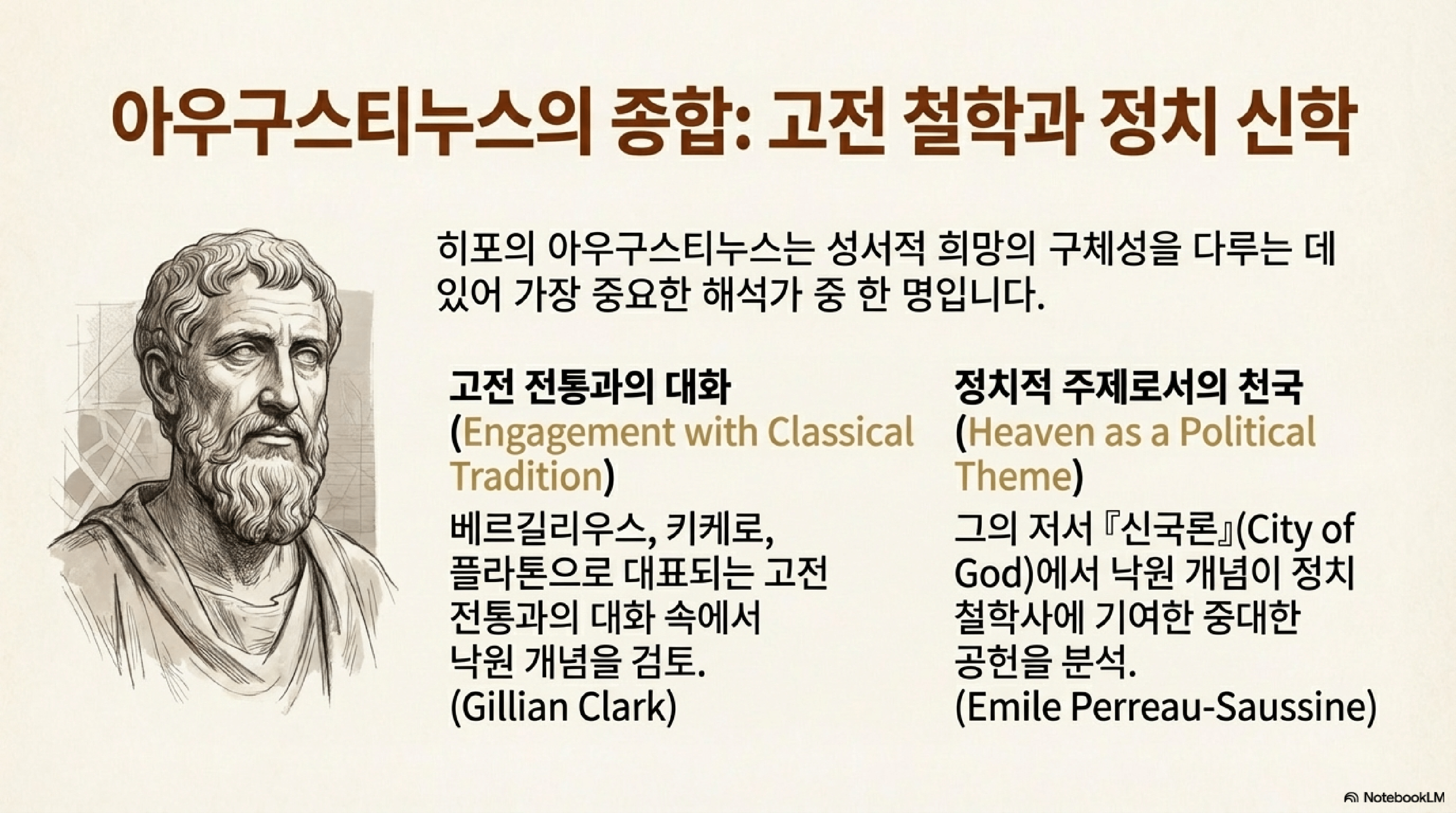 - 질리언 클라크 (Gillian Clark) & 에밀 페로-소신 (Emile Perreau-Saussine): 히포의 어거스틴이 베르길리우스 등 고전 전통과 대화하며 낙원 개념을 어떻게 구체화했는지, 그리고 이것이 정치 철학사에 어떻게 기여했는지를 각각 분석한다.