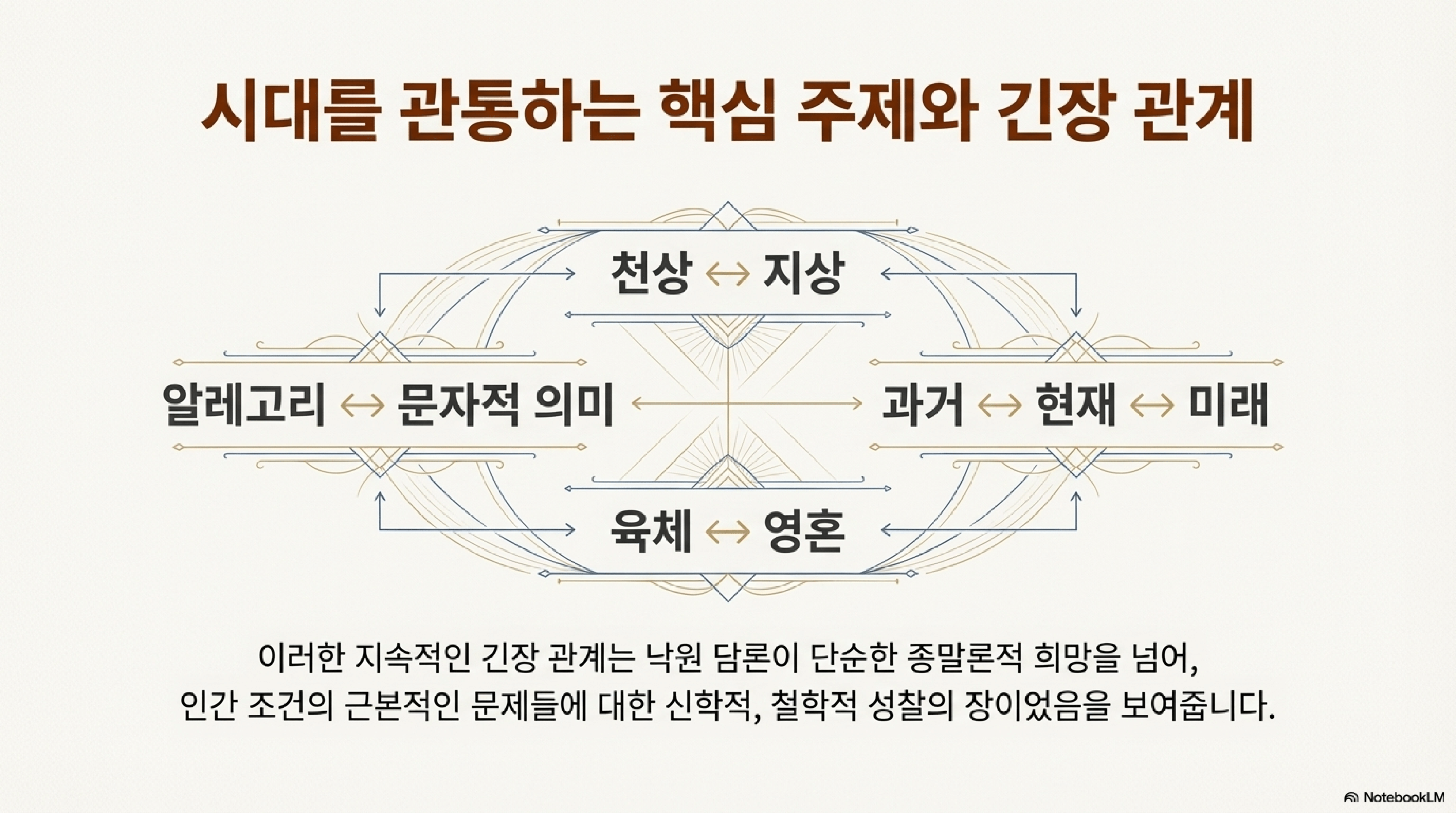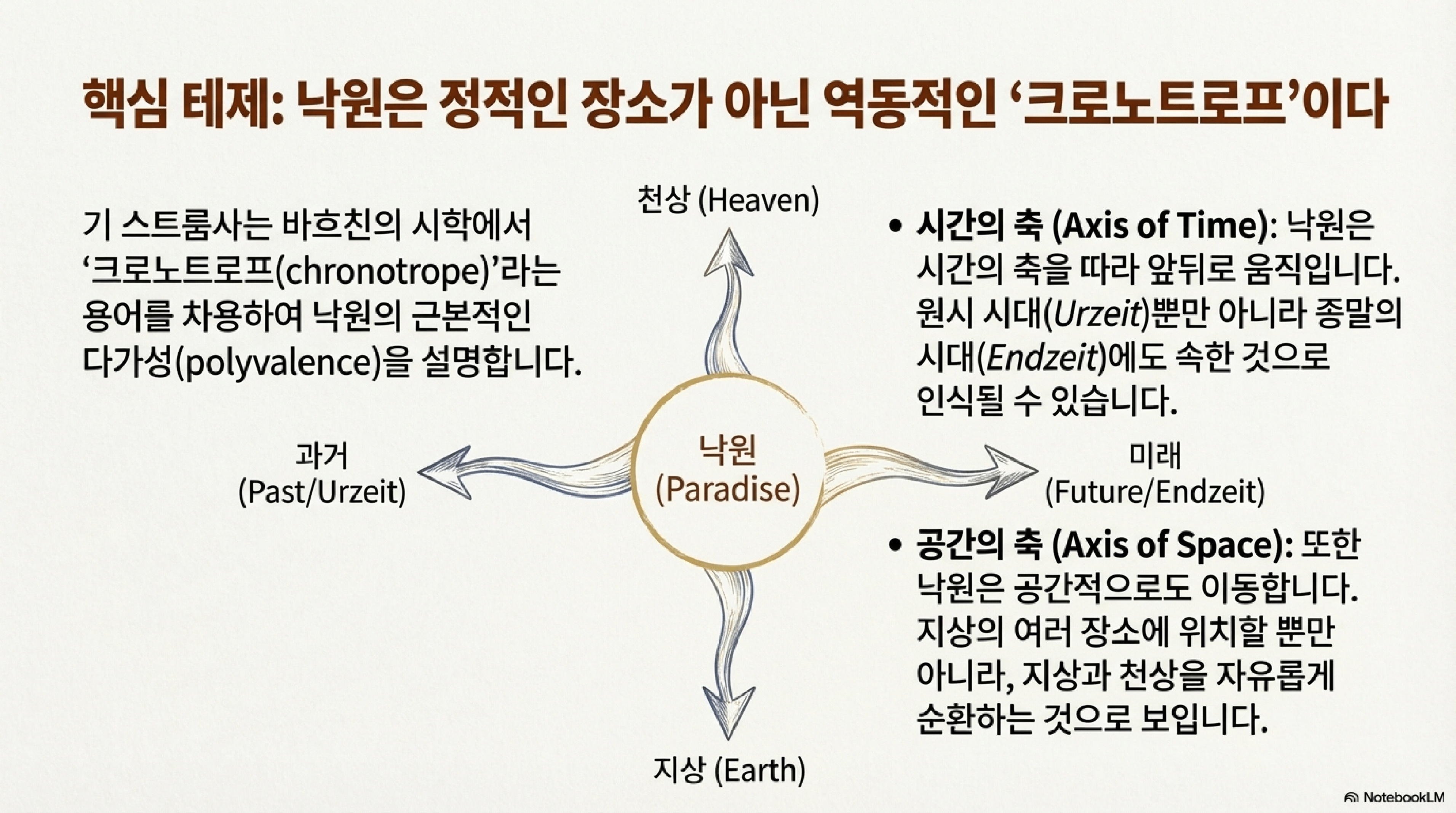 - 이중적 경험: 이 개념은 낙원에 대한 인간의 핵심 경험이 돌이킬 수 없는 상실에 대한 '향수'와 그것을 되찾으려는 '불멸의 기대'라는 이중적 긴장 관계에 있음을 시사한다.