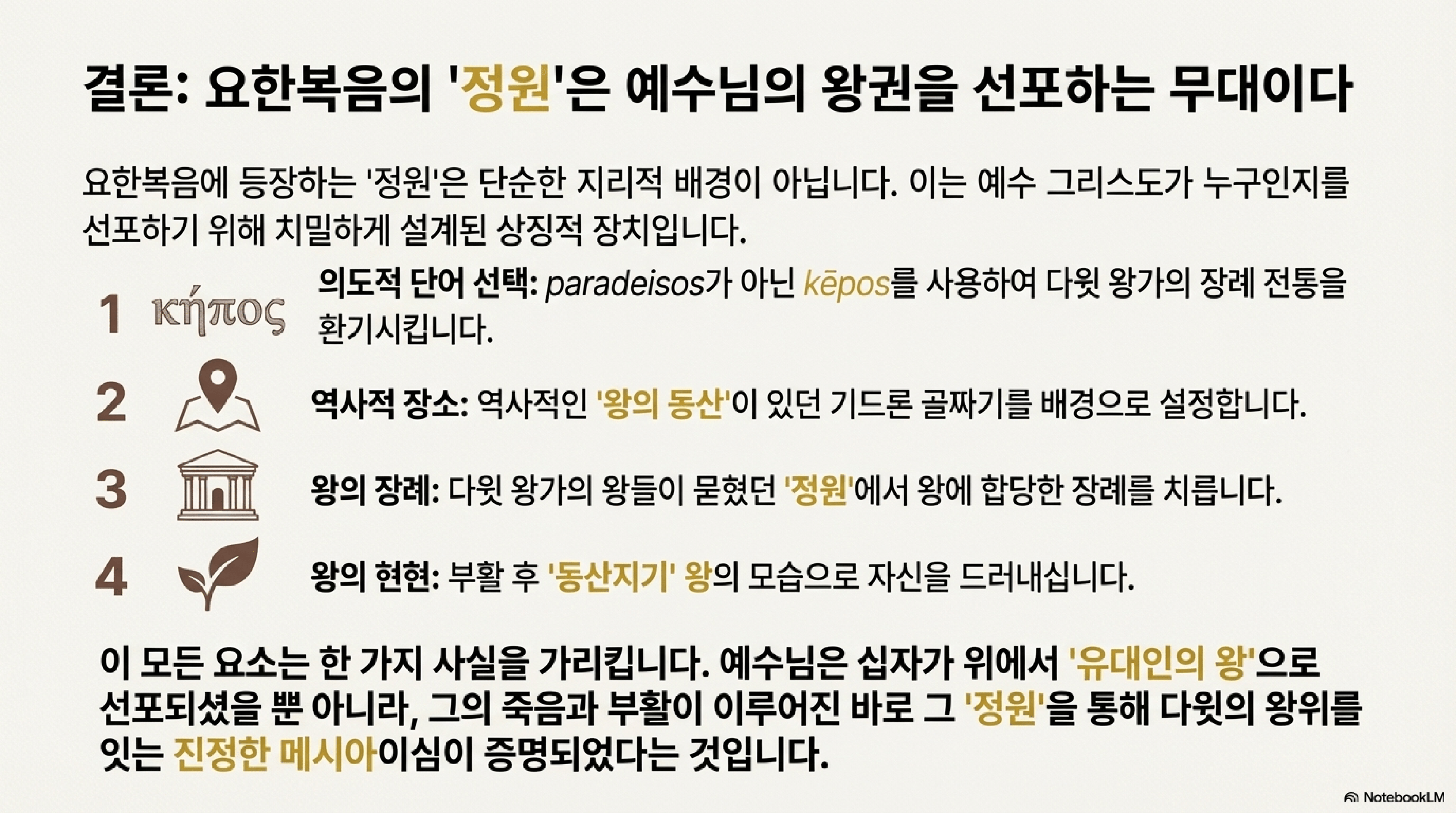 요한복음에 묘사된 정원은 단순한 사건의 배경이 아니다. 그것은 예수의 정체성에 대한 심오한 신학적 진술이다. 저자는 정원의 위치(기드론 골짜기의 왕의 정원), 예수의 역할(왕으로서의 정원사), 그리고 그의 장례(왕의 장례)를 통해 예수가 다윗의 왕위를 계승한 진정한 왕이자 메시아임을 일관되게 주장한다.
