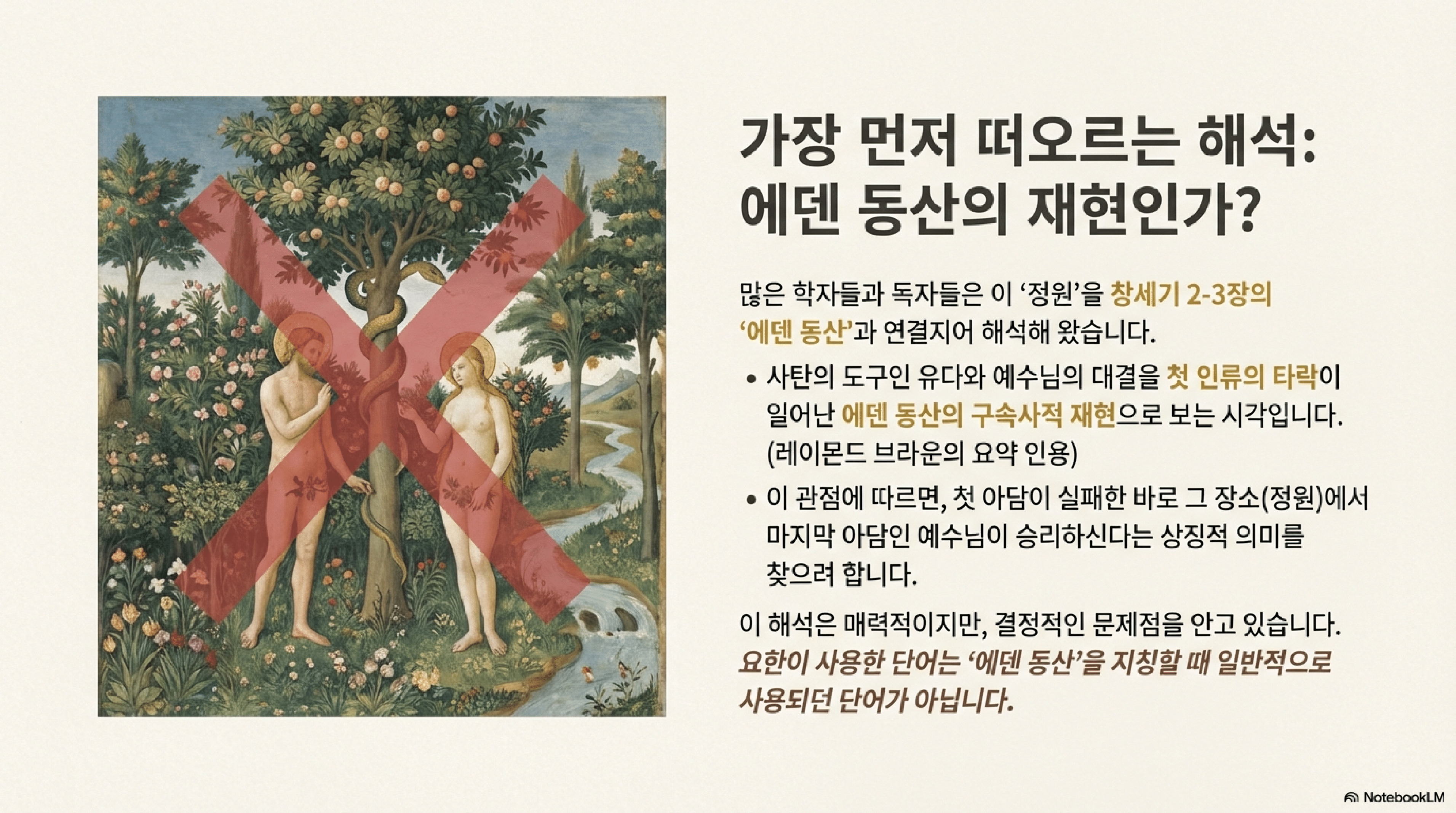 - 레이먼드 브라운 (Raymond Brown): 그는 정원이라는 모티프에 주목했지만, 요한이 '파라데이소스'라는 단어를 사용하지 않았다는 점과 후대 랍비 문헌에 근거하여 상징적 해석을 주저했다. 이는 성서 자체와 고대 근동의 더 넓은 문맥을 우선하지 않은 판단 착오이다.