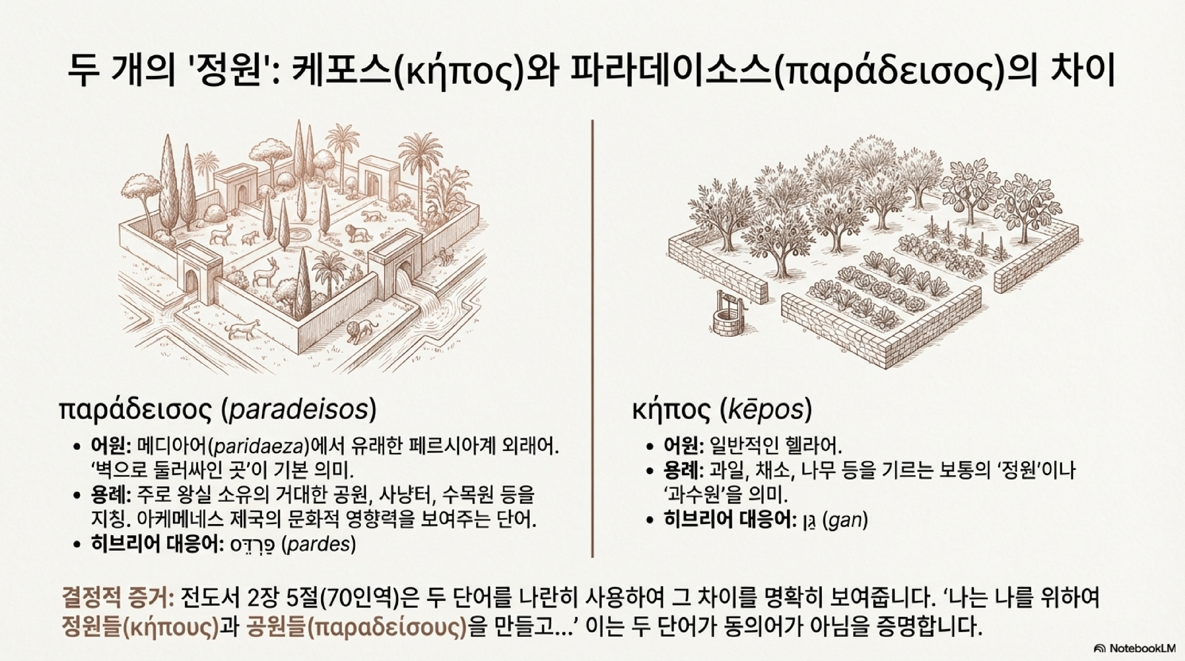 용어 (Term) 원어 (Original) 설명 (Description) 성서적 용례 (Biblical Usage) 간 (Gan) גַּן '정원' 또는 '공원'을 의미하는 일반적인 히브리어. 왕과 연관되어 사용됨. 예: 므낫세와 아몬 왕이 "그의 집 정원", "웃사의 정원"에 묻힘 (열왕기하 21:18, 26). 파르데스 (Pardes) פַּרְדֵּס 메디아어 *paridaeza('벽으로 둘러싸인 곳')에서 유래한 후기 페르시아계 외래어. 구약성서에 단 3회 등장하며(느 2:8, 전 2:5, 아 4:13) 모두 왕권적 함의를 가짐. 느헤미야 2장 8절의 "왕의 삼림"이 대표적 예시이다. 파라데이소스 (Paradeisos) παράδεισος '파르데스'의 그리스어 형태. 아케메네스 왕조 문화의 강한 영향을 받음. 70인역에서 '파르데스'를 번역하는 데 사용되며, 특히 창세기 2-3장의 '간'(에덴동산)을 번역할 때 독점적으로 사용되어 '낙원'의 개념과 연결됨. 케포스 (Kēpos) κῆπος '정원'을 의미하는 일반적인 그리스어. 70인역에서 므낫세와 아몬의 무덤(왕하 21장)과 같은 구절의 '간'을 번역하는 데 사용됨. 요한복음에서 예수의 체포 및 매장 장소를 지칭하는 데 사용된 핵심 용어이다.