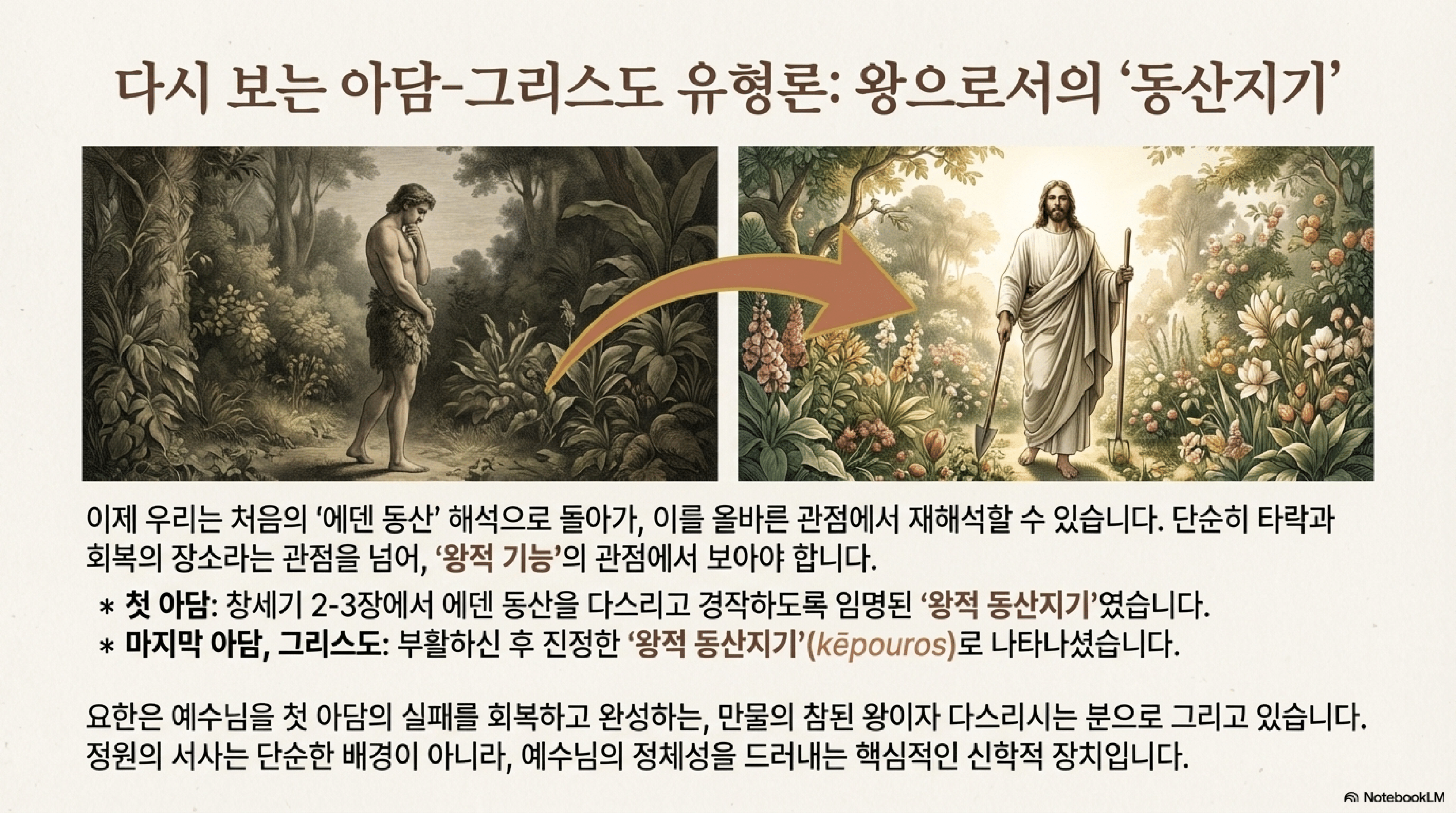 - 두 번째 아담: 이 묘사는 창세기 2-3장과의 연관성을 다시 불러일으킨다. 에덴이라는 왕의 정원을 가꾸는 왕적 인물이었던 첫 번째 아담과 같이, 그리스도는 부활이 일어난 정원의 '정원사'로서 '두 번째 아담'이자 인류를 회복시키는 왕적 메시아로 제시된다.