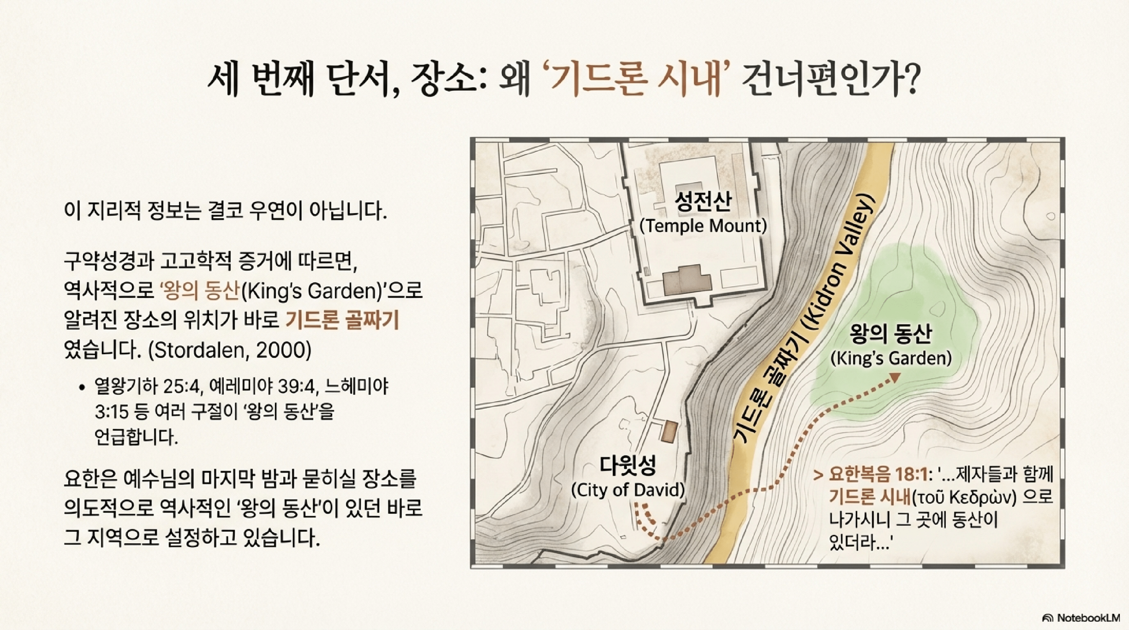 - 기드론 골짜기: 요한복음 18장 1절은 예수와 제자들이 들어간 정원이 "기드론 시내 건너편"에 있었다고 명시한다. 고고학적 증거와 성서 기록(왕하 25:4, 렘 39:4 등)에 따르면, 역사적인 '왕의 정원'은 바로 이 기드론 골짜기에 위치했을 가능성이 매우 높다.