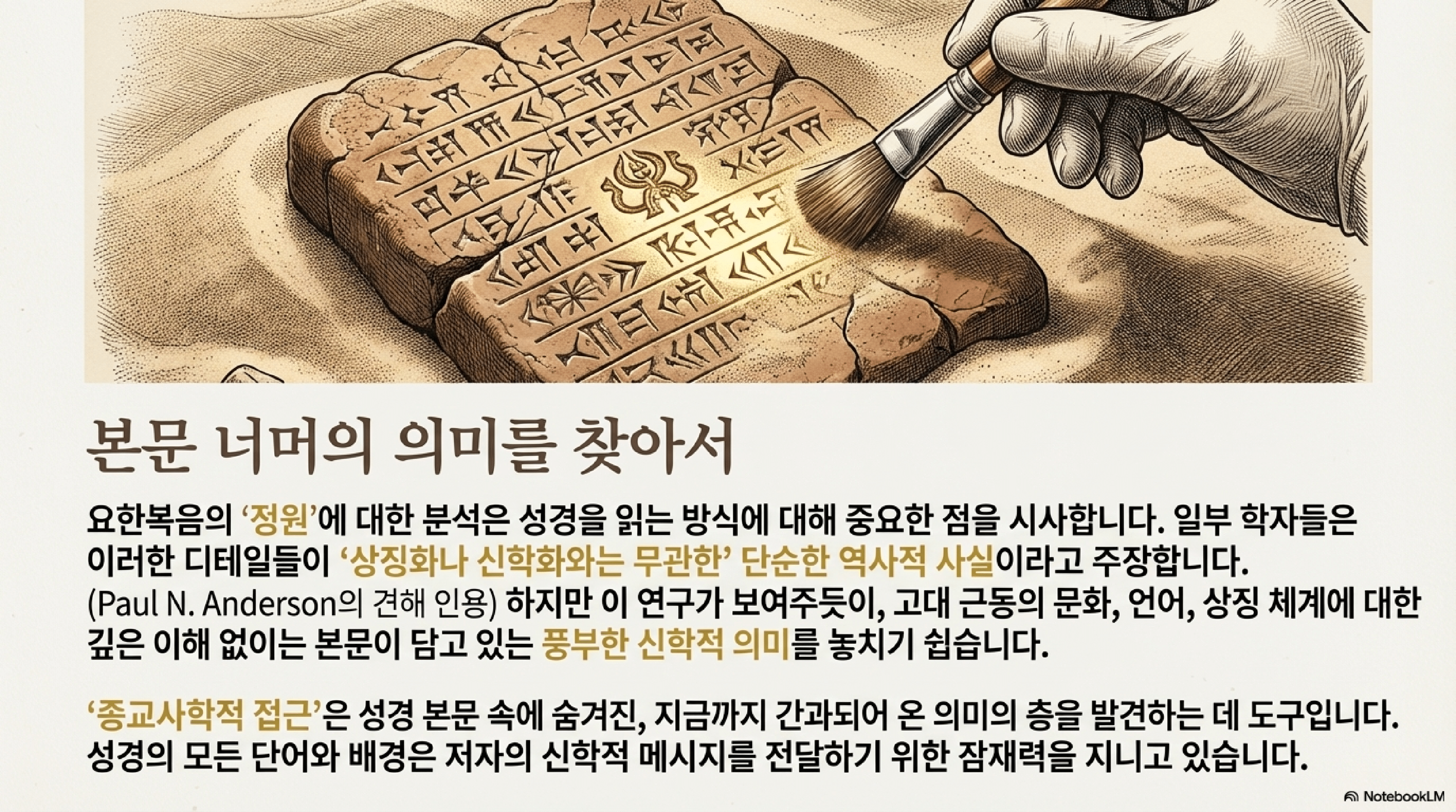결론적으로, 요한복음의 정원은 단순한 배경이 아니라 예수의 왕권과 메시아적 정체성을 선포하는 고도로 계산된 신학적 장치이다. 이 분석은 기존의 주석가들이 '낙원' 개념에 집착하여 간과했던 요한복음의 중요한 상징적 차원을 밝혀내며, 고대 근동의 역사-문화적 맥락을 고려하는 종교사적 접근법의 중요성을 입증한다.