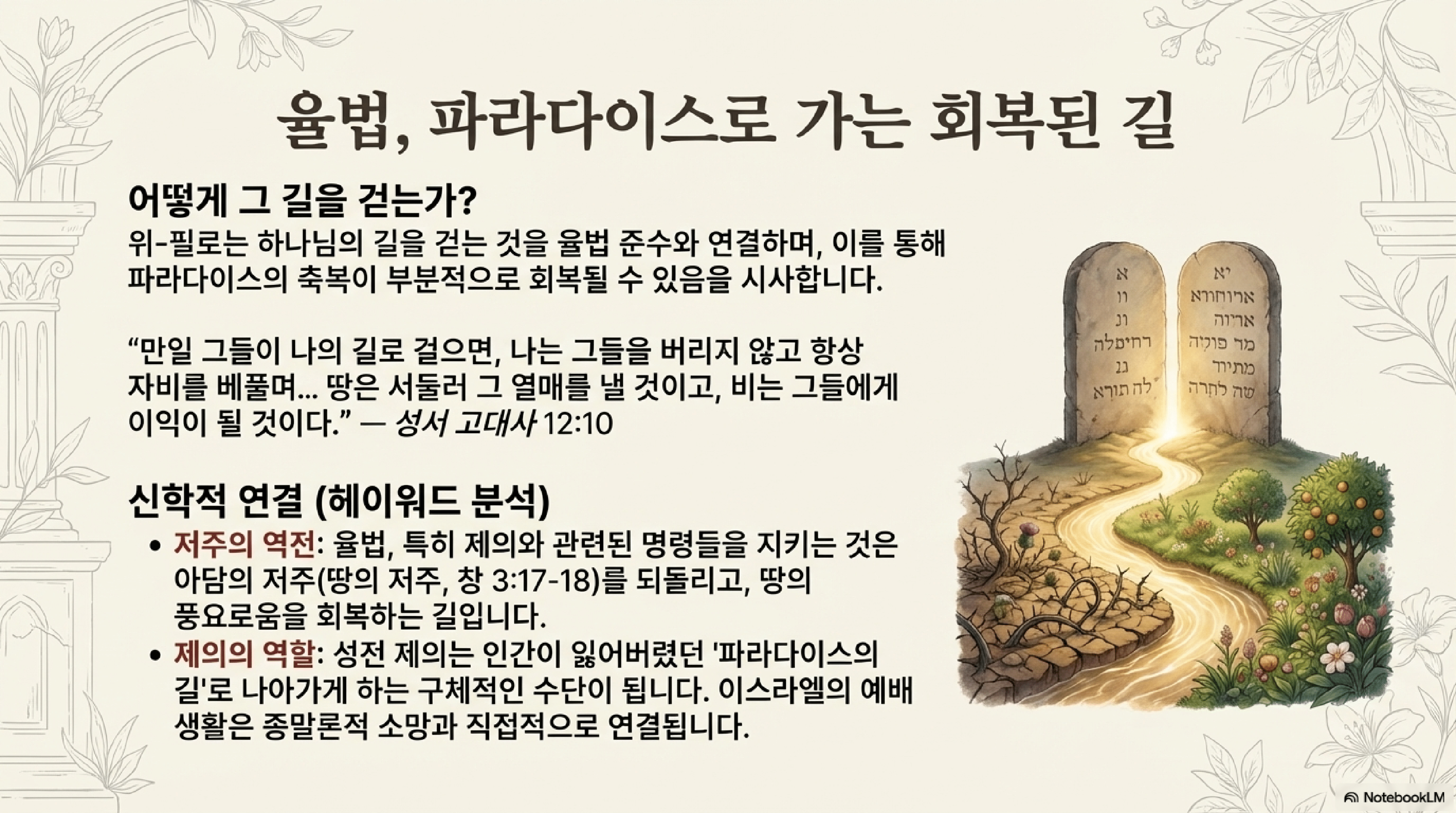 - '낙원의 길'의 이중적 의미: "낙원의 길"이라는 표현은 문자적으로 인간이 죄로 인해 잃어버린 낙원의 입구를 의미하는 동시에, 은유적으로는 의로운 삶의 방식을 상징한다. 율법을 지키는 삶이 낙원적 풍요를 회복하는 길임을 암시한다.