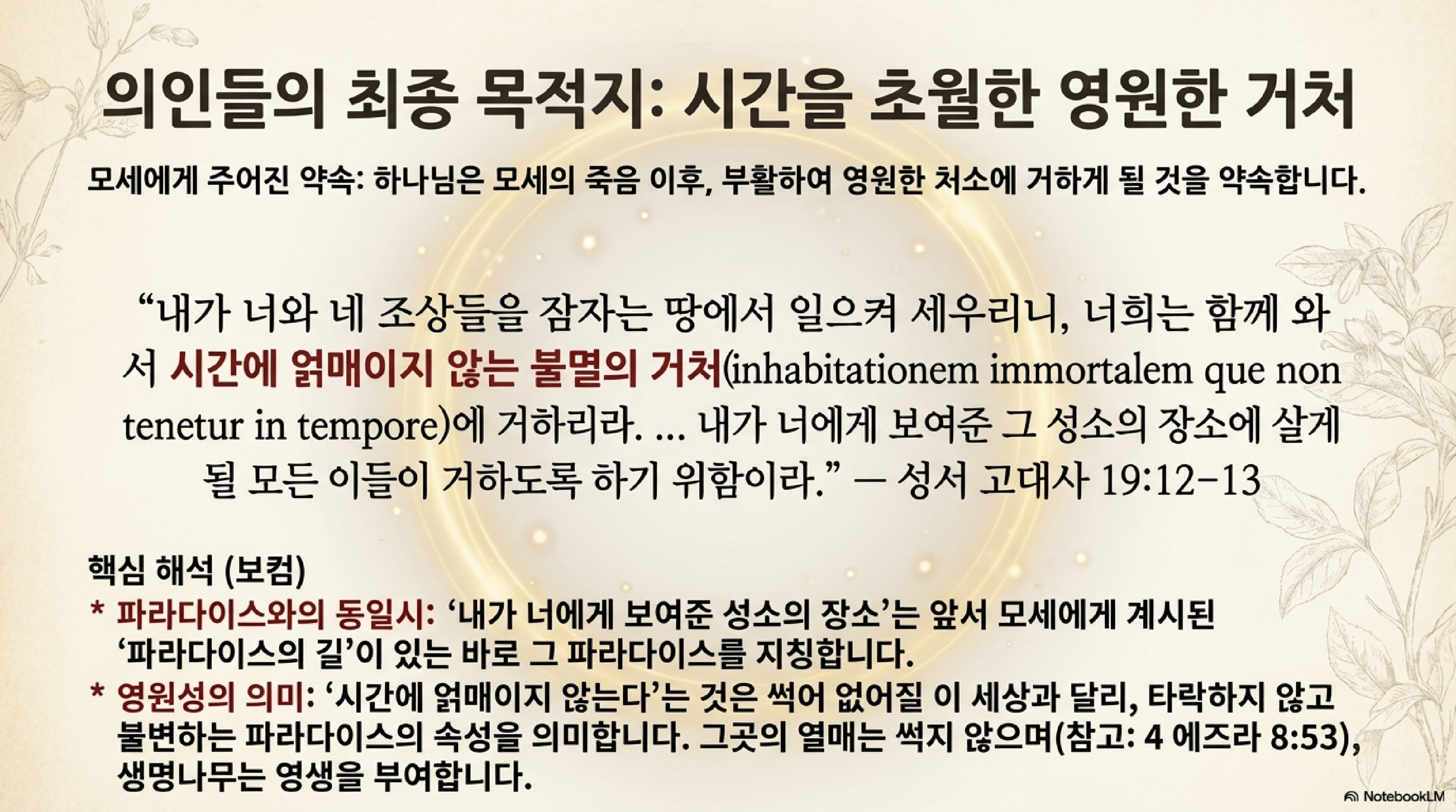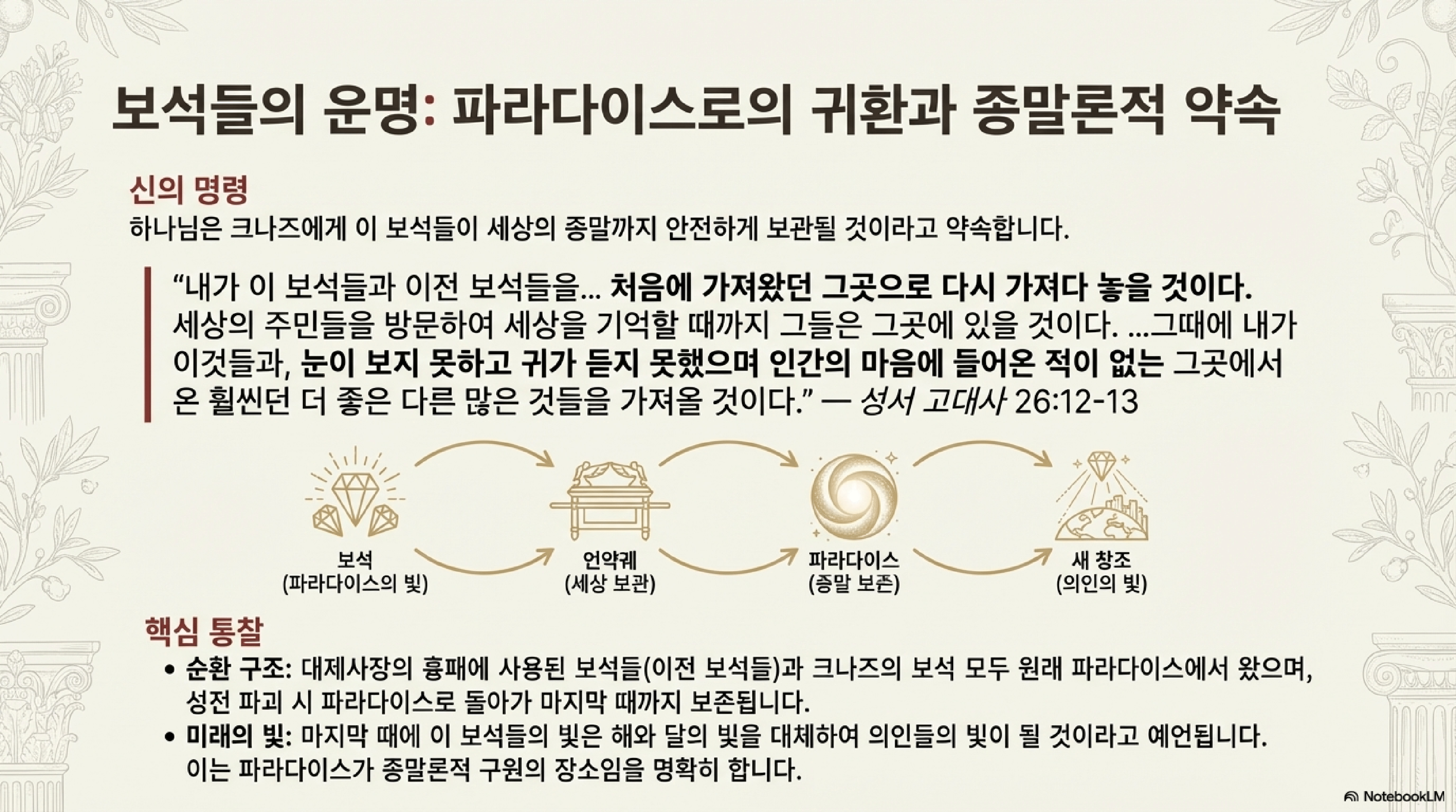- 하나의 낙원: 창세기의 에덴은 사라진 것이 아니라 보존되어 있으며, 마지막 때에 의인들이 돌아갈 영원한 처소이다.