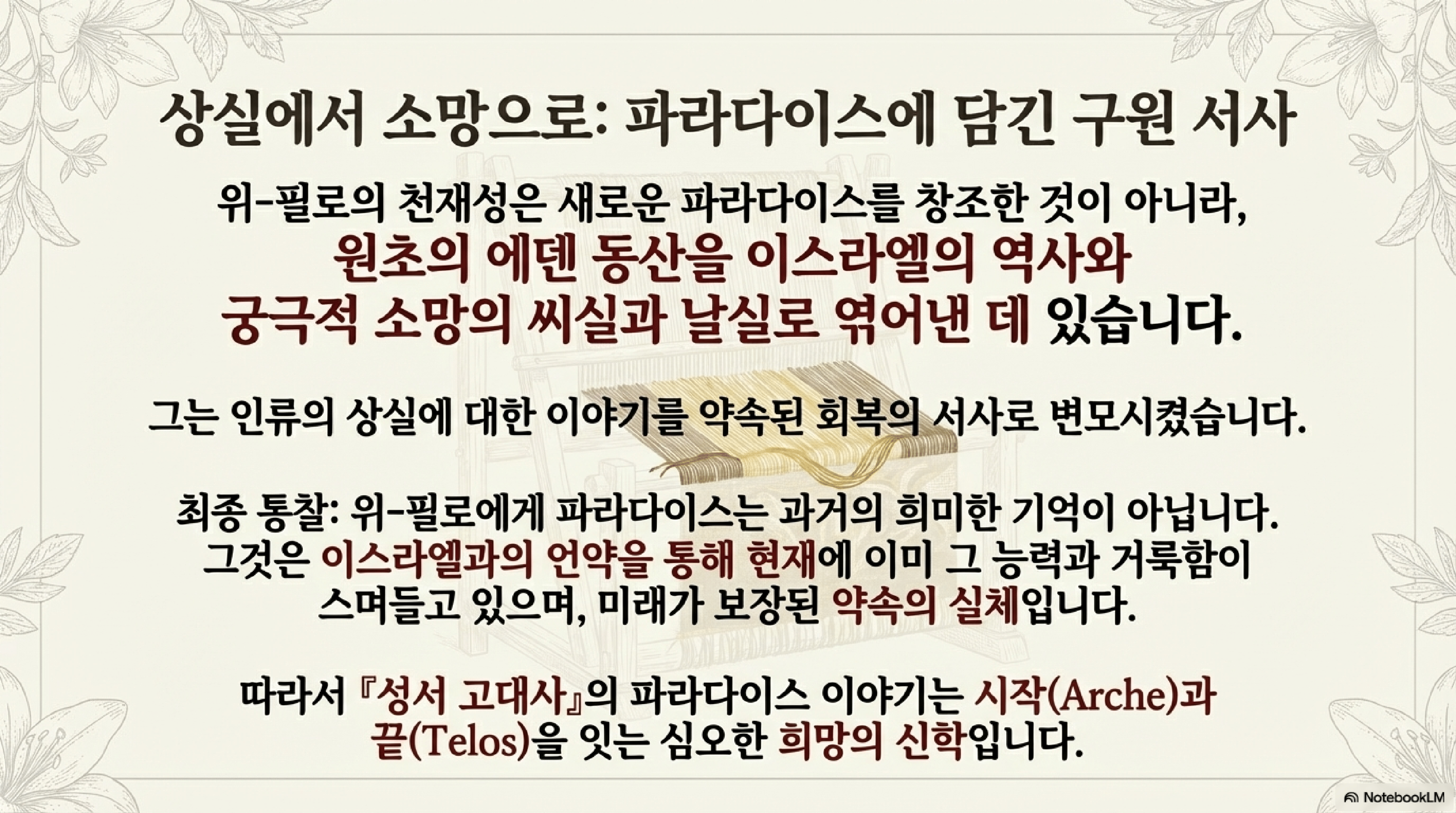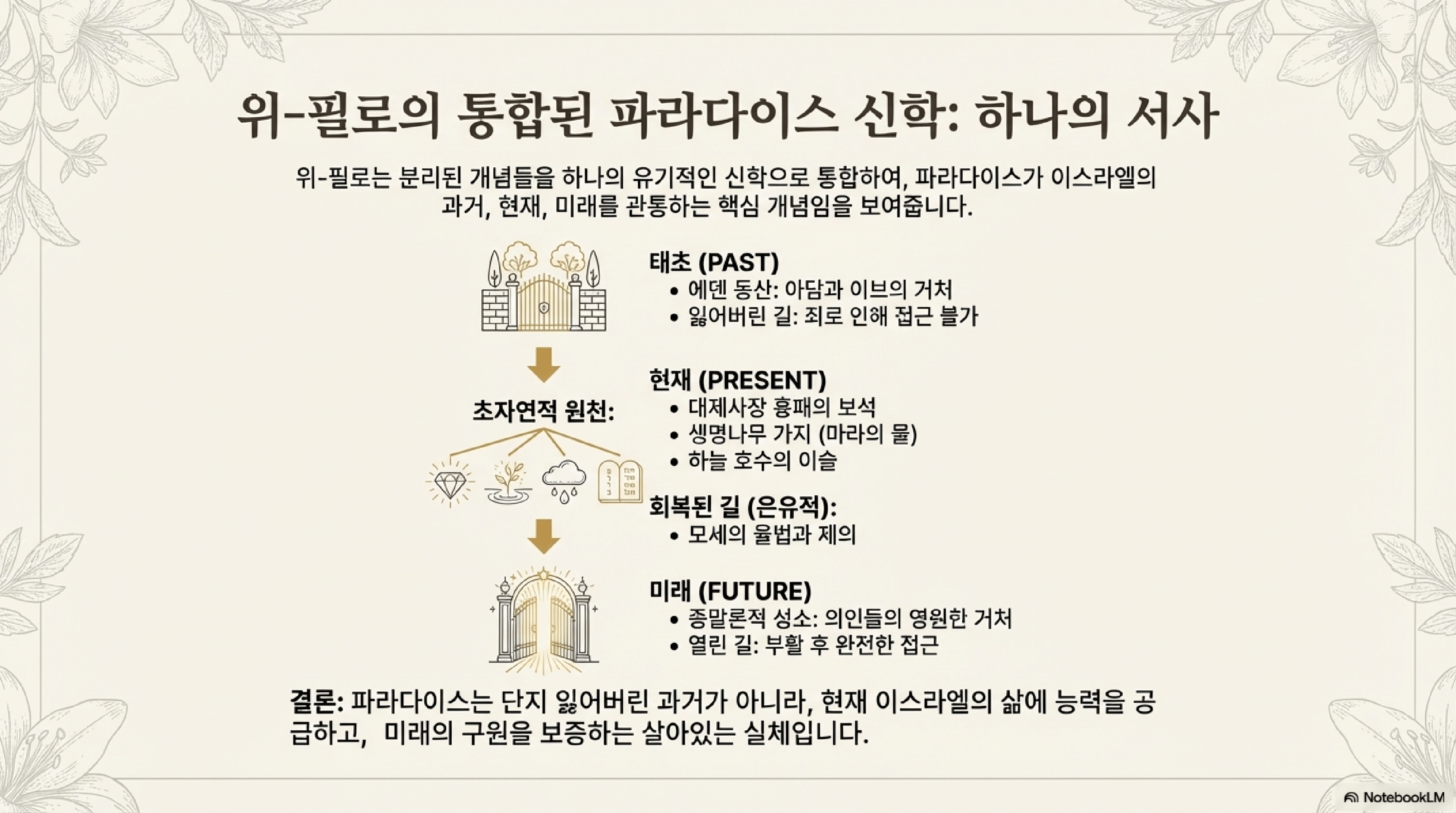 - 구속사와의 연결: 이스라엘의 성물과 구원 사건들은 낙원과 직접적으로 연결되어 있으며, 이는 이스라엘의 역사가 신적인 기원과 종말론적 목적을 지니고 있음을 강조한다.
