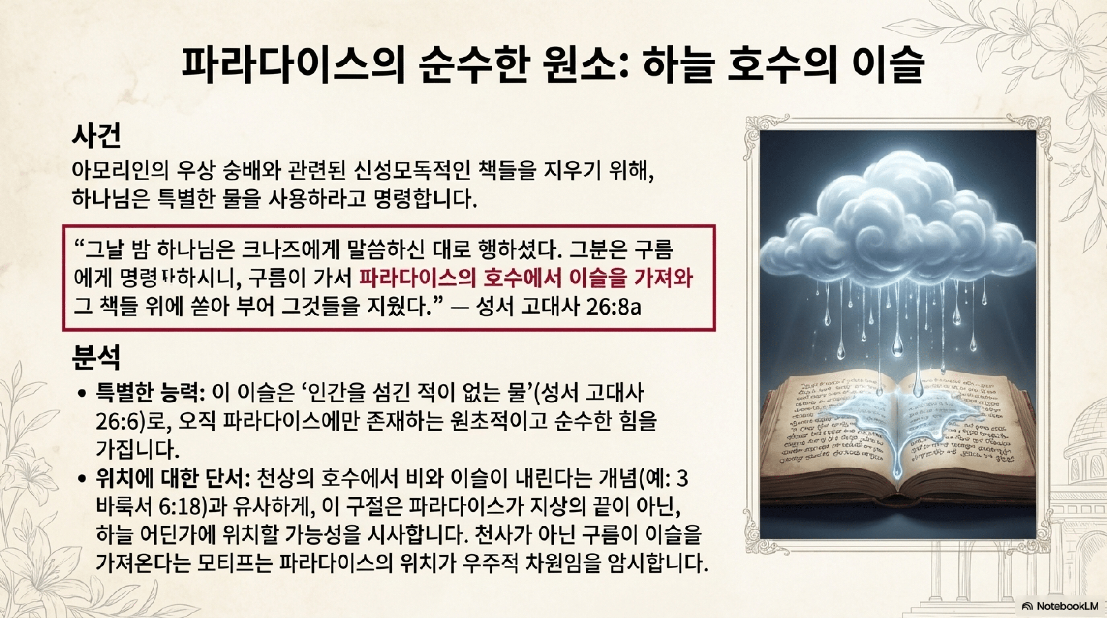 - 낙원의 호수 (26.8a): 하나님은 아모리인의 우상숭배와 관련된 책들을 지우기 위해 구름에게 "낙원의 호수에서 이슬을 가져오라"고 명령하신다. 이슬이나 비의 근원을 천상에서 찾는 다른 문헌들(예: 『바룩 3서』 6장)과 비교할 때, 이 구절은 낙원이 천상에 존재함을 강력히 시사한다.