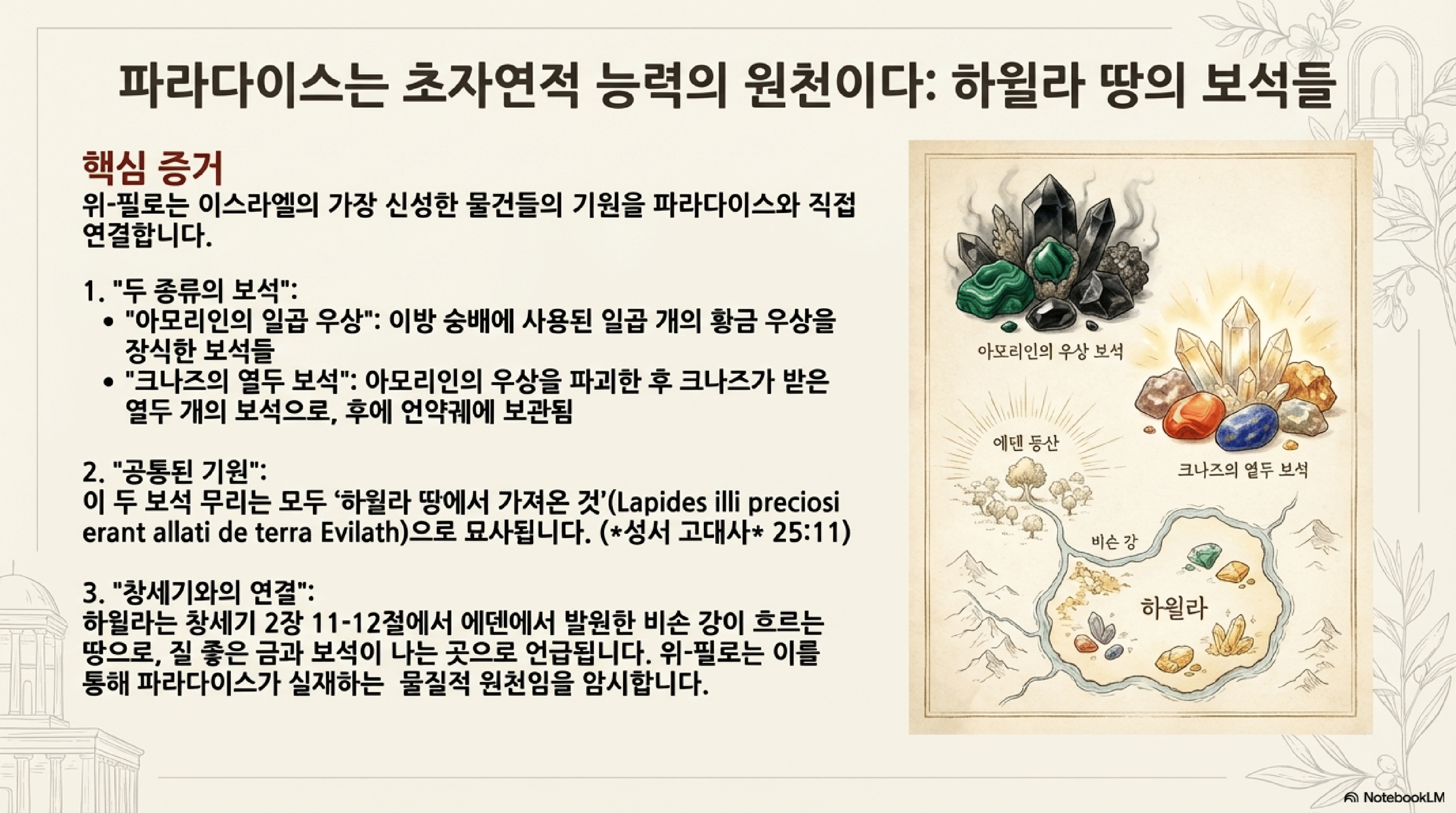 - 하윌라 땅 (25.11): 보석의 기원으로 언급된 "하윌라 땅"은 창세기 2장 11-12절에 따라 에덴동산에서 흘러나온 강이 감싸는 지상의 장소이다.