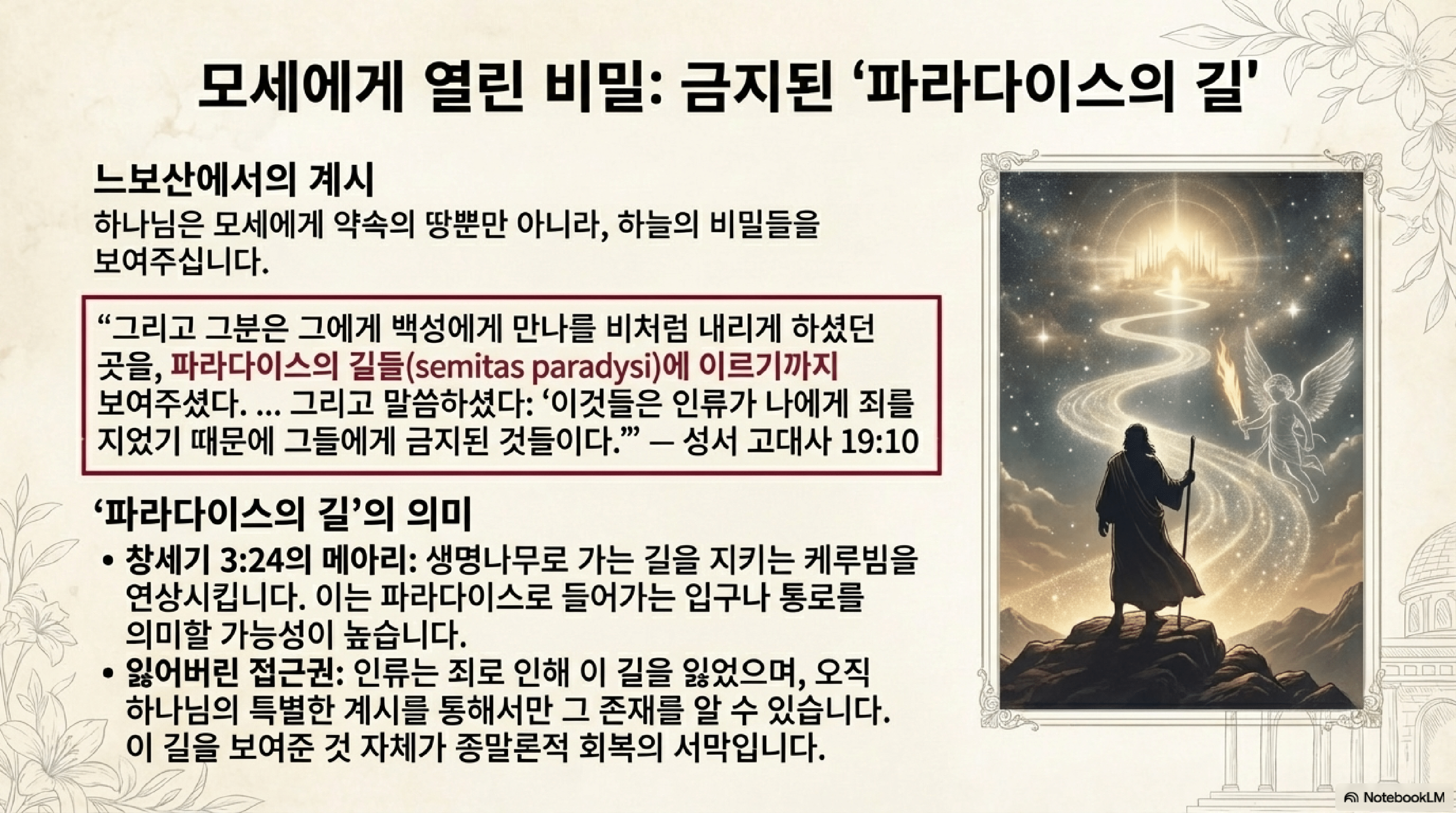 - 계시의 대상: 이 길은 일반 인간에게는 금지되었지만, 모세와 같은 특별한 인물에게는 계시를 통해 보여진다. 이는 낙원이 여전히 실재하며, 하나님의 허락 없이는 접근할 수 없는 비밀의 장소임을 강조한다.