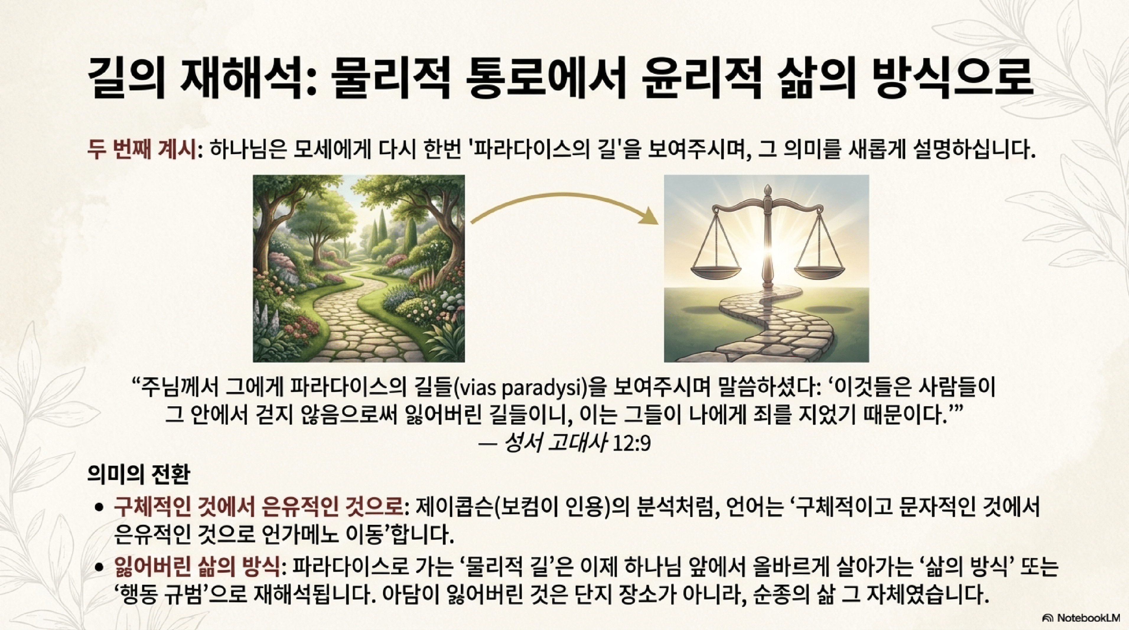 - 상실된 통로: 하나님은 이 길에 대해 "이것이 인간들이 내게 죄를 지었으므로 그 안에서 걷지 않음으로써 잃어버린 길이다"(13.9)라고 설명하신다. 이는 창세기 3장 24절에서 그룹들과 불 칼이 "생명 나무에 이르는 길"을 지키게 된 사건을 상기시킨다. 즉, '낙원의 길'은 죄로 인해 인류에게 닫혀버린 낙원의 입구나 통로를 의미한다.