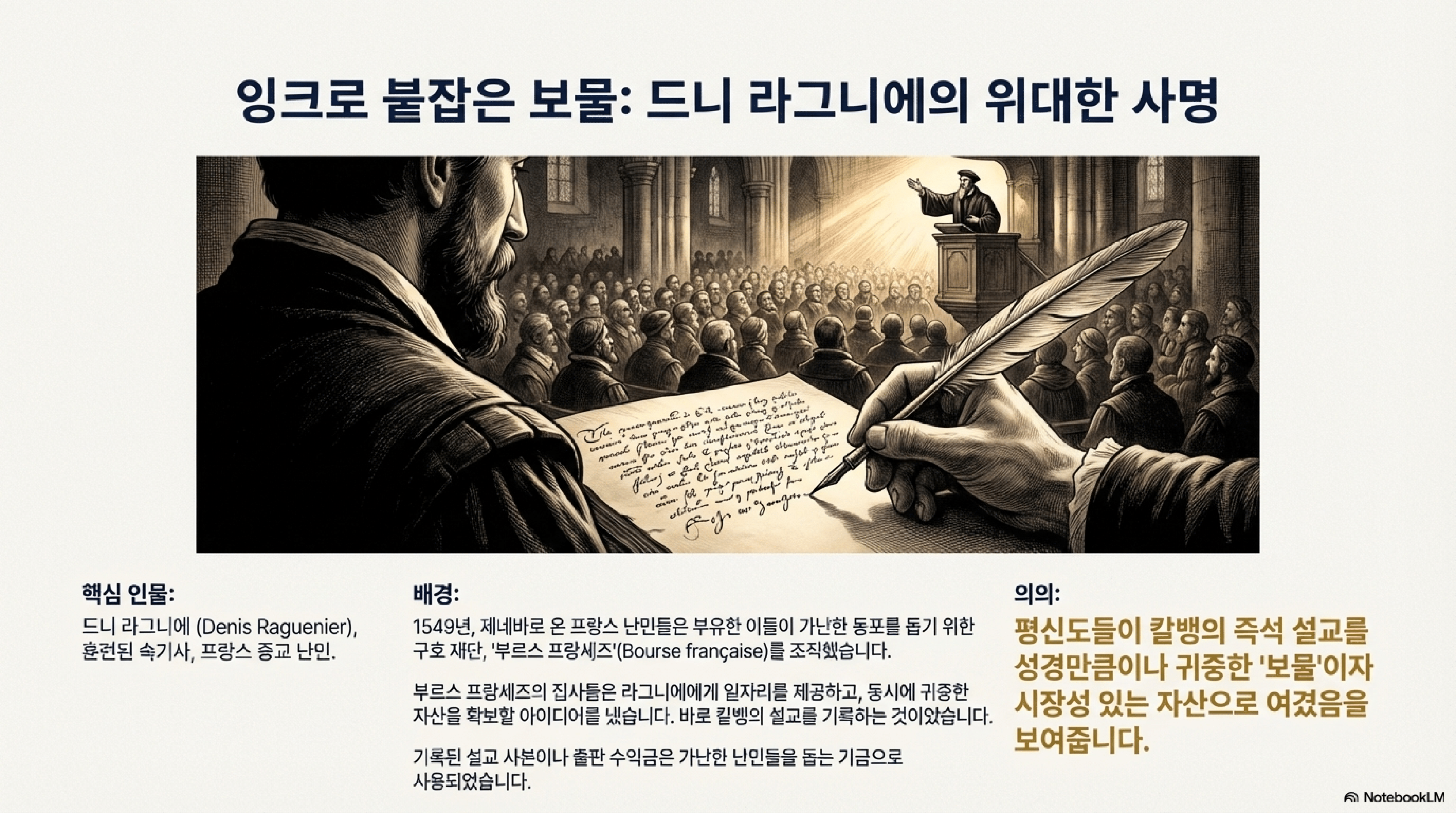 - 프랑스 자선기금의 구상: 자선기금은 라그니에에게 일자리를 제공하는 동시에, 칼뱅 설교라는 귀중한 자산을 확보하고자 했다. 출판된 설교의 판매 수익은 가난한 망명자들을 돕는 기금으로 사용되었다. 이는 평신도들이 칼뱅의 즉흥 설교를 성경만큼이나 가치 있는 '보물'로 여겼음을 보여준다.