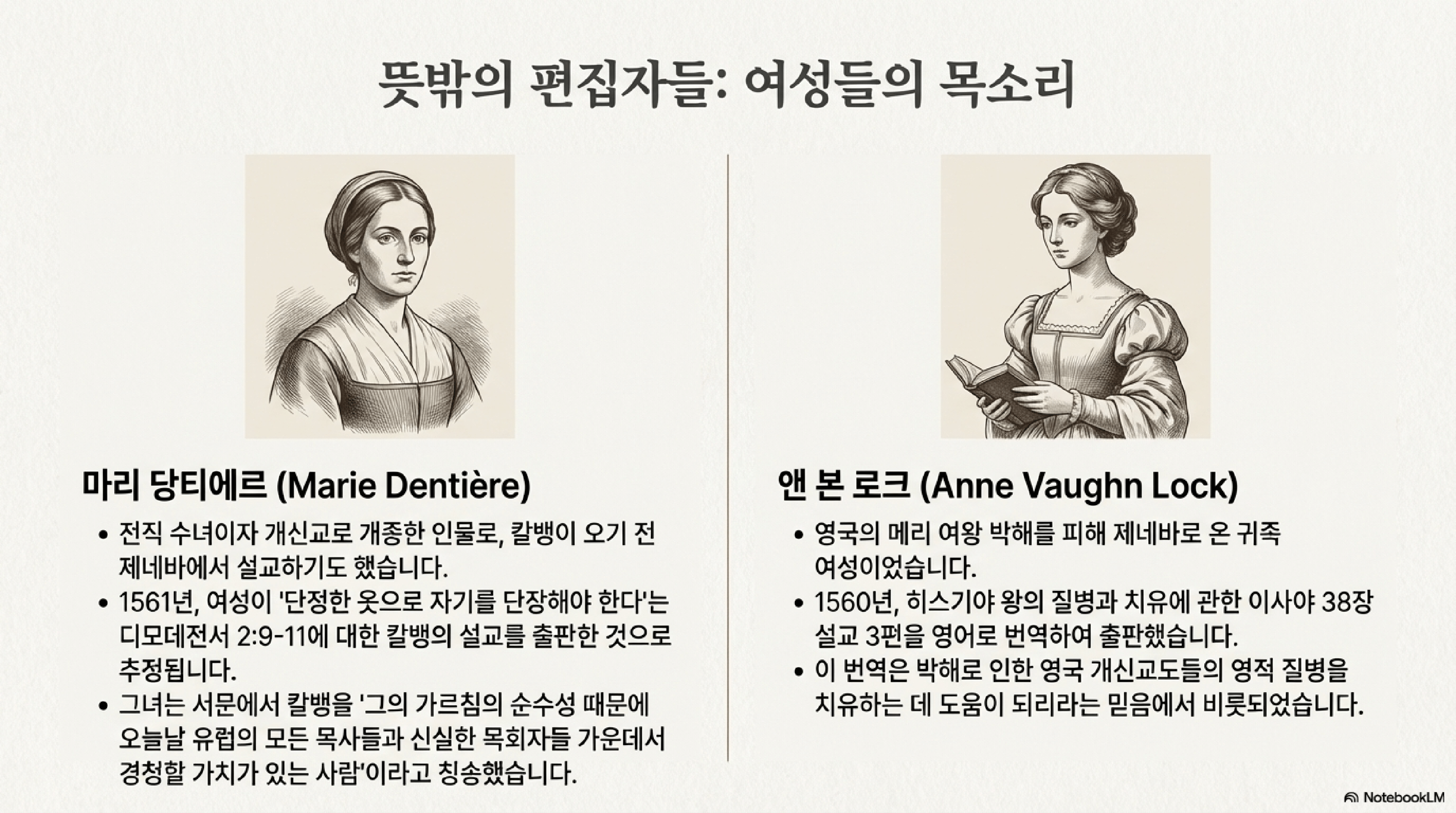 - 마리 당티에르(Marie Dentière): 전직 수녀였던 그녀는 1561년, 여성이 옷차림에서 단정함을 지켜야 한다는 내용의 디모데전서 2:9-11 설교 한 편을 출판한 것으로 추정된다. 이는 16세기 종교개혁에서 젠더 이슈가 예상보다 복잡했음을 보여준다.