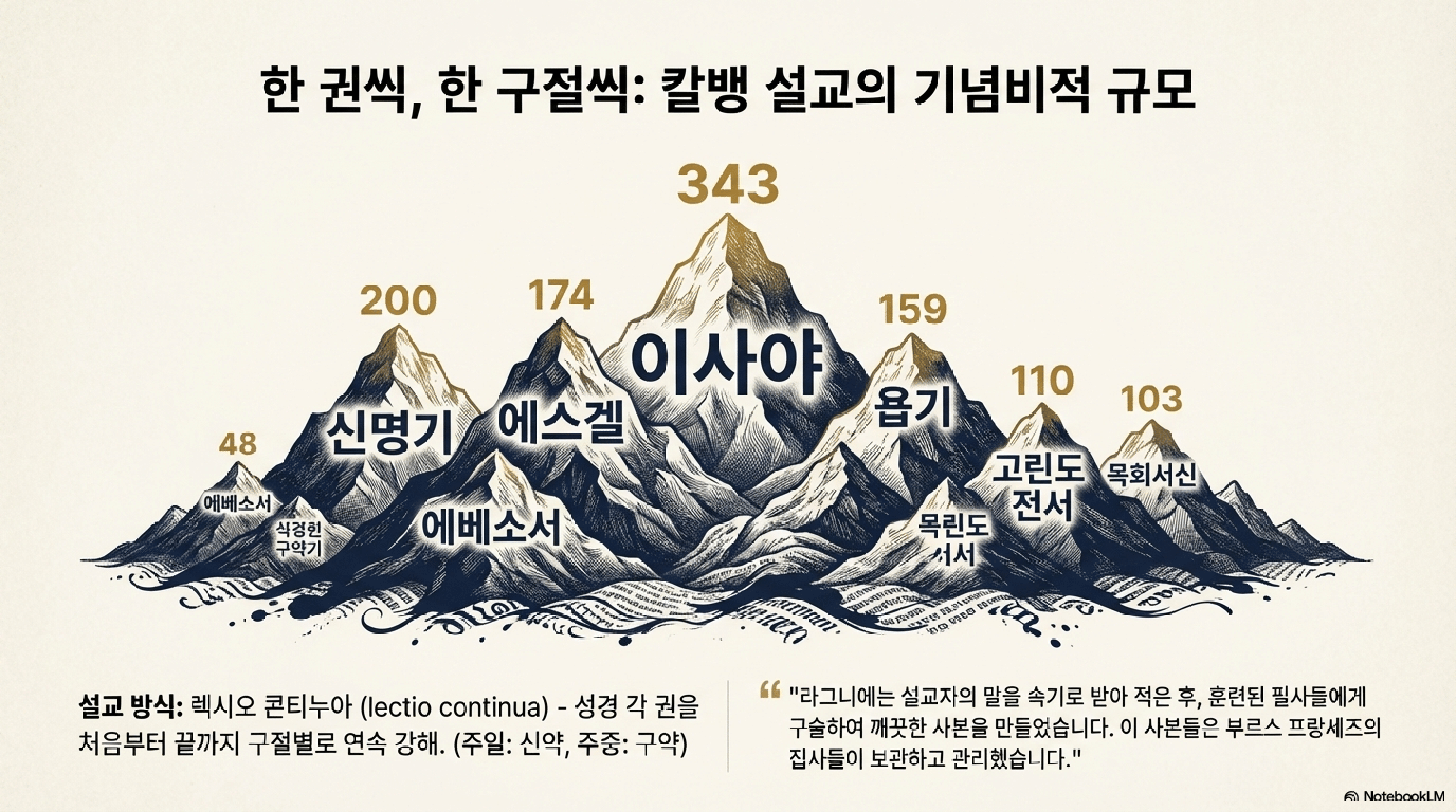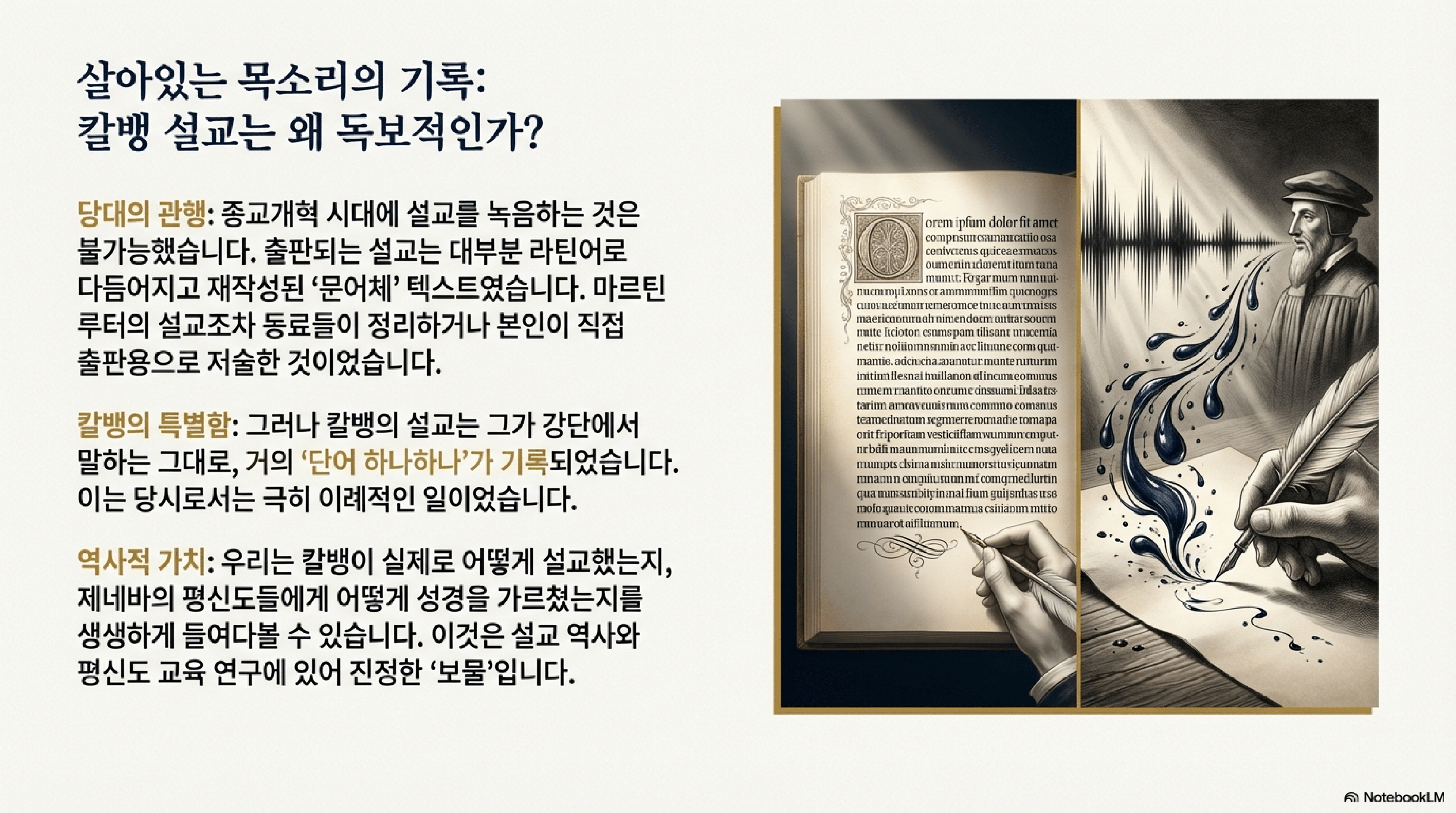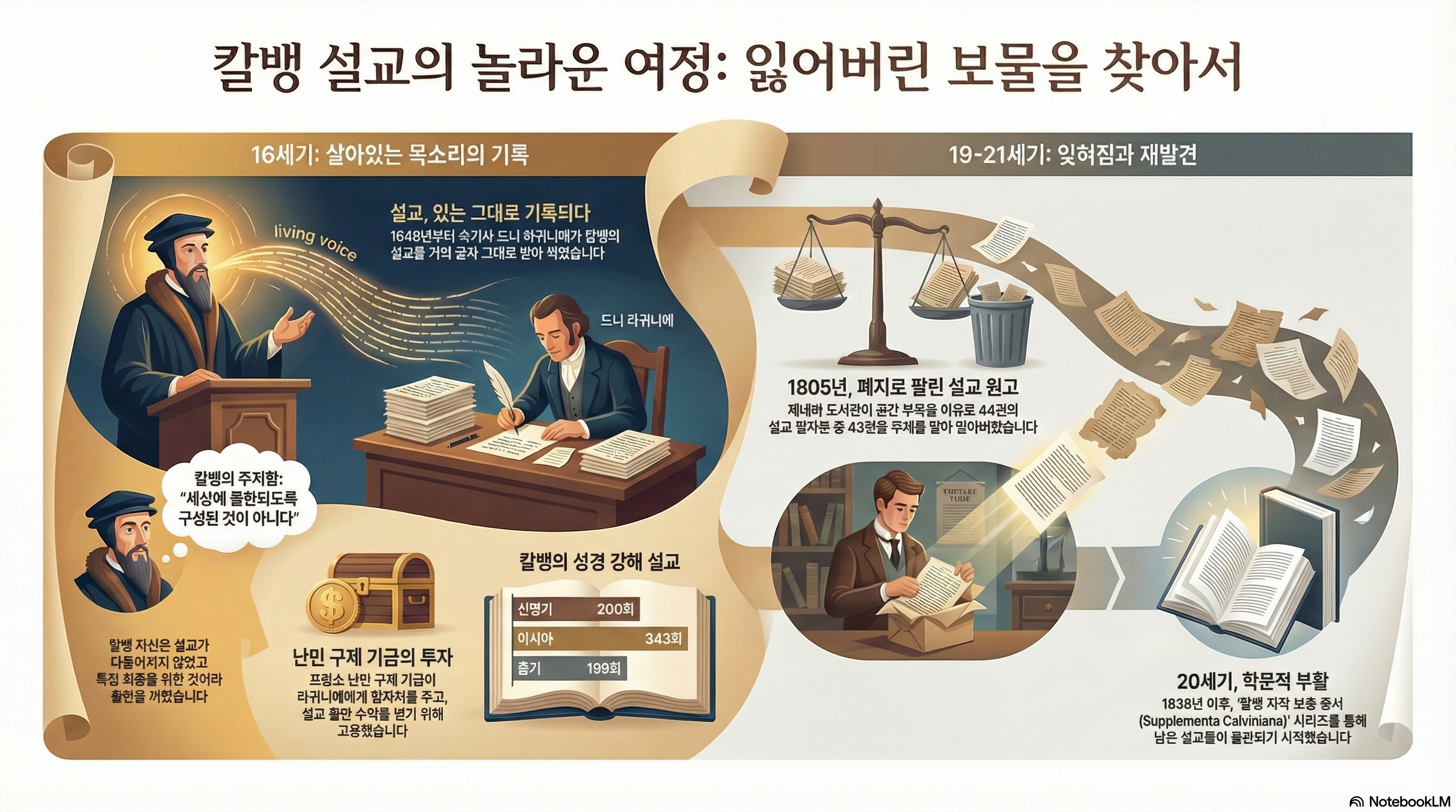 핵심 내용은 다음과 같다.- 독특한 보존 방식: 칼빈의 설교는 출판을 위해 다듬어진 텍스트가 아니라, 그가 강단에서 선포한 내용을 거의 그대로 받아 적은 속기록이라는 점에서 매우 독특하다. 이는 프랑스인 망명자이자 속기사였던 드니 라그니에(Denis Raguenier)와 그를 고용한 프랑스 자선기금(Bourse française)의 노력 덕분에 가능했다.