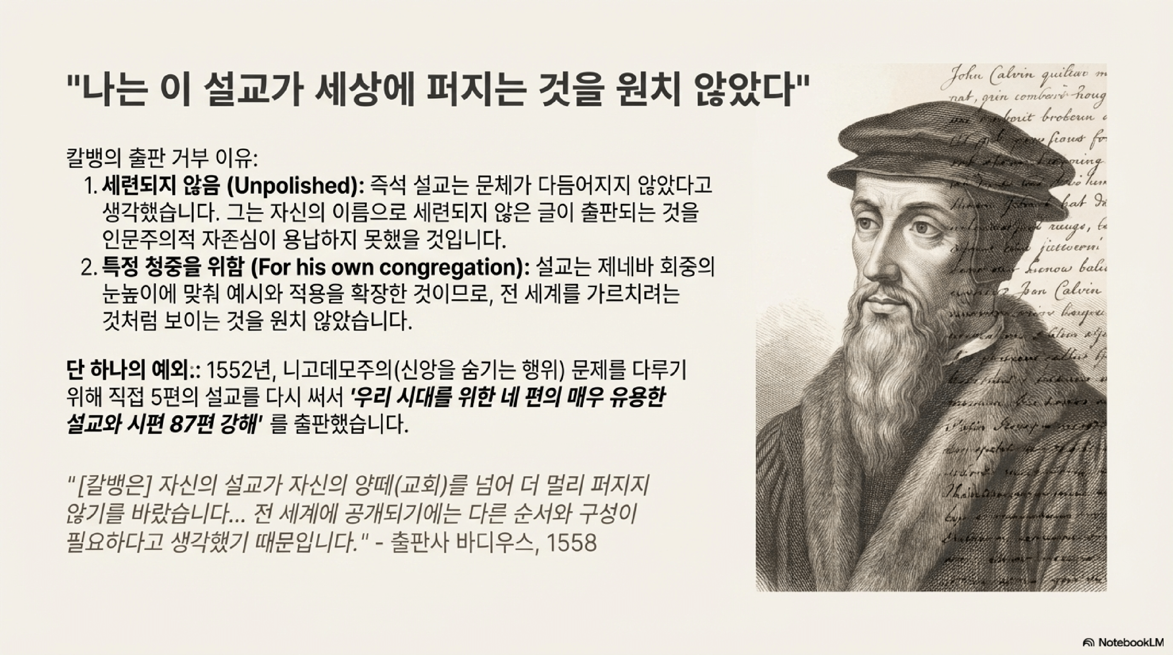- 청중의 특수성: 설교는 제네바의 평범한 교인들의 이해 수준에 맞춰 예시와 적용을 확장한 것이므로, 전 세계를 가르치려는 듯 널리 퍼지는 것이 적절치 않다고 생각했다.
