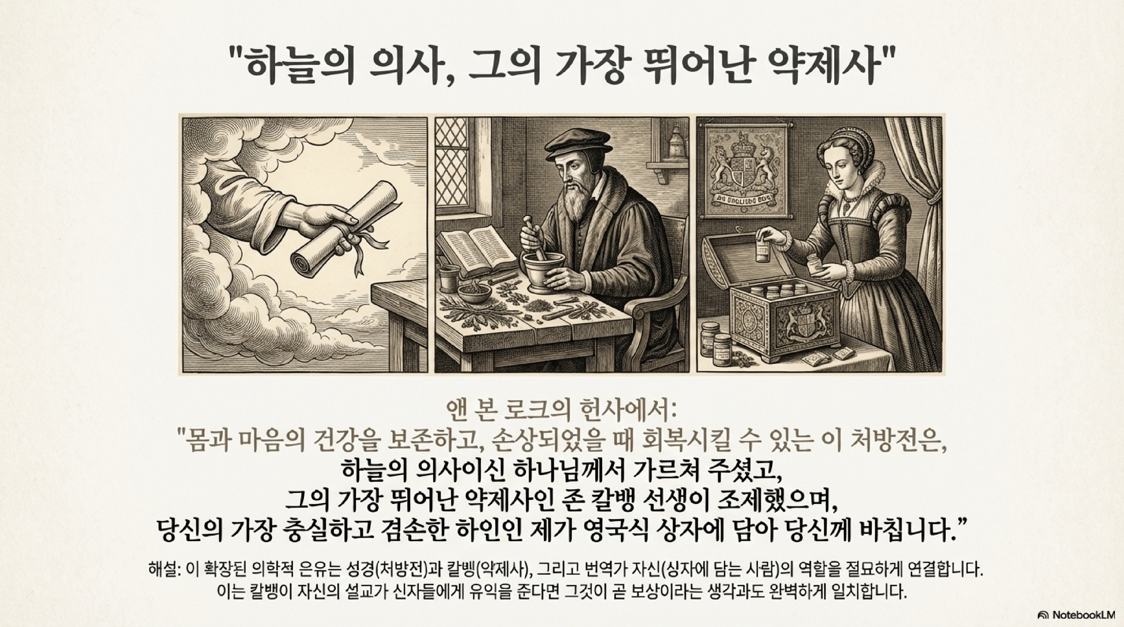 "이 처방전은 하늘의 의사이신 하나님께서 가르치셨고, 그의 가장 뛰어난 약제사인 존 칼뱅 선생이 조제했으며, 당신의 가장 큰 은혜를 입은 비천한 제가 영국 상자에 담아 당신께 바칩니다."