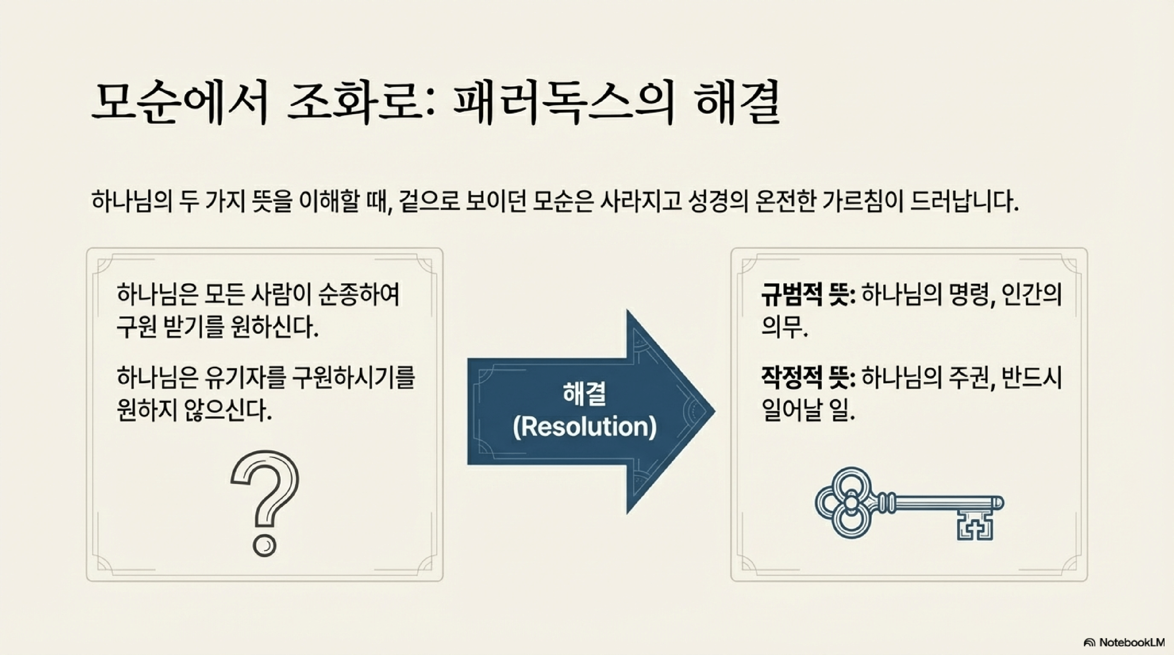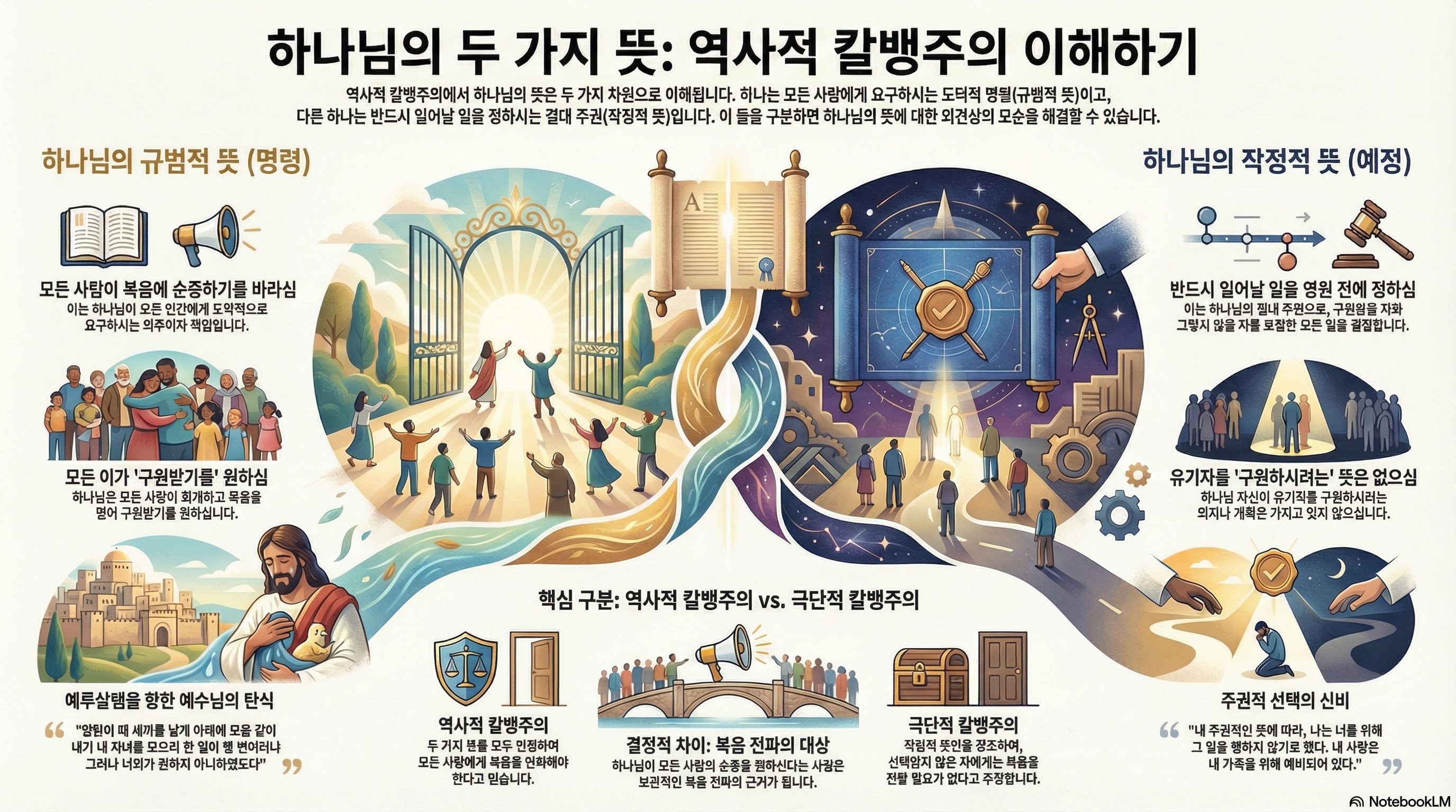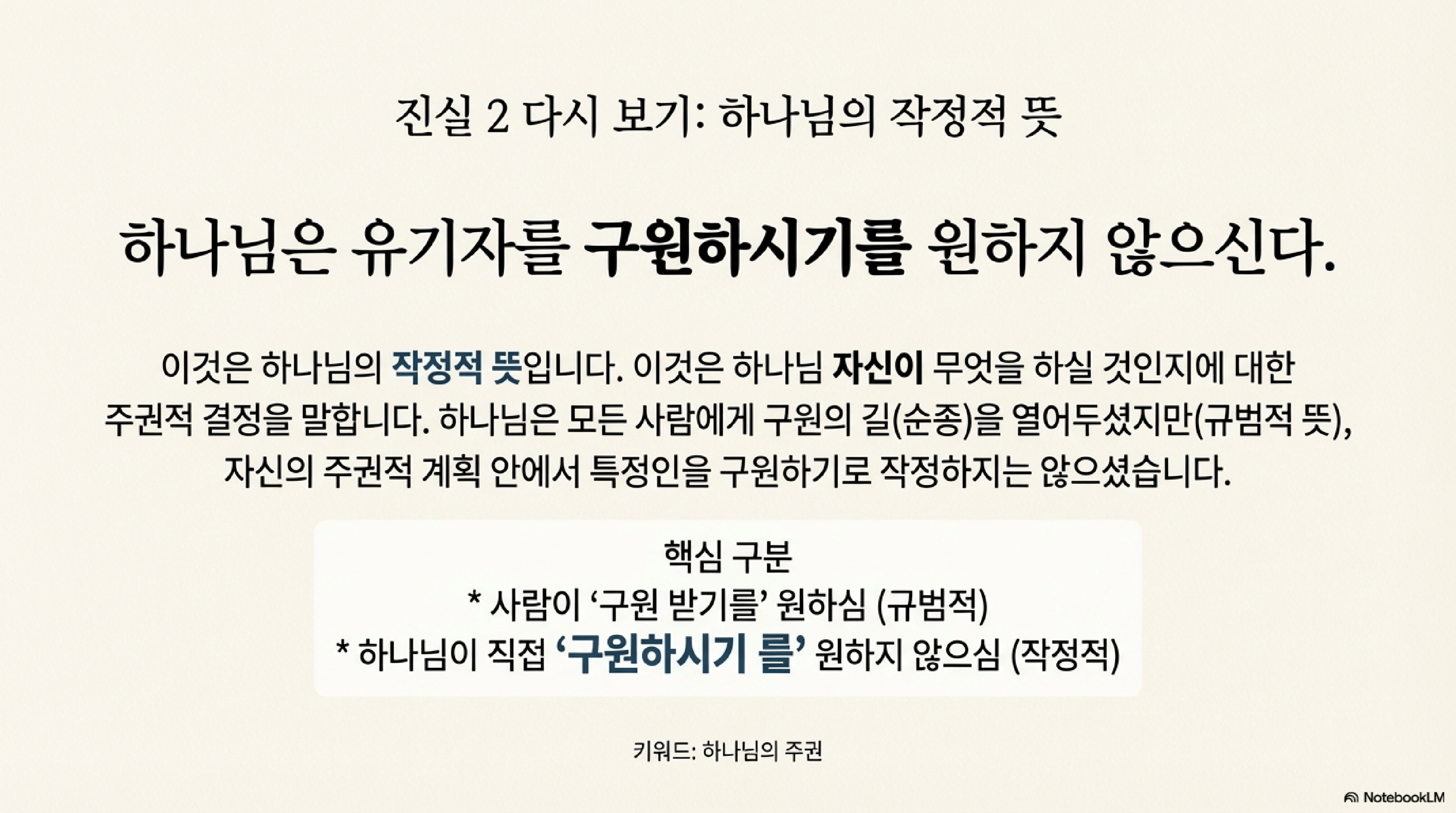 - 결론: 작정적 뜻은 실제로 일어나는 일을 결정하는 반면, 명령적 뜻은 인간이 마땅히 해야 할 바를 규정한다.