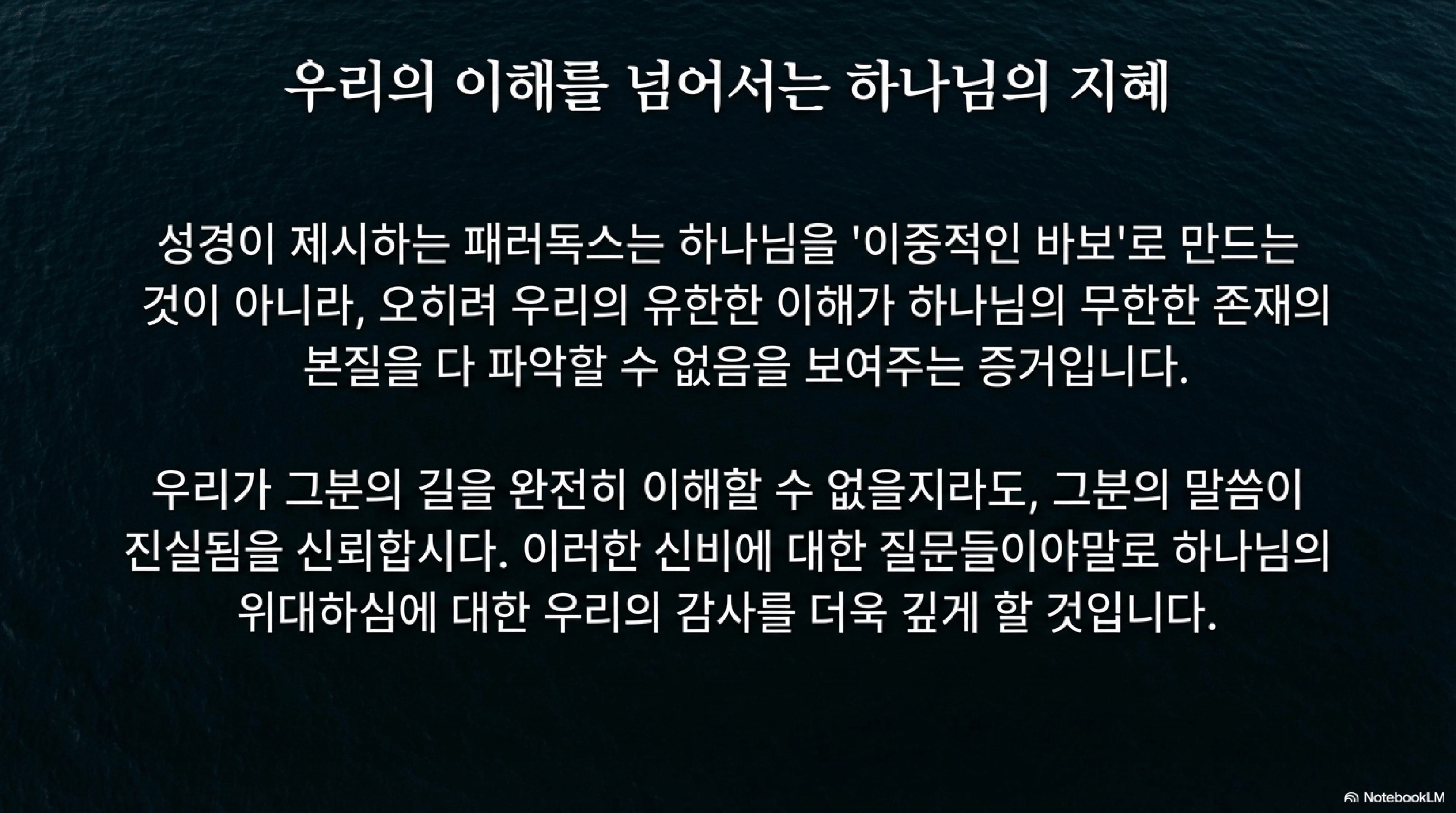 - 적용: 이처럼 유한한 인간도 동일한 대상을 두고 여러 수준의 소망을 가질 수 있다면, 무한하신 하나님께서 여러 차원의 뜻을 가지시는 것은 충분히 가능하다. 이는 우리가 하나님의 방식을 완전히 이해할 수 없을지라도, 계시된 진리를 신뢰하며 그분의 무한한 지혜를 더욱 깊이 인식하게 한다.
