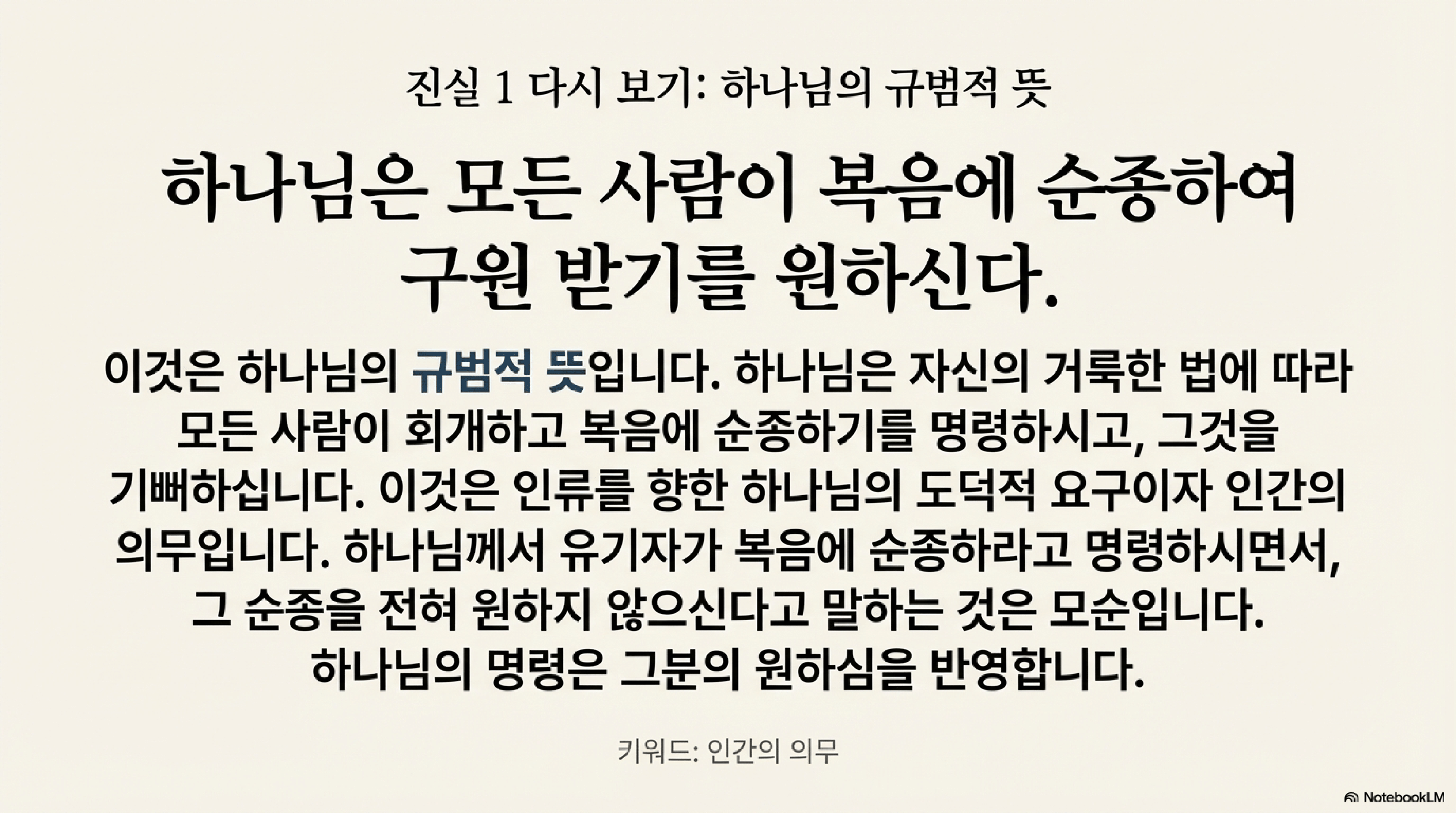 - 내용: 하나님은 모든 사람이 그의 뜻에 순종하기를 원하신다. 여기에는 회개하고 복음을 믿으라는 명령도 포함된다.