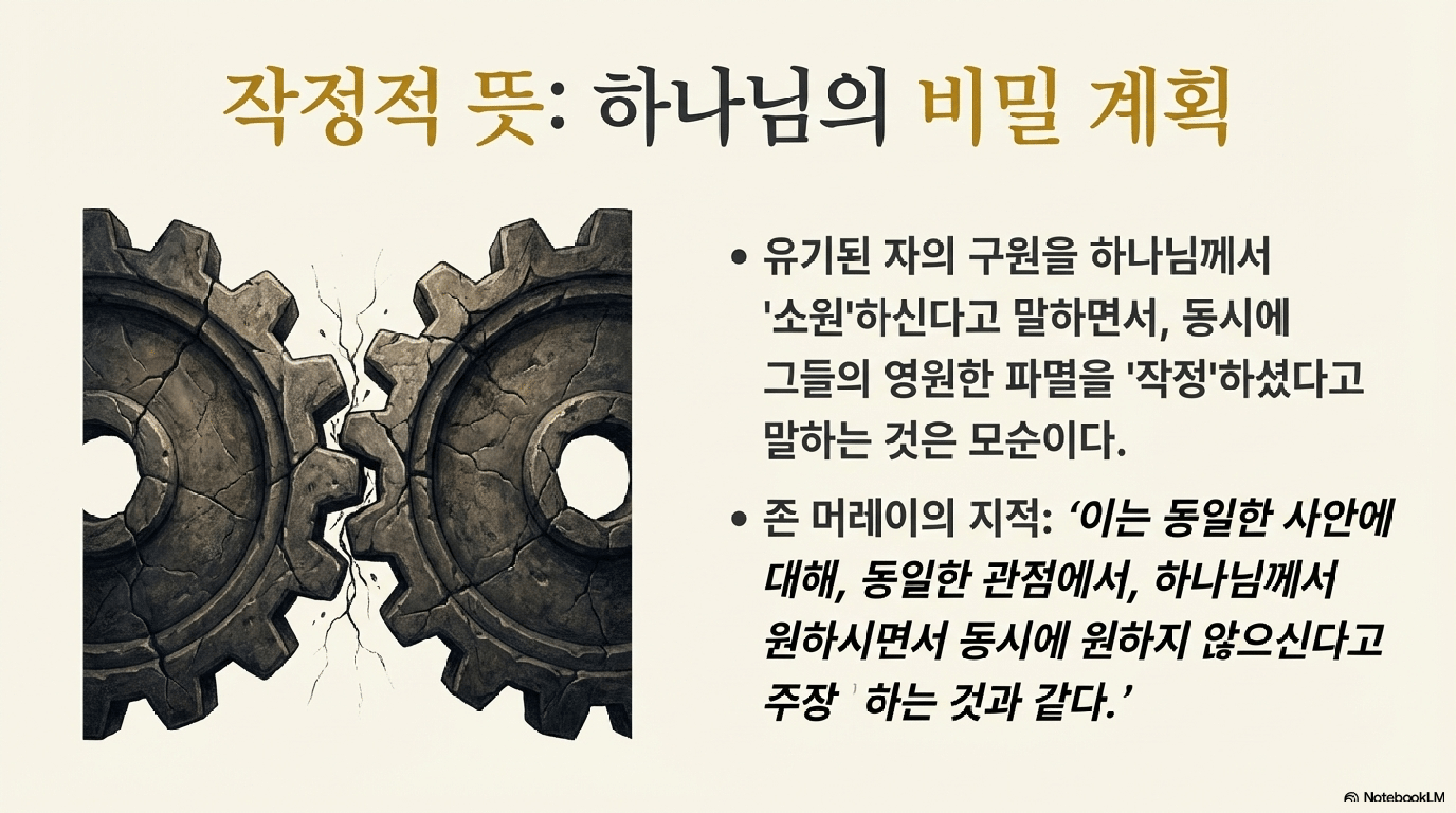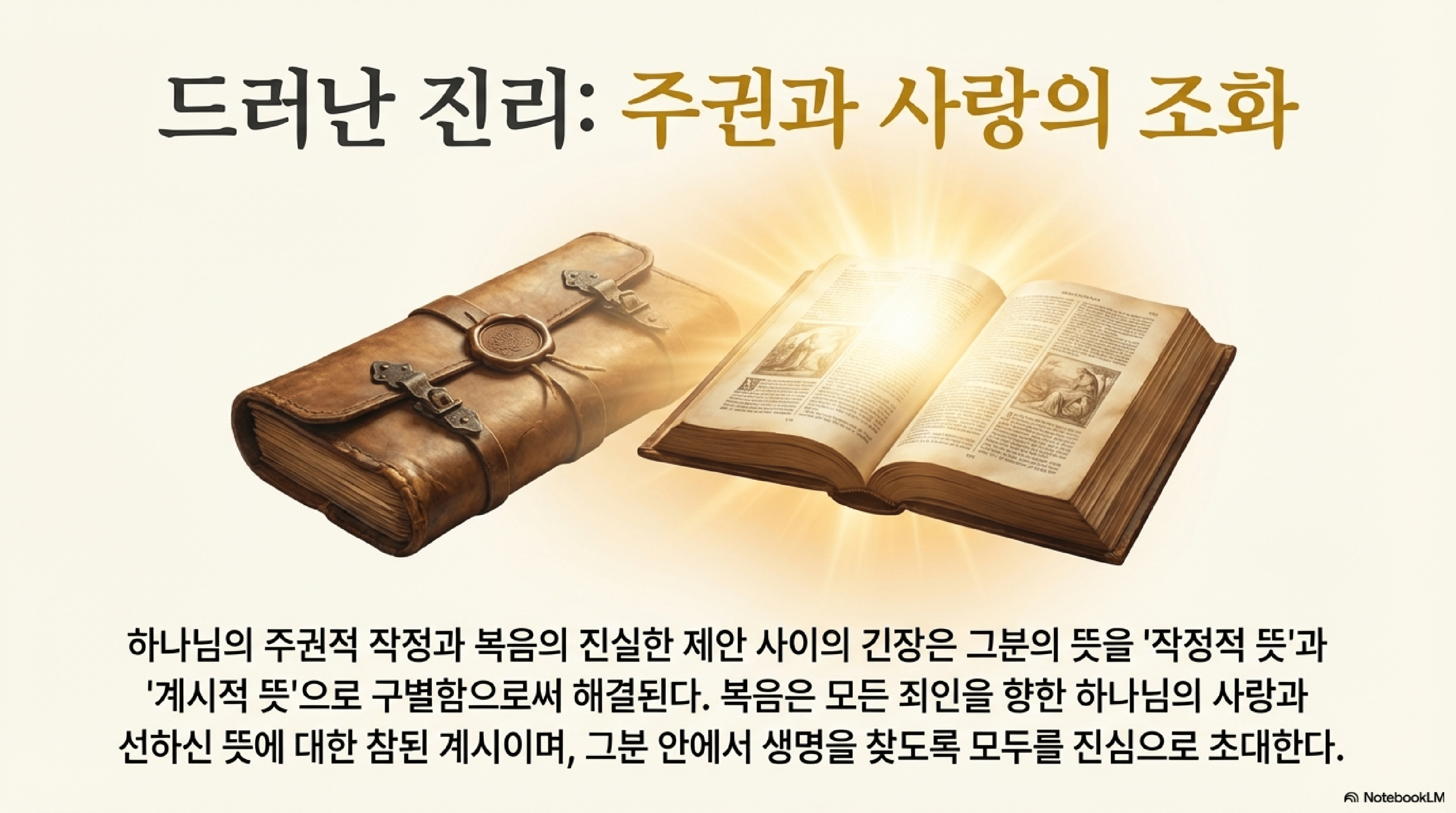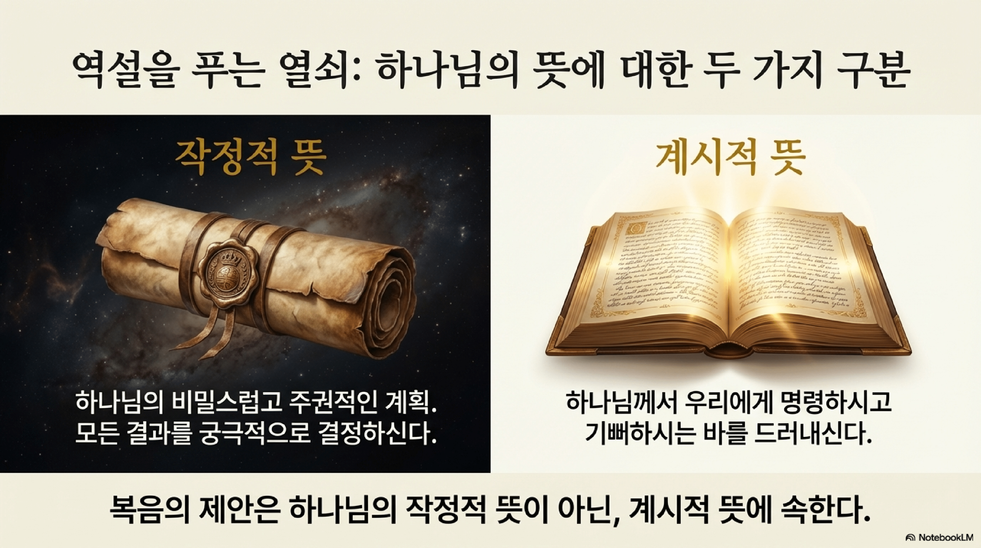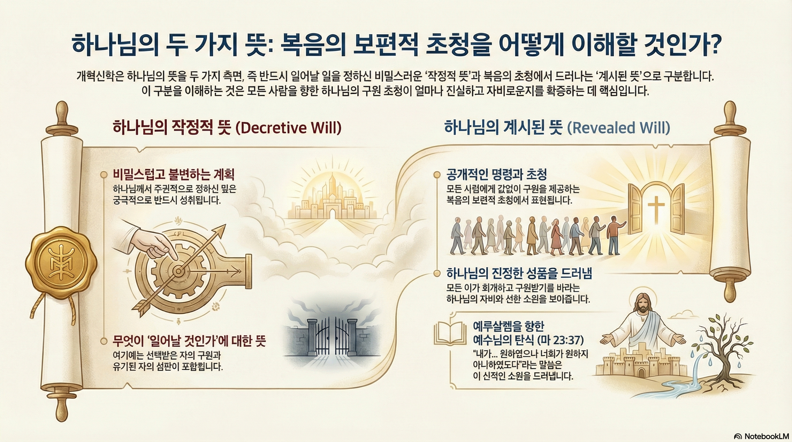 - 계시된 뜻 (Revealed Will): 성경을 통해 모든 사람에게 드러난 하나님의 명령과 초청.